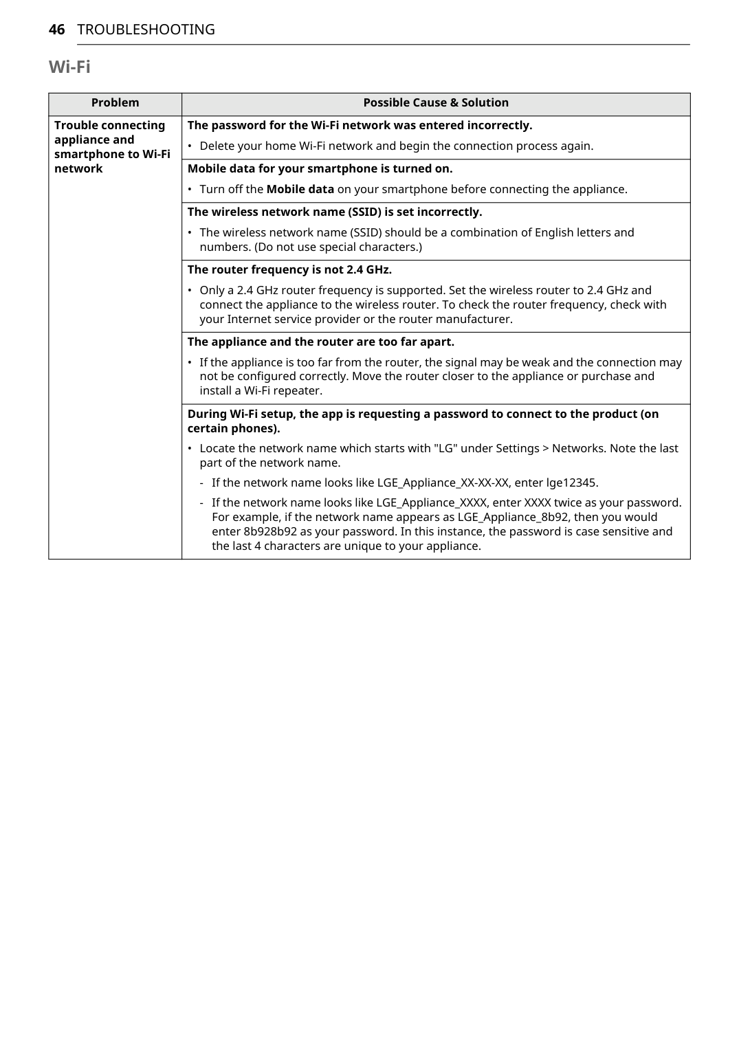Wi-Fi Problem Possible Cause & Solution Trouble connecting appliance and smartphone to Wi-Fi network The password for the Wi-Fi network was entered incorrectly.47
