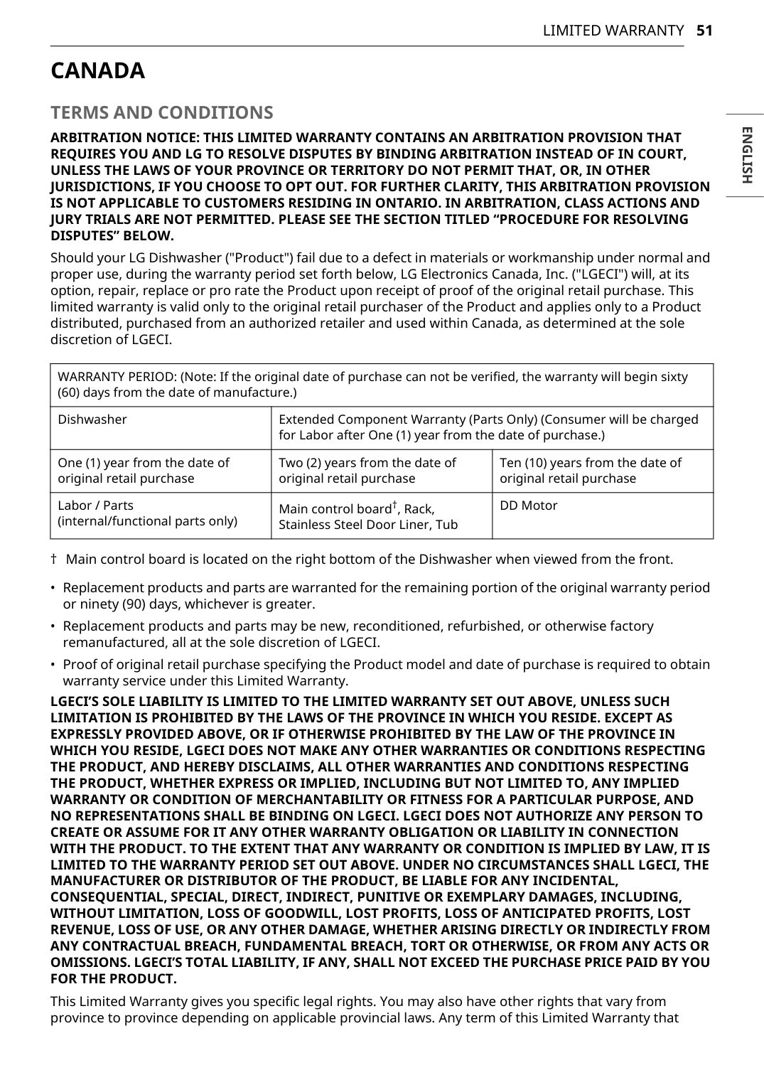 Should your LG Dishwasher ("Product") fail due to a defect in materials or workmanship under normal and proper use, during the warranty period set forth below, LG Electronics Canada, Inc. ("LGECI") will, at its option, repair, replace or pro rate the Product upon receipt of proof of the original retail purchase. This limited warranty is valid only to the original retail purchaser of the Product and applies only to a Product distributed, purchased from an authorized retailer and used within Canada, as determined at the sole discretion of LGECI. † Main control board is located on the right bottom of the Dishwasher when viewed from the front.Manufacturer Or Distributor Of The Product, Be Liable For Any Incidental,