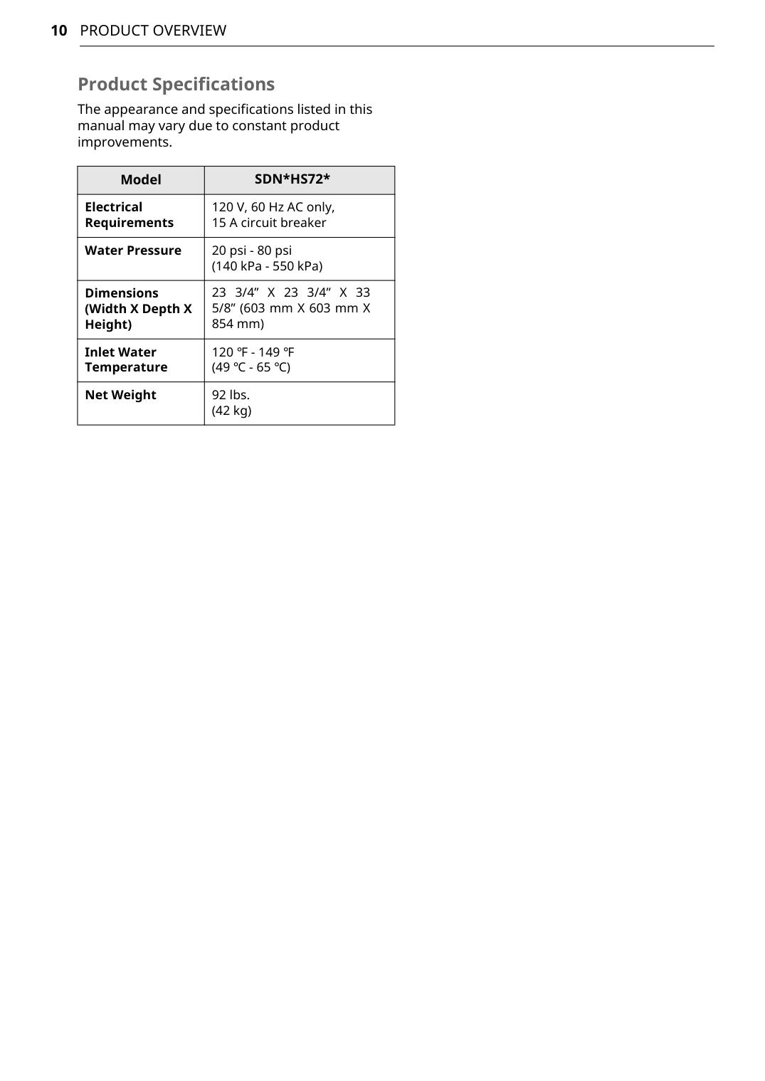 Product Specifications The appearance and specifications listed in this manual may vary due to constant product improvements. ModelSdn*Hs72*