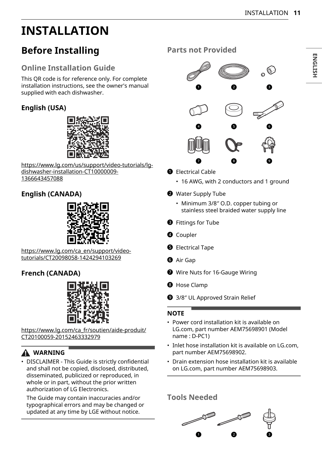Before Installing Online Installation Guide This QR code is for reference only. For complete installation instructions, see the owner's manual supplied with each dishwasher. English (USA) https://www.lg.com/us/support/video-tutorials/lg- dishwasher-installation-CT10000009- 1366643457088 English (CANADA) https://www.lg.com/ca_en/support/video- tutorials/CT20098058-1424294103269 French (CANADA) https://www.lg.com/ca_fr/soutien/aide-produit/Ct20100059-20152463332979
