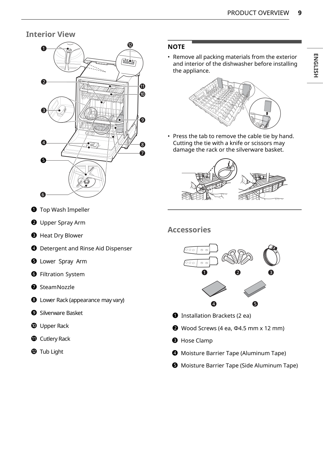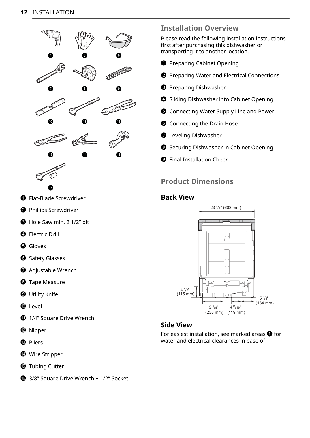 a Flat-Blade Screwdriver b Phillips Screwdriver c Hole Saw min. 2 1/2” bit d Electric Drill e Gloves f Safety Glasses g Adjustable Wrench h Tape Measure i Utility Knife j Level k 1/4” Square Drive Wrench l Nipper m Pliers n Wire Stripper o Tubing Cutter p 3/8” Square Drive Wrench + 1/2” Socket Installation Overview Please read the following installation instructions first after purchasing this dishwasher or transporting it to another location. a Preparing Cabinet Opening b Preparing Water and Electrical Connections c Preparing Dishwasher d Sliding Dishwasher into Cabinet Opening e Connecting Water Supply Line and Power f Connecting the Drain Hose g Leveling Dishwasher h Securing Dishwasher in Cabinet Opening i Final Installation Check Product Dimensions Back View Side View For easiest installation, see marked areas a for water and electrical clearances in base of d e f g h i k l j m n o p 23 /4" (603 mm) 3 9 /8" (238 mm) 3 4 /16" (119 mm) 5 /4" (134 mm) 11 1 4 /2" (115 mm) 113