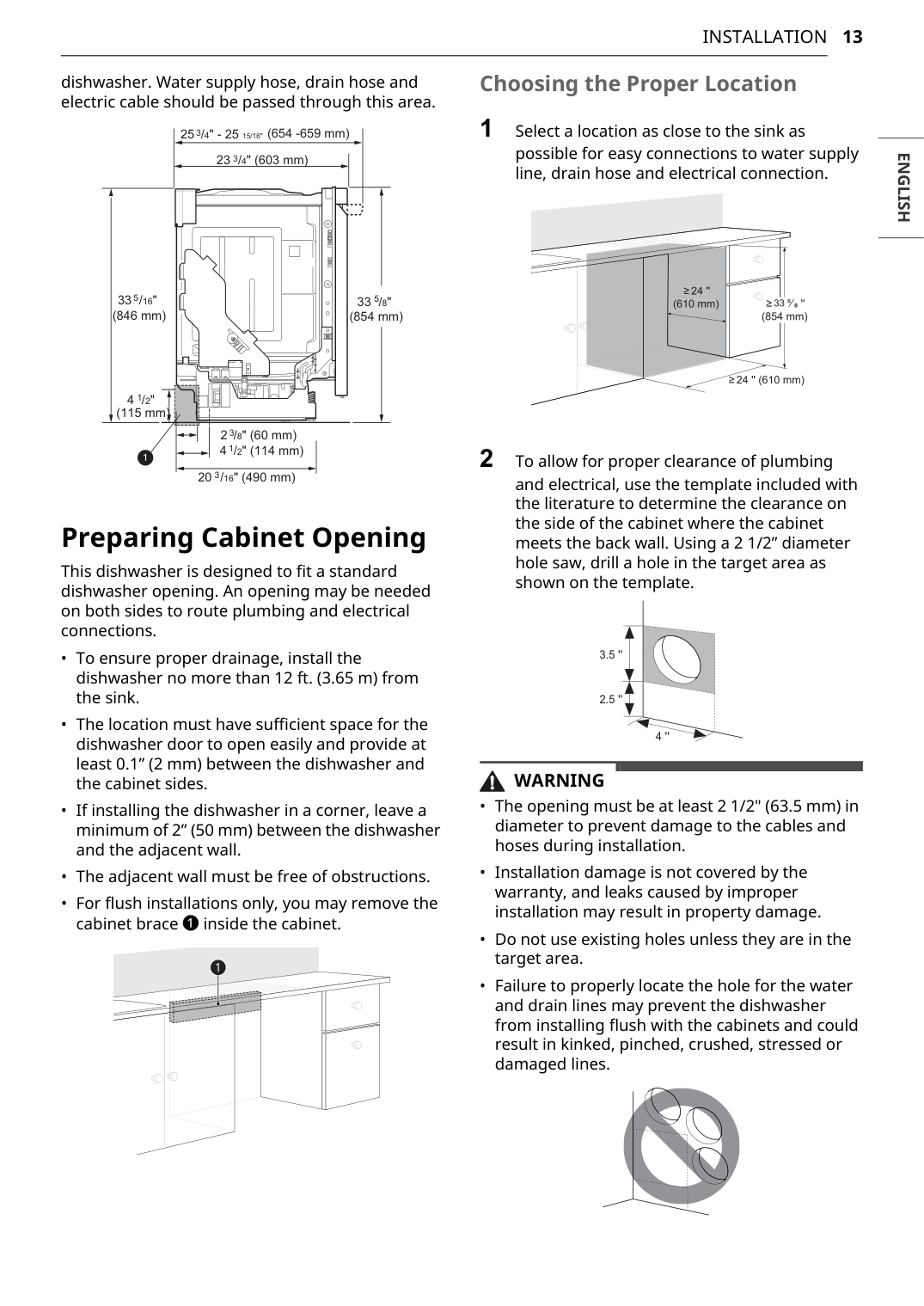 dishwasher. Water supply hose, drain hose and electric cable should be passed through this area. Preparing Cabinet Opening This dishwasher is designed to fit a standard dishwasher opening. An opening may be needed on both sides to route plumbing and electrical connections.Warning