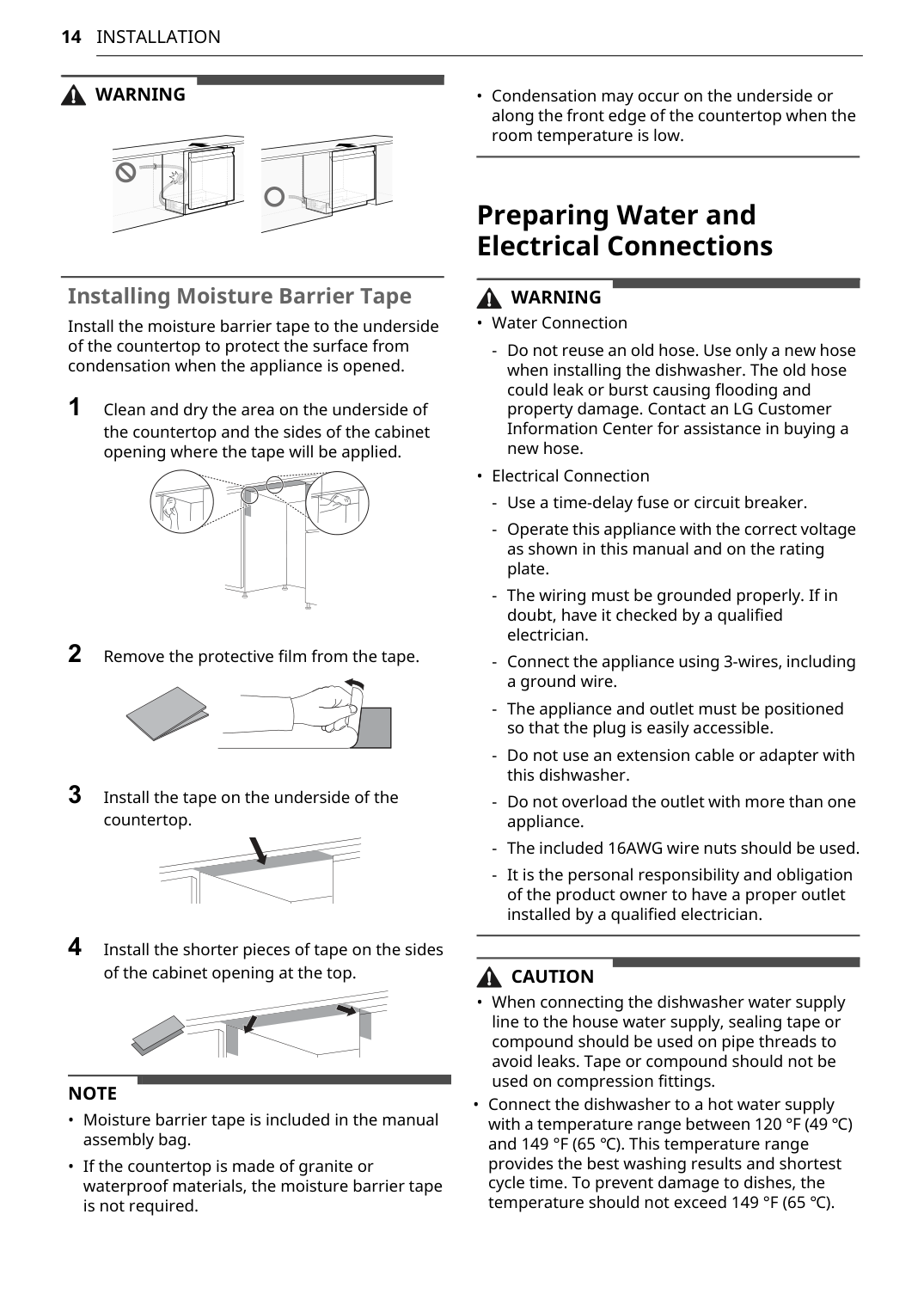 Installing Moisture Barrier Tape Install the moisture barrier tape to the underside of the countertop to protect the surface from condensation when the appliance is opened. 1 Clean and dry the area on the underside of the countertop and the sides of the cabinet opening where the tape will be applied. 2 Remove the protective film from the tape. 3 Install the tape on the underside of the countertop. 4 Install the shorter pieces of tape on the sides of the cabinet opening at the top.Note