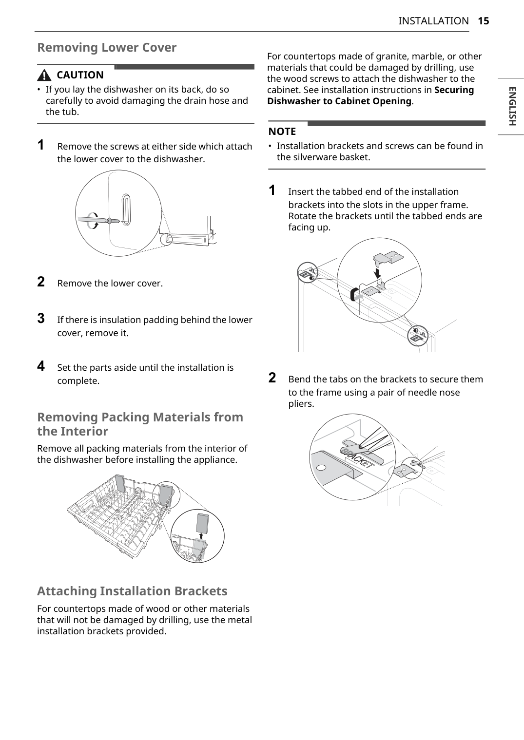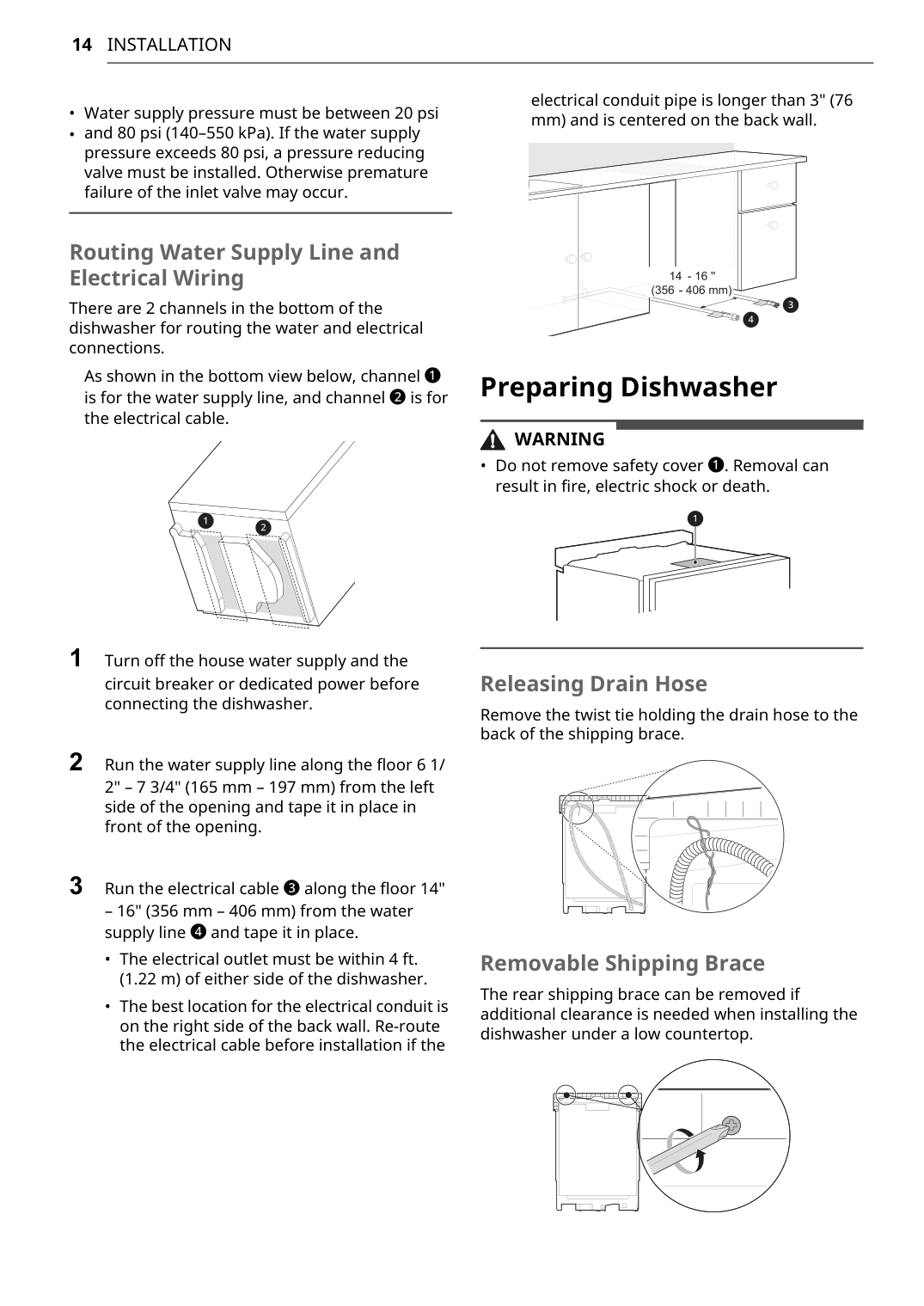 11 Before Installing 13 Preparing Cabinet Opening 14 Preparing Water and Electrical Connections 15 Preparing Dishwasher 16 Sliding Dishwasher into Cabinet Opening 17 Connecting Water Supply Line and Power 19 Connecting the Drain Hose 21 Leveling Dishwasher 22 Securing Dishwasher in Cabinet Opening 23 Final Installation Check25 Operation