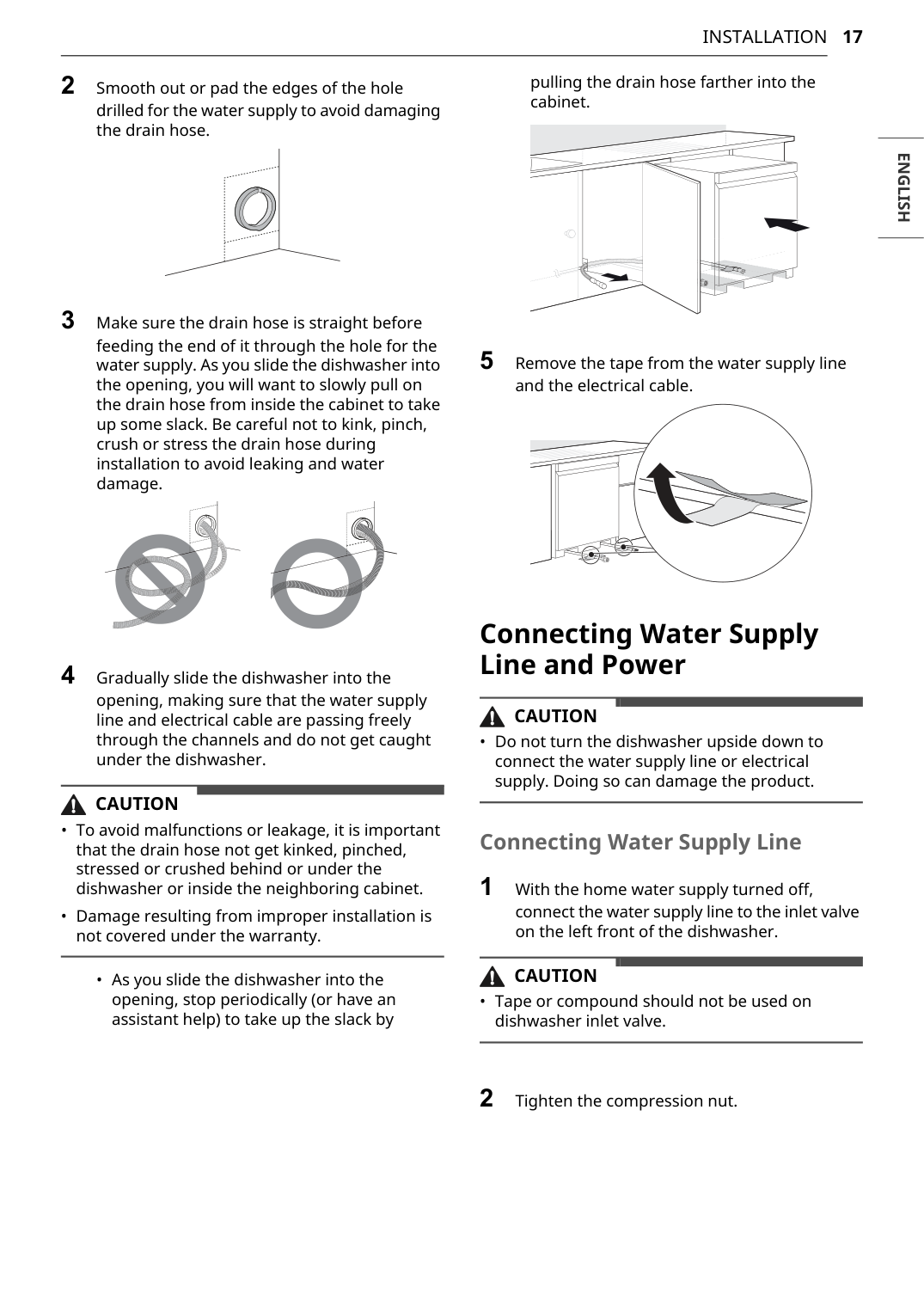 2 Smooth out or pad the edges of the hole drilled for the water supply to avoid damaging the drain hose. 3 Make sure the drain hose is straight before feeding the end of it through the hole for the water supply. As you slide the dishwasher into the opening, you will want to slowly pull on the drain hose from inside the cabinet to take up some slack. Be careful not to kink, pinch, crush or stress the drain hose during installation to avoid leaking and water damage. 4 Gradually slide the dishwasher into the opening, making sure that the water supply line and electrical cable are passing freely through the channels and do not get caught under the dishwasher.Caution