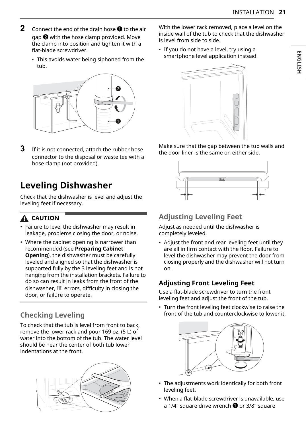 To check leveling, remove the lower rack and pour 169 oz (5 L) of water into the bottom of the tub—the water level should be near the center of both tub lower indentations at the front. Adjust the front leveling feet using a flat-blade screwdriver (turn clockwise to raise, counterclockwise to lower) and the rear leveling foot using a Phillips screwdriver at the center screw at the base. Proper leveling is critical to prevent leakage, door closure problems, and noise. (Page 21-22)