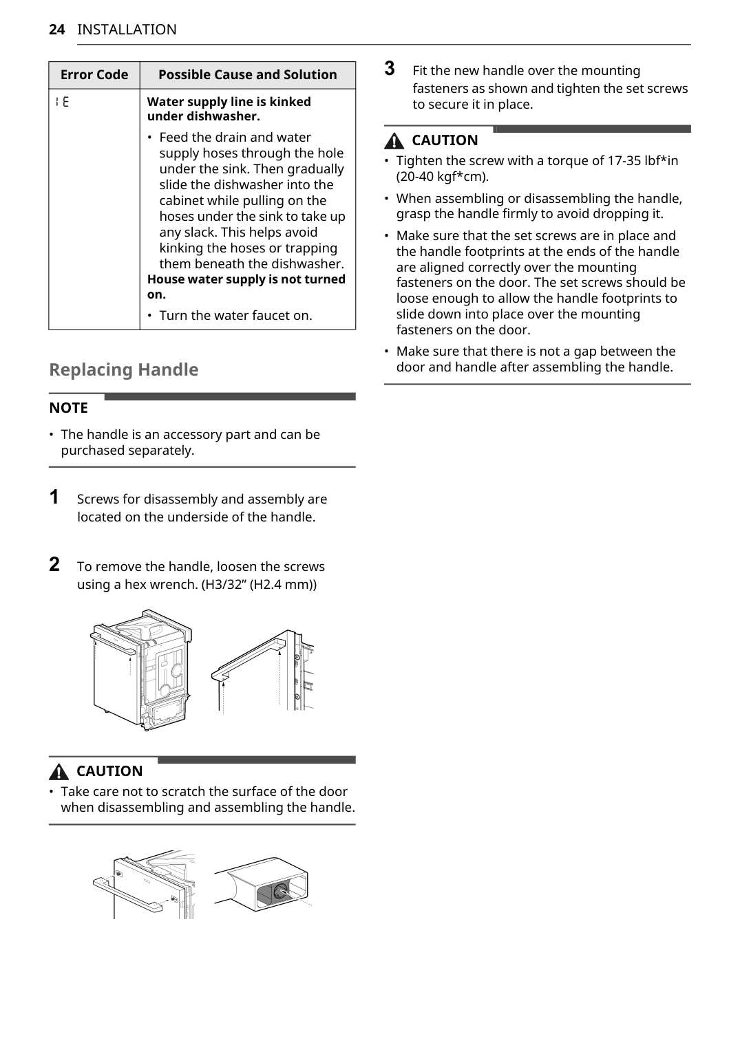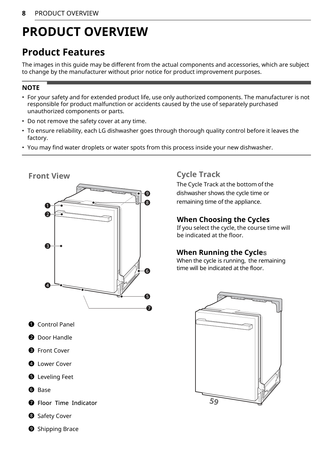 Warranty Exceptions Poor wash results caused by debris remaining in the filter. Clean the filter regularly. Poor wash results caused by improper loading or over stacking: wash arm won't rotate or soap dispenser is held closed. Make certain that no dishes or utensils are in the path of the spray arms. Do not place one dish on top of another. Poor drying results caused by lack of rinse aid. Use rinse aid or combination detergent. Water is not supplied because the water tap is not turned on. IE error Check and turn on the water tap. Water is not supplied because the inlet hose is kinked. IE error Reinstall the inlet hose. Not draining because drain hose is kinked. OE error Reinstall the drain hose. The knockout plug in the garbage disposal is not removed. OE error Remove the plug on the disposal. The disposal or air gap is blocked by debris. OE error Clean the disposal or the air gap. Inlet valve and drain hose connection problem caused by improper installation. External leakage Reinstall the hose. Door movement or closing compromised by incorrect leveling. Adjust the lower front leveling feet to the required height. No power due to loose connection of power supply line or electrical outlet problem. Reconnect the power supply line or repair the electrical outlet.56