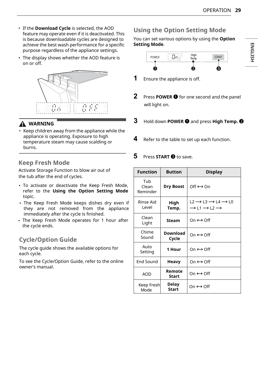 Cycle/Option Guide The cycle guide shows the available options for each cycle. To see the Cycle/Option Guide, refer to the online owner's manual. Using the Option Setting Mode You can set various options by using the Option Setting Mode. 1 Ensure the appliance is off. 2 Press POWER a for one second and the panel will light on. 4 Refer to the table to set up each function. 5 Press START c to save. Function Button Display Tub Clean Reminder Off & On Rinse Aid Level Dry BoostL2 ~ L3 ~ L4 ~ L0