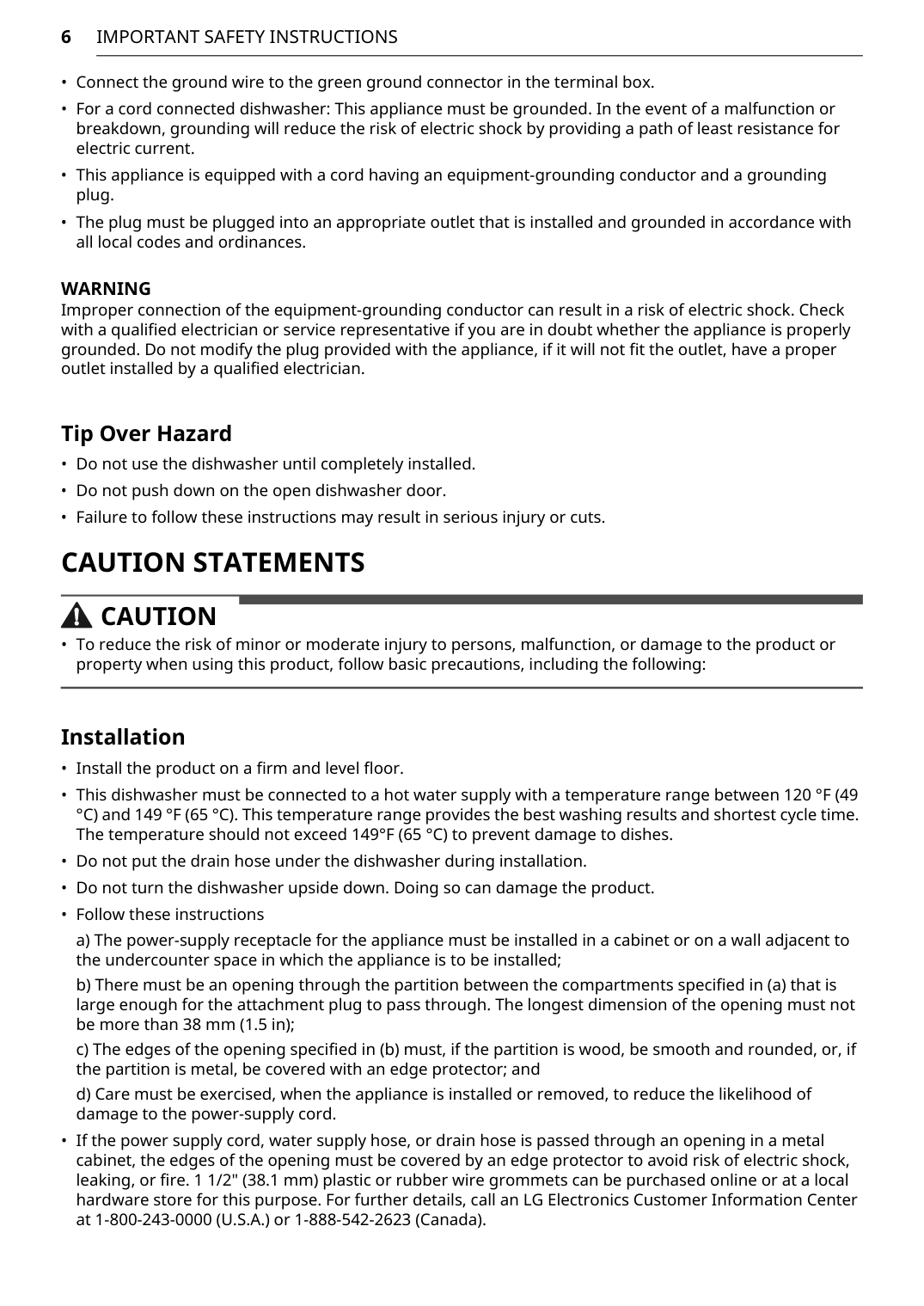 Pick-up, electrical wiring, plumbing. Installation You will be charged for the installation.LG Customer Information Center Register your product Online! www.lg.com For inquiries or comments, visit www.lg.com or call: