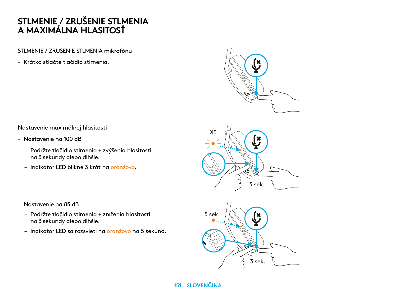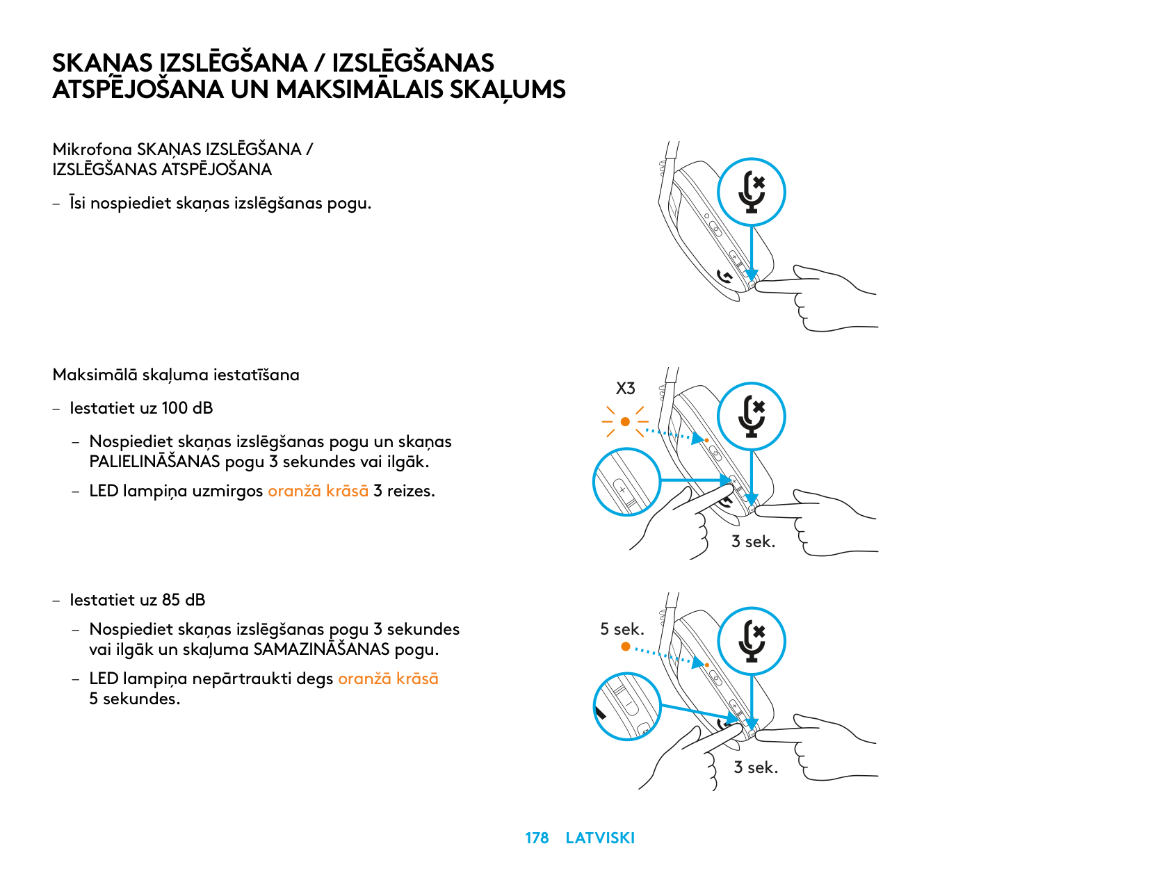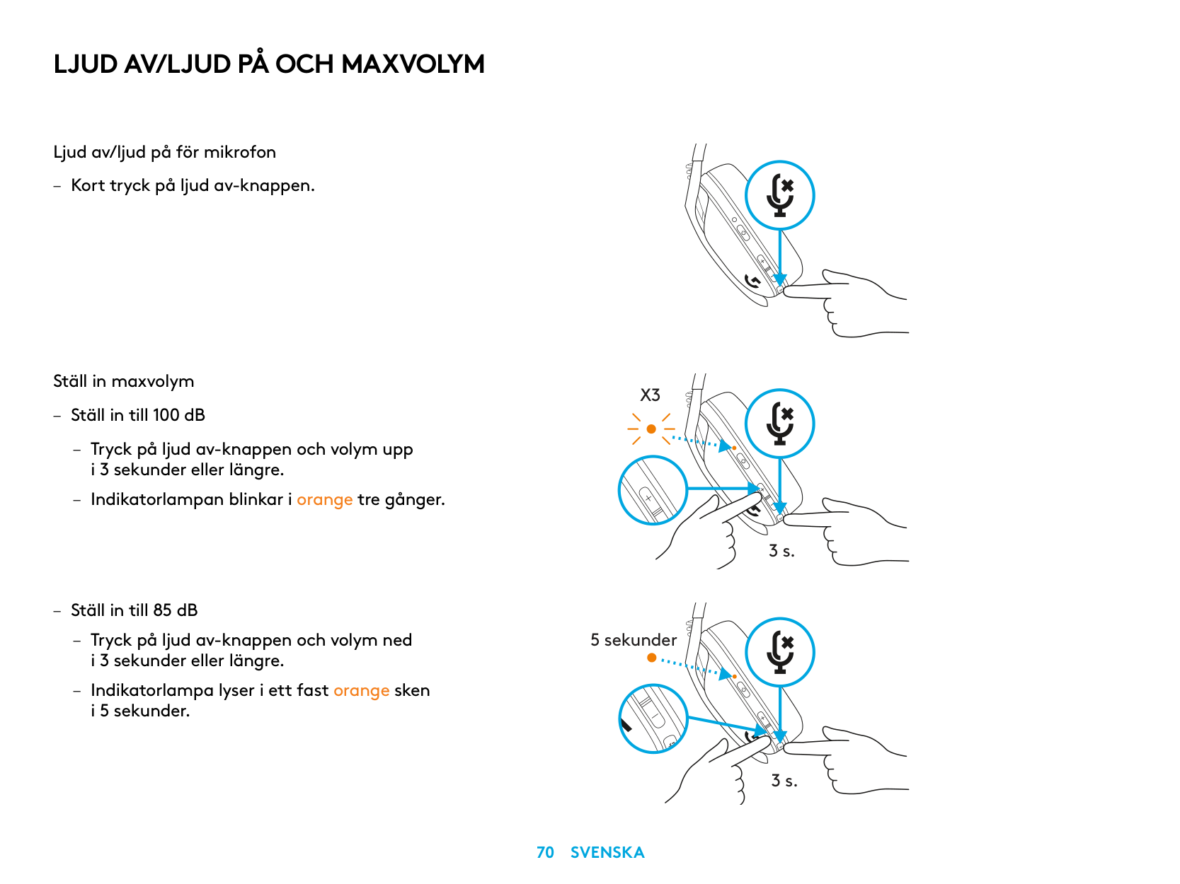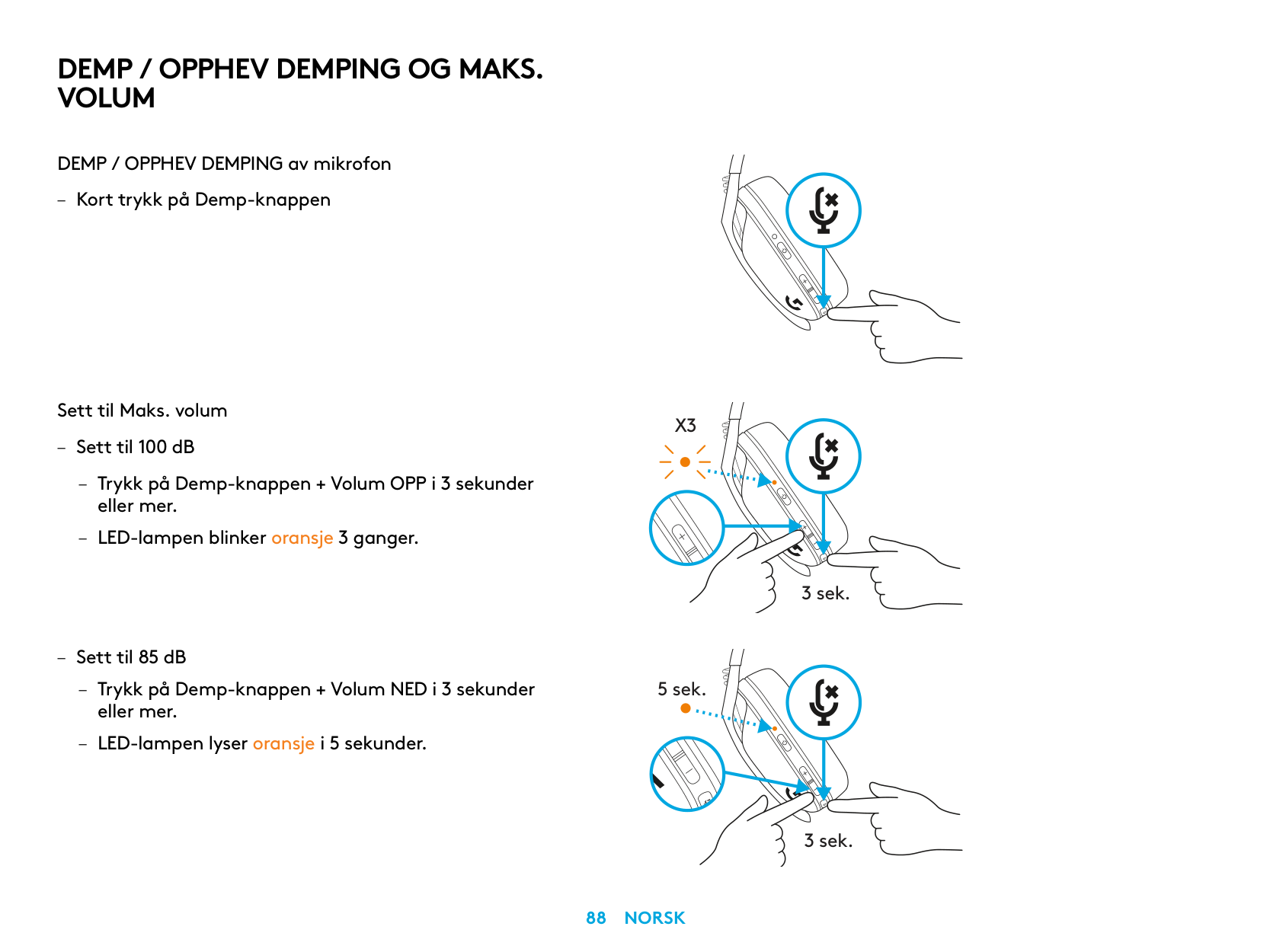 MUTE / UNMUTE microphone – Short press on the Mute button. Set Max Volume – Set to 100 dB – Press 3 seconds or longer Mute button + Volume UP. – LED will flash orange 3 times. – Set to 85 dB – Press 3 seconds or longer Mute button + Volume DOWN. – LED will turn solid orange for 5 seconds.X3