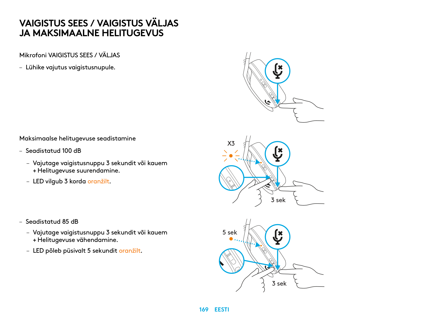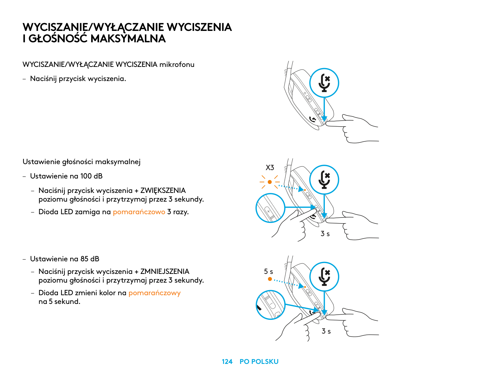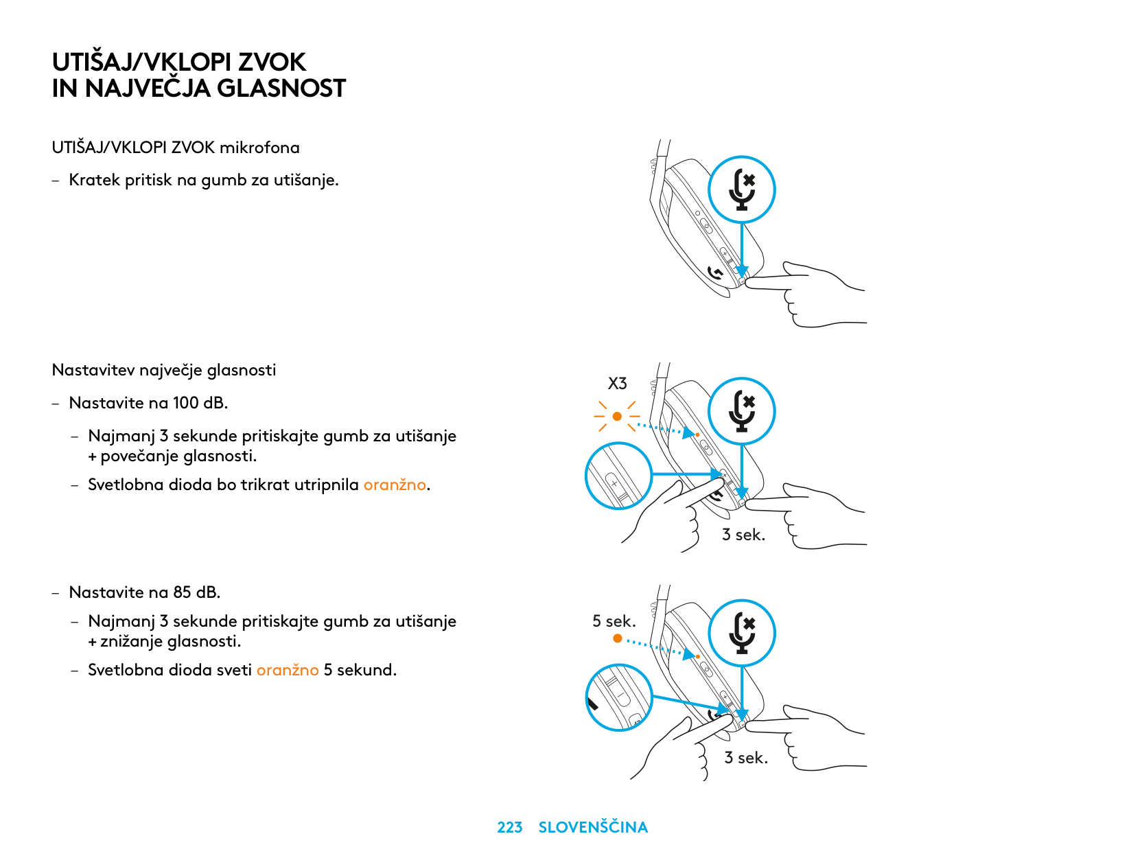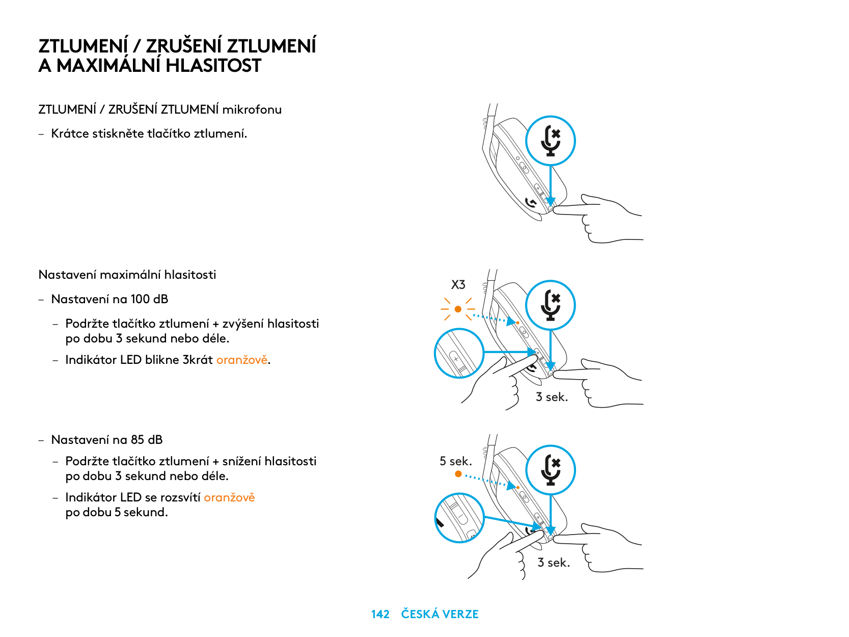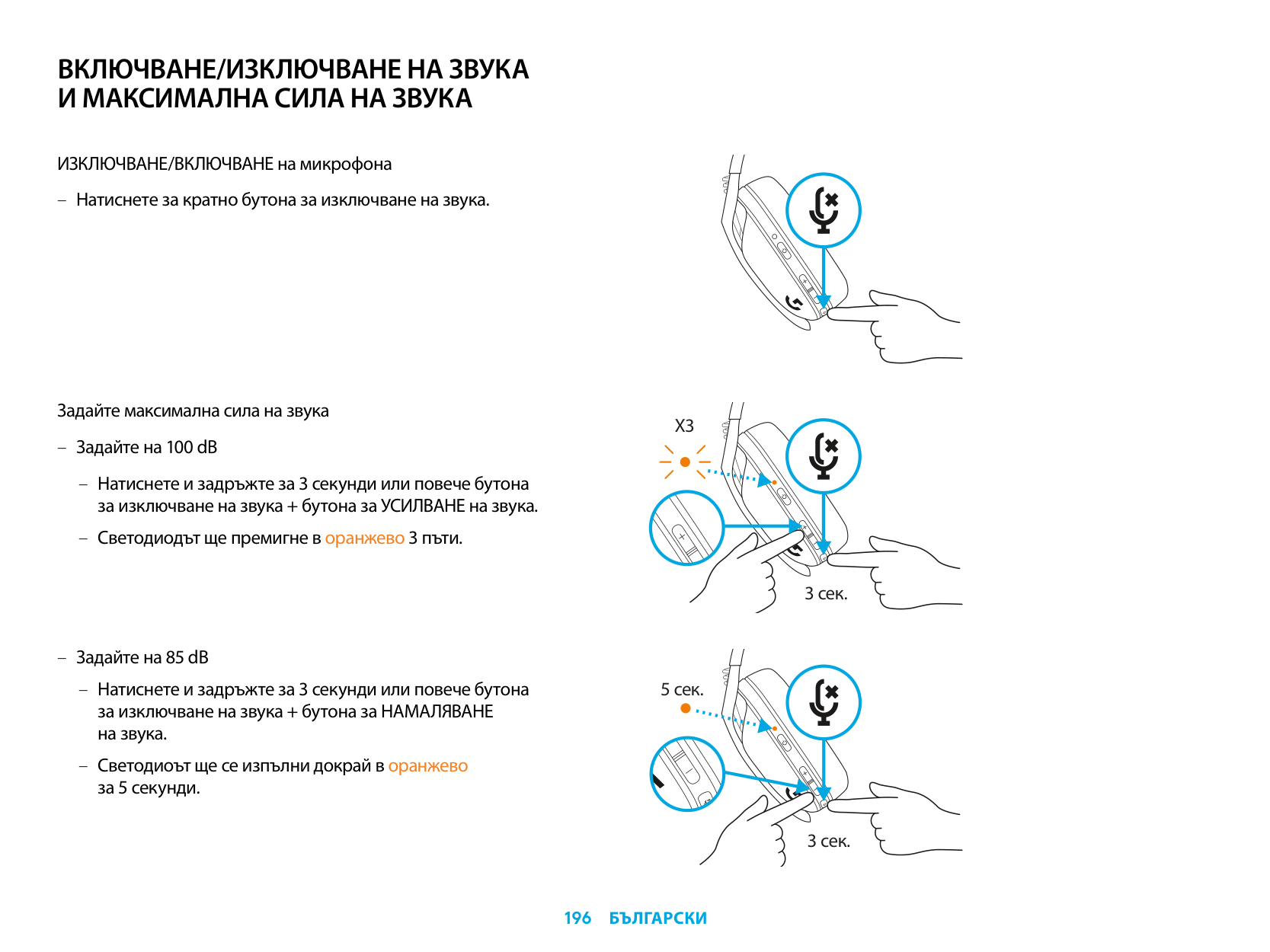 MUTE / UNMUTE microphone – Short press on the Mute button. Set Max Volume – Set to 100 dB – Press 3 seconds or longer Mute button + Volume UP. – LED will flash orange 3 times. – Set to 85 dB – Press 3 seconds or longer Mute button + Volume DOWN. – LED will turn solid orange for 5 seconds.X3