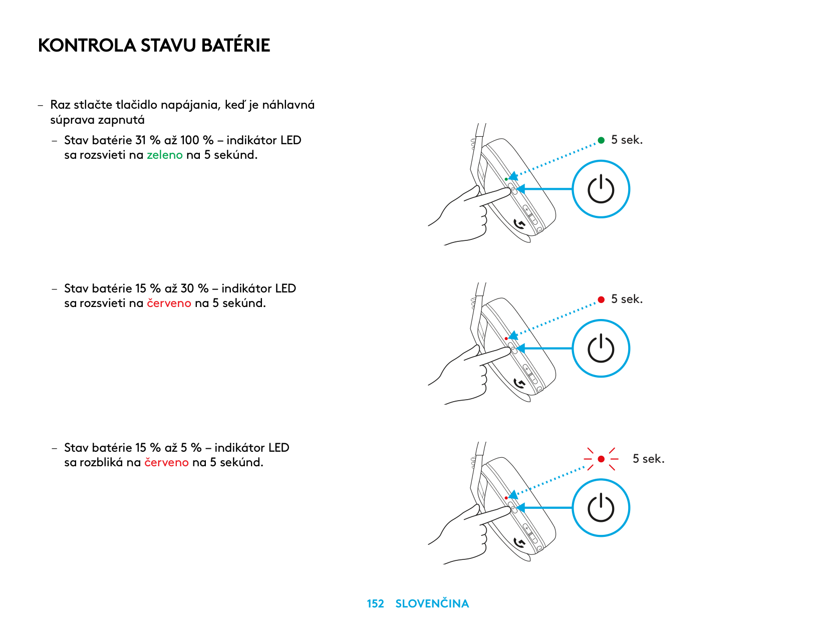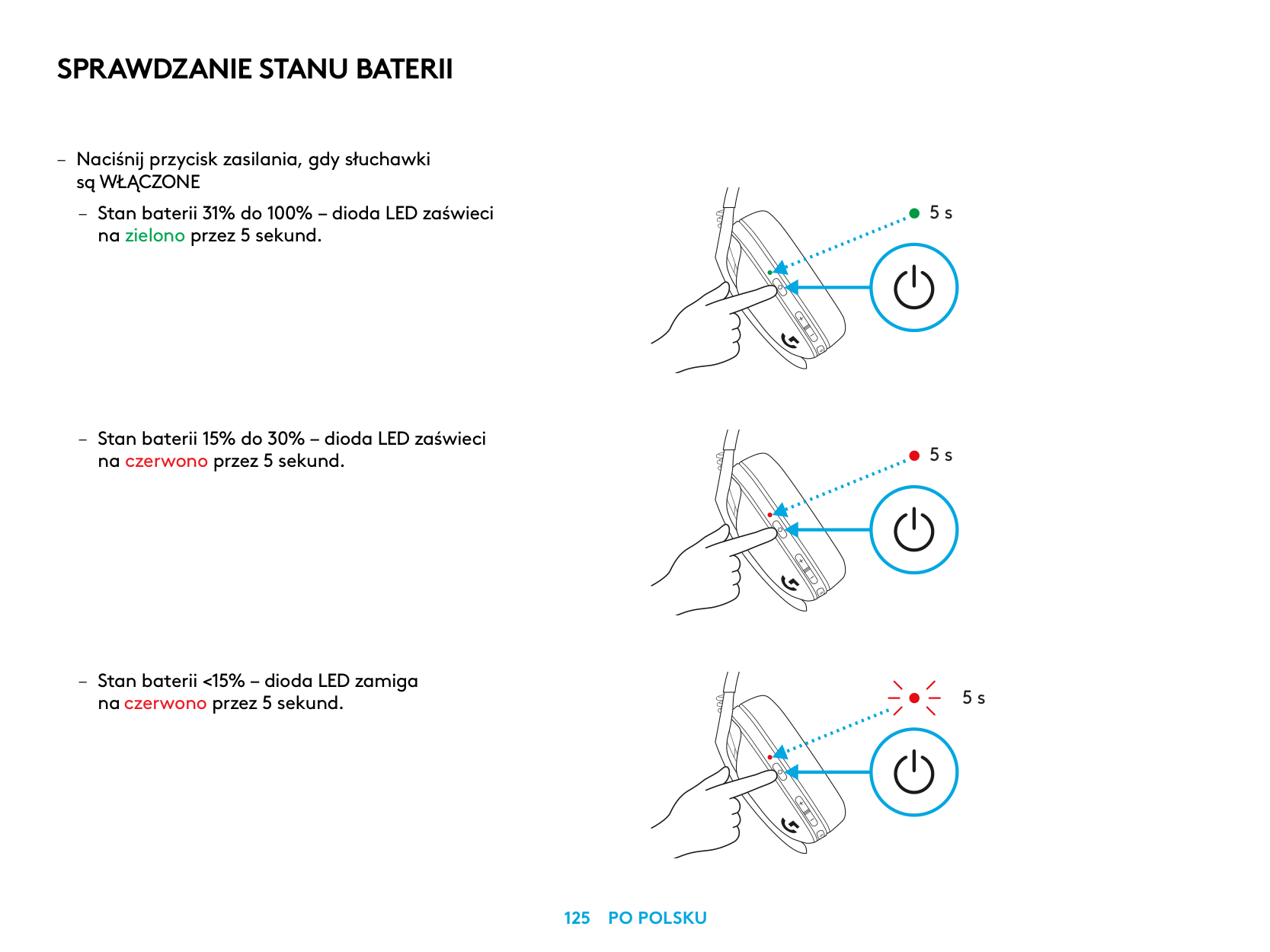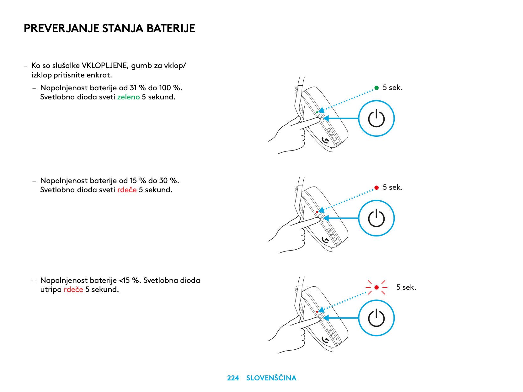 – Apăsaţi o singură dată pe butonul de alimentare când căştile sunt pornite. – Bateria la 31% – 100%: LED-ul se va aprinde în verde timp de 5 secunde.Verificarea Bateriei