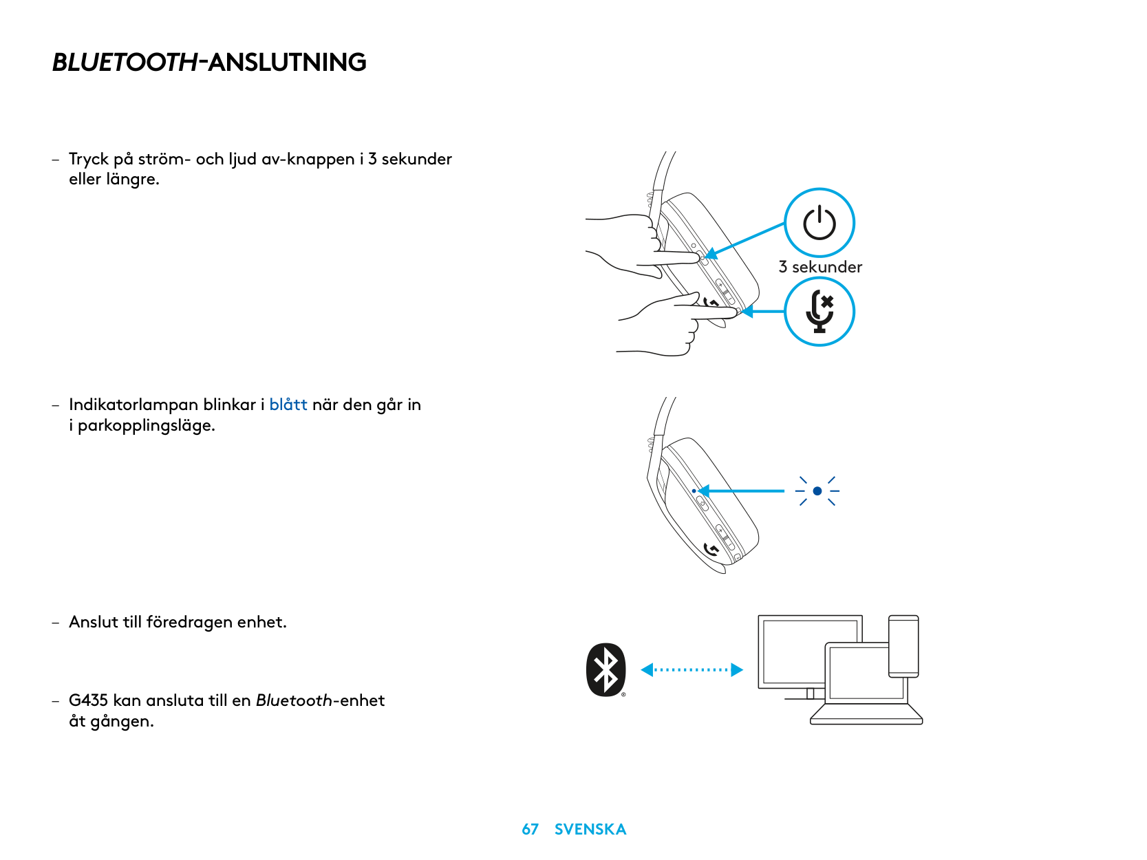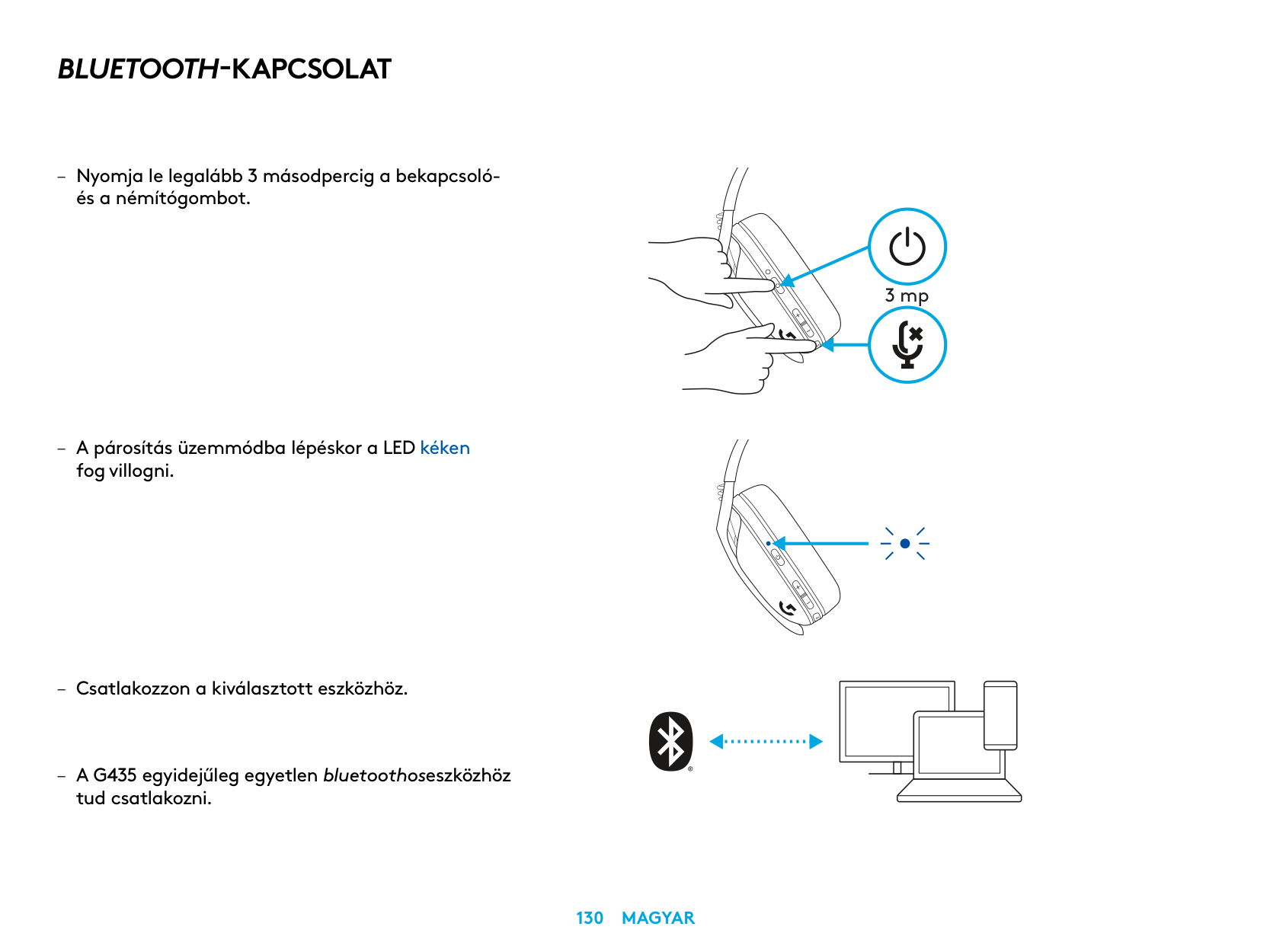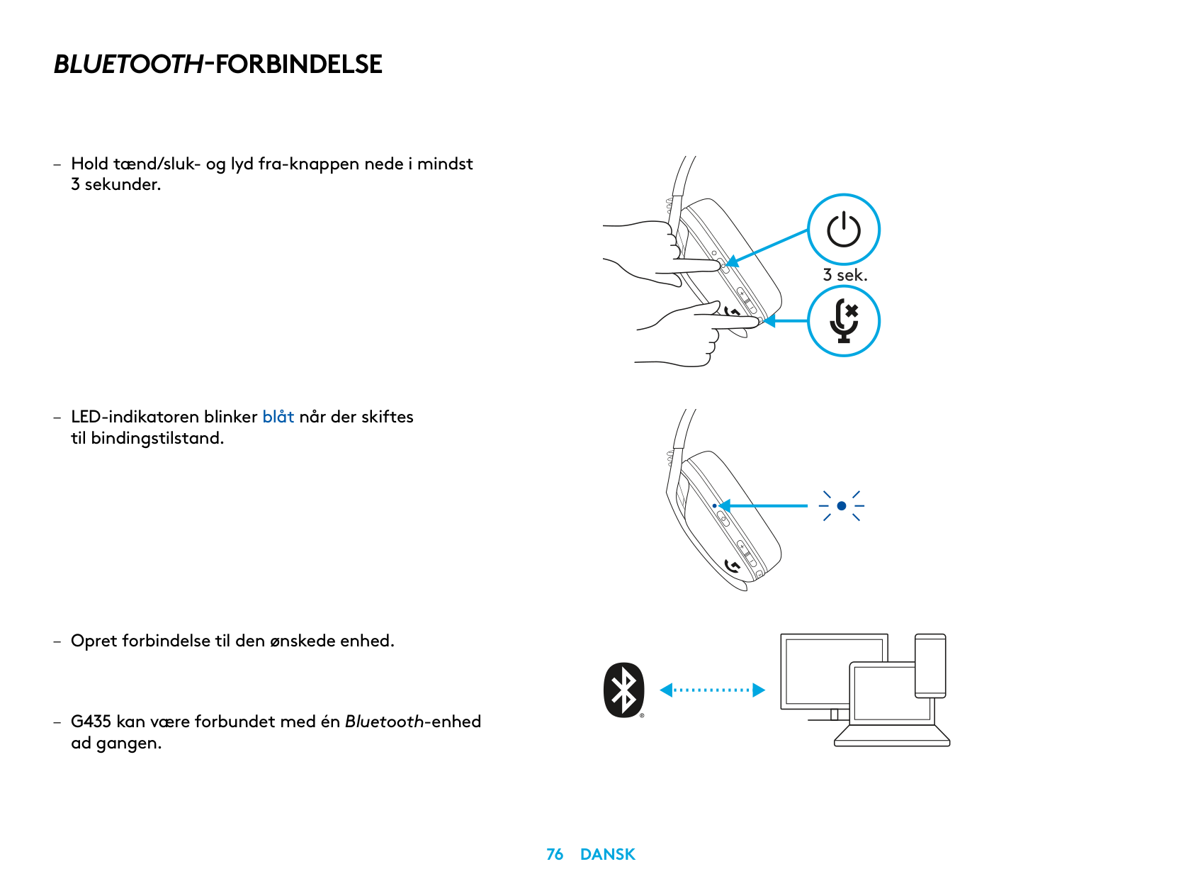 – Press 3 seconds or longer of the Power and Mute button. – LED will flash blue as it enters pairing mode. 3 sec. – Connect to your preferred device. – G435 can connect to a single bluetooth device at a time.5 English