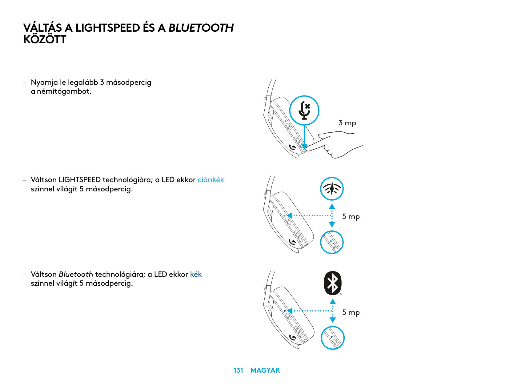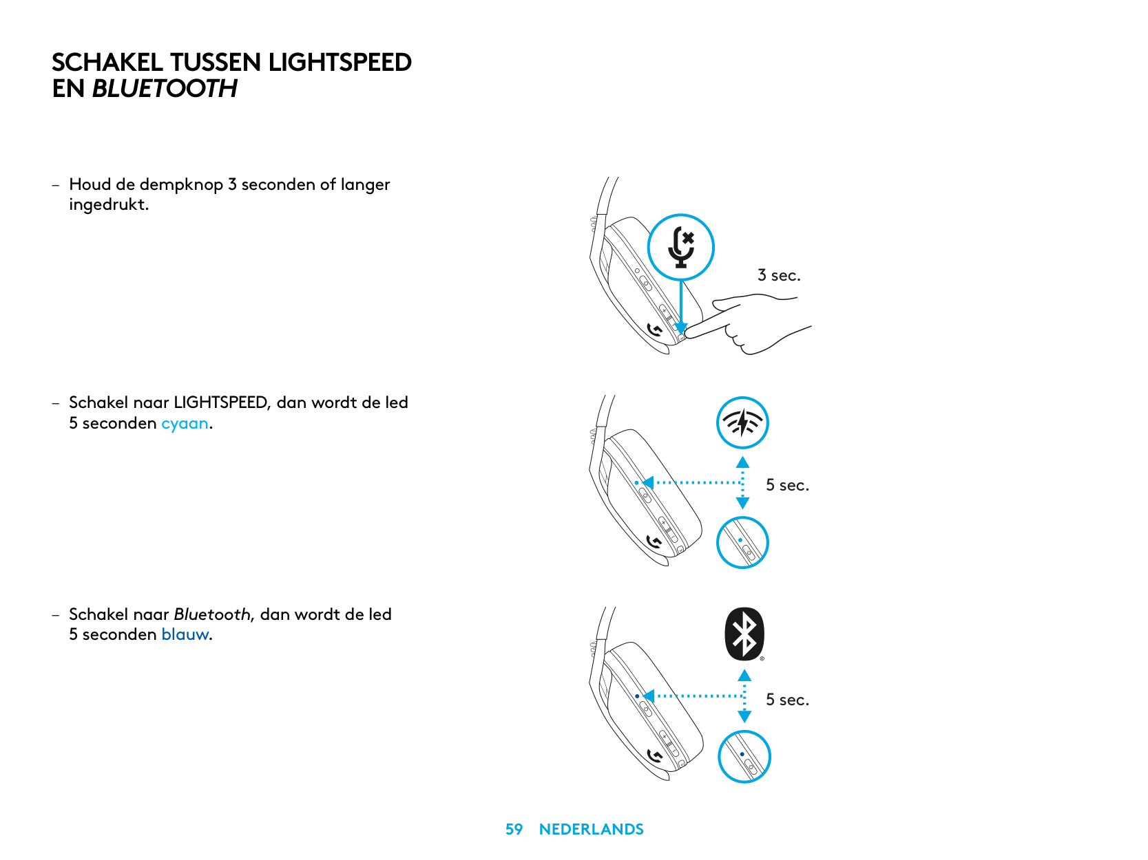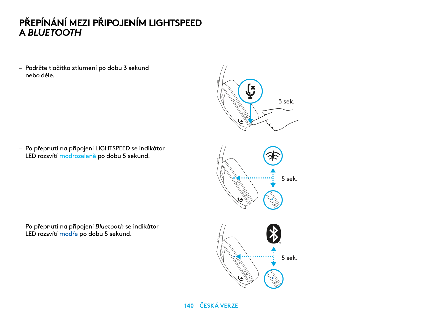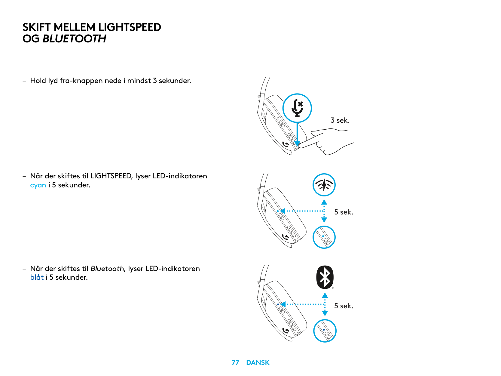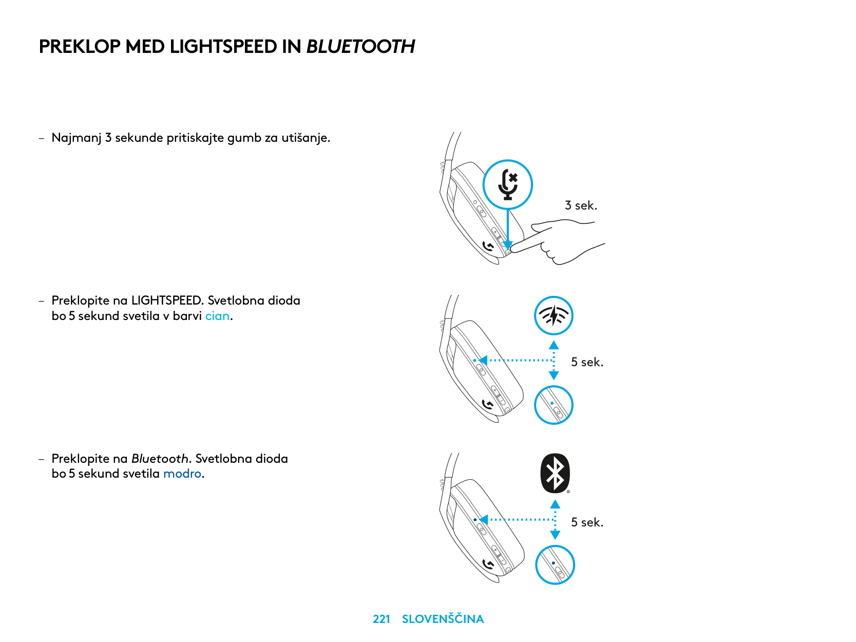 5 sec. 5 sec. – Press 3 seconds or longer of the Mute button. – Switch to LIGHTSPEED, LED will light cyan for 5 seconds. – Switch to Bluetooth, LED will light blue for 5 seconds. 3 sec.Switch Between Lightspeed