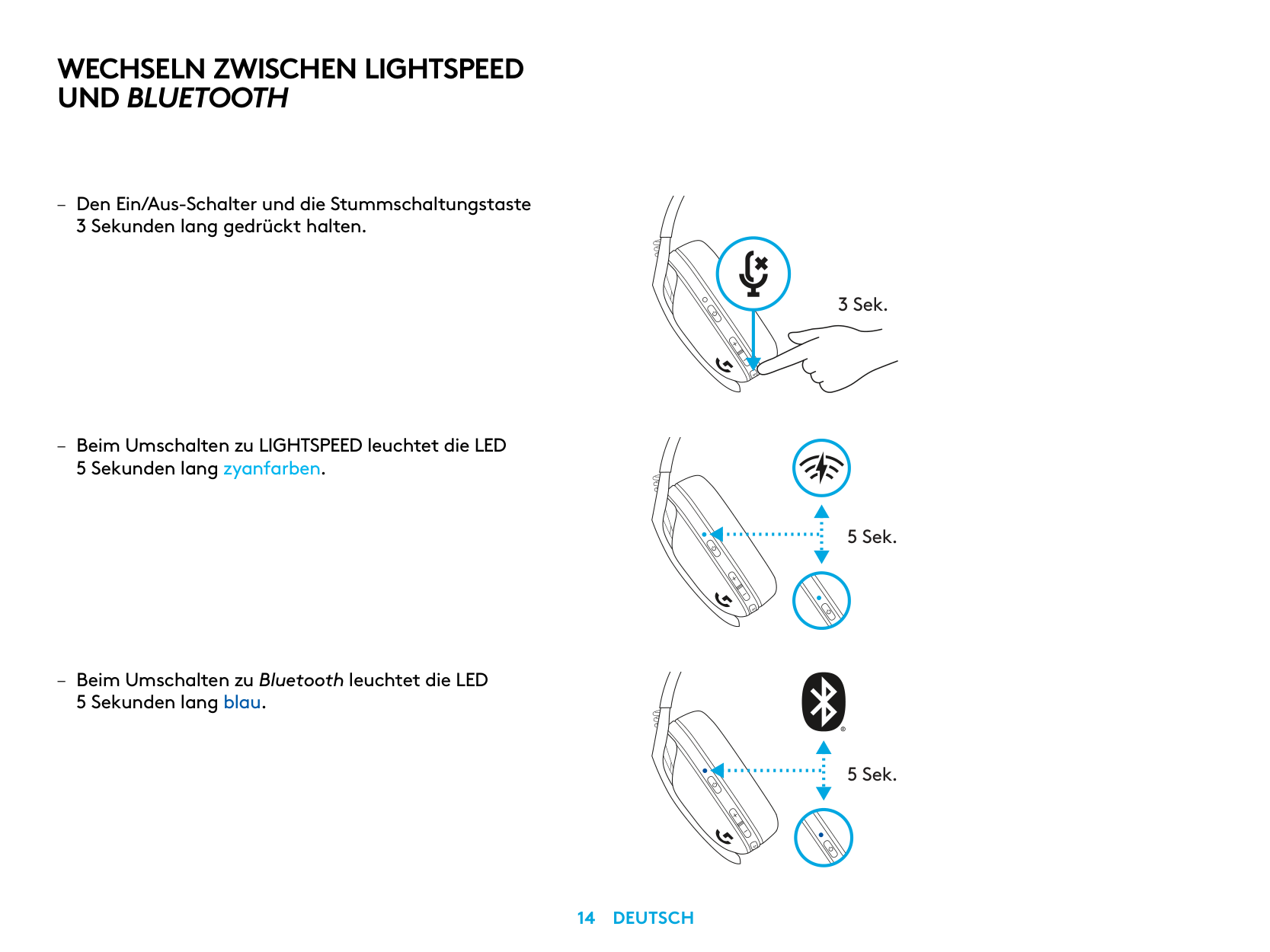 5 Sek. 5 Sek. – Den Ein/Aus-Schalter und die Stummschaltungstaste 3 Sekunden lang gedrückt halten. – Beim Umschalten zu LIGHTSPEED leuchtet die LED 5 Sekunden lang zyanfarben. – Beim Umschalten zu Bluetooth leuchtet die LED 5 Sekunden lang blau. 3 Sek.Wechseln Zwischen Lightspeed