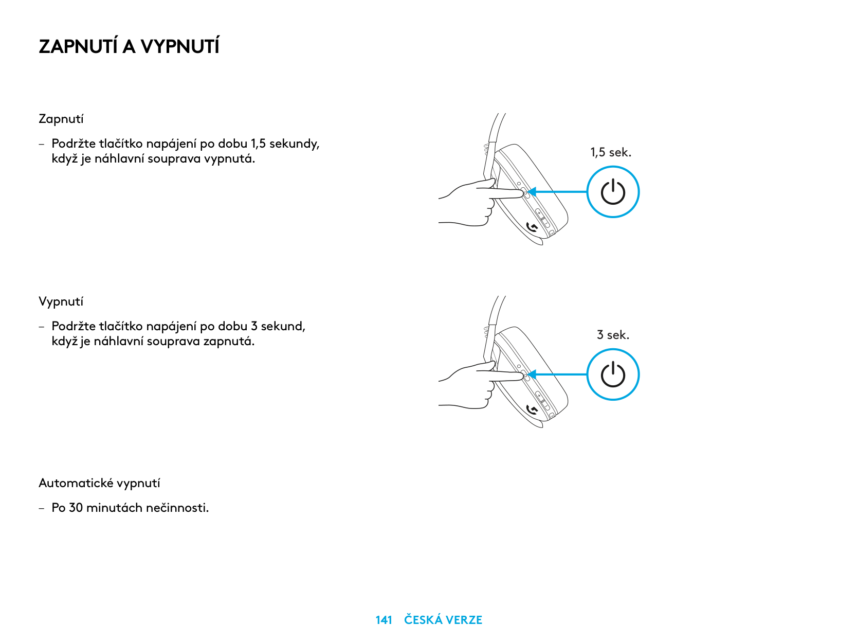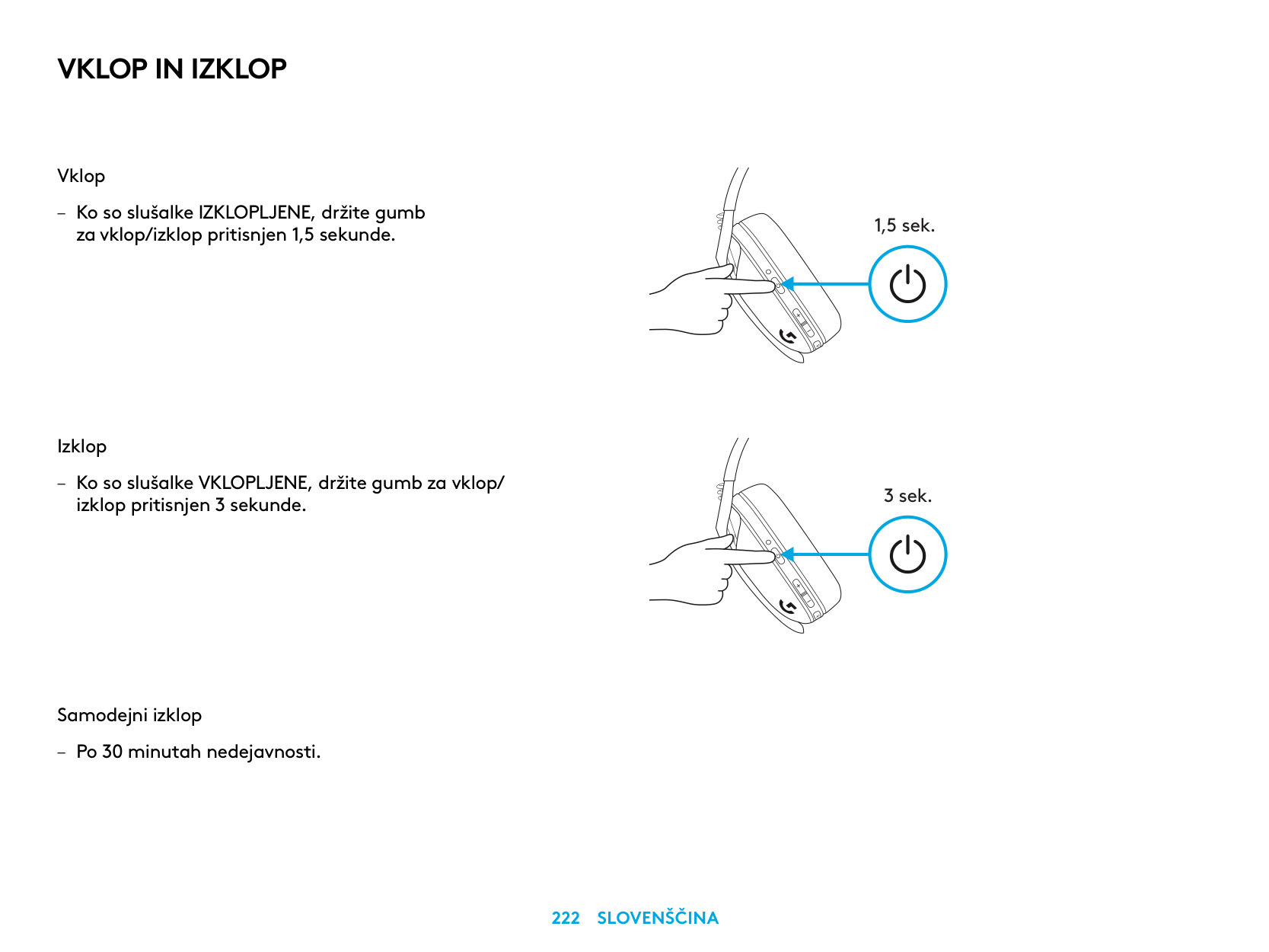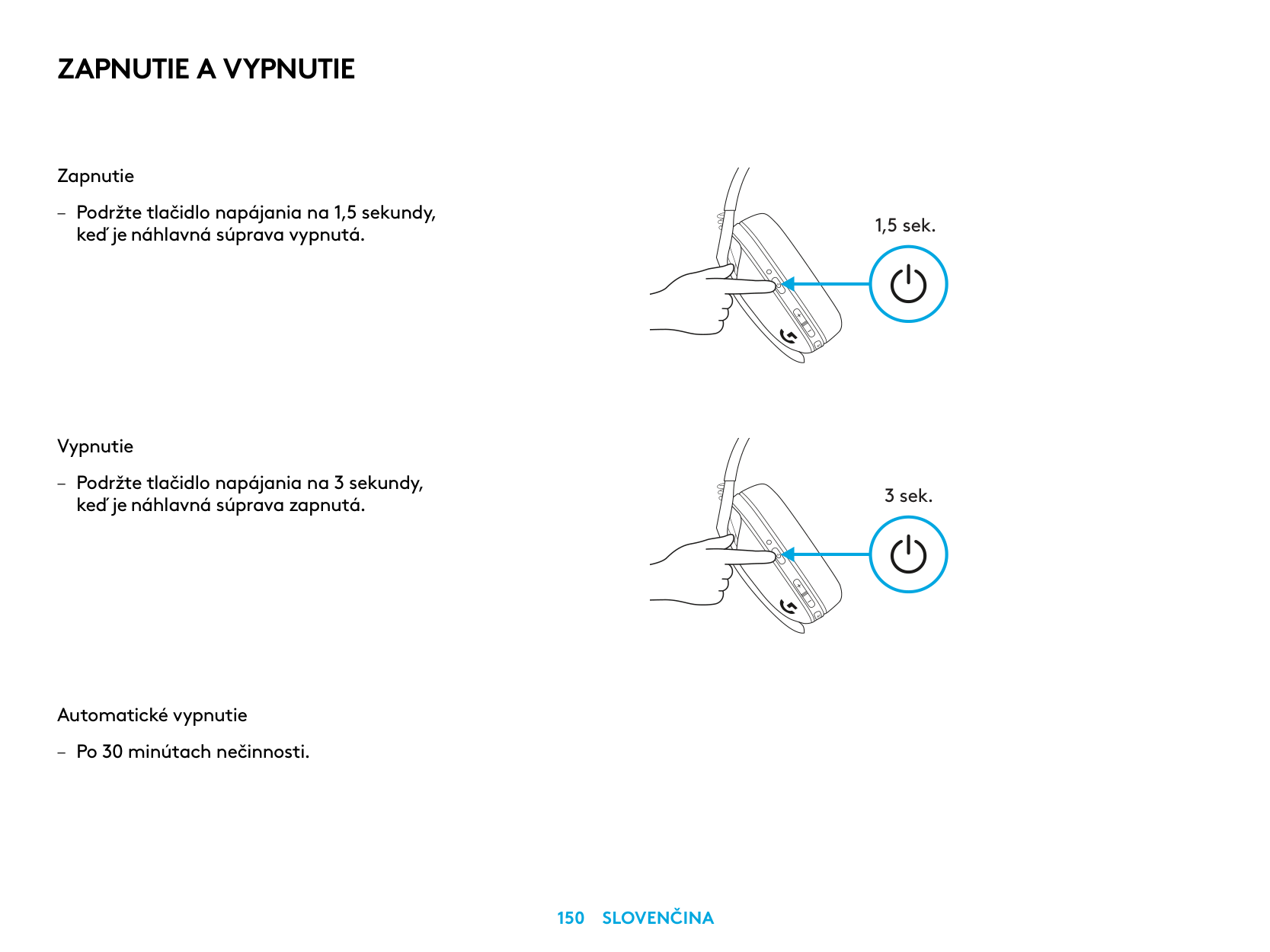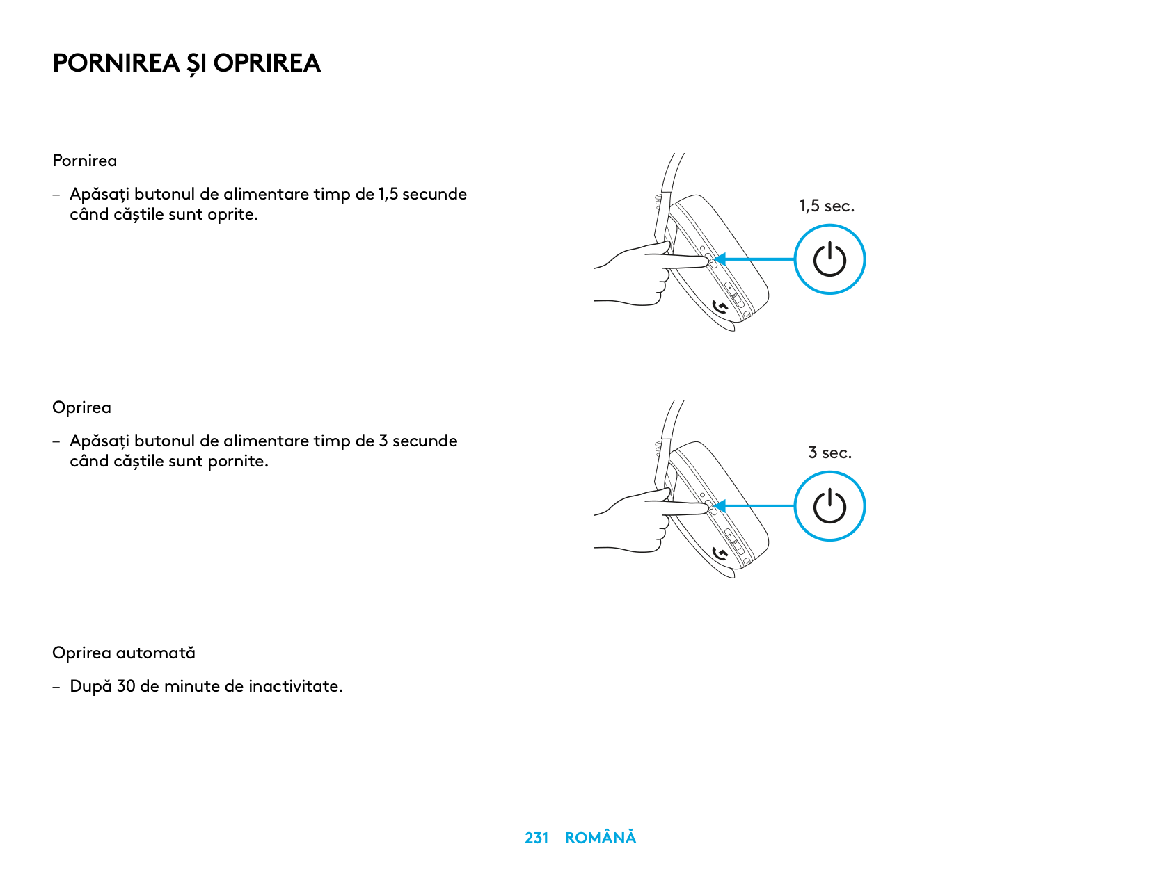 Pornirea – Apăsaţi butonul de alimentare timp de 1,5 secunde când căştile sunt oprite. Oprirea – Apăsaţi butonul de alimentare timp de 3 secunde când căştile sunt pornite. Oprirea automată – După 30 de minute de inactivitate. 1,5 sec. 3 sec.Pornirea Şi Oprirea