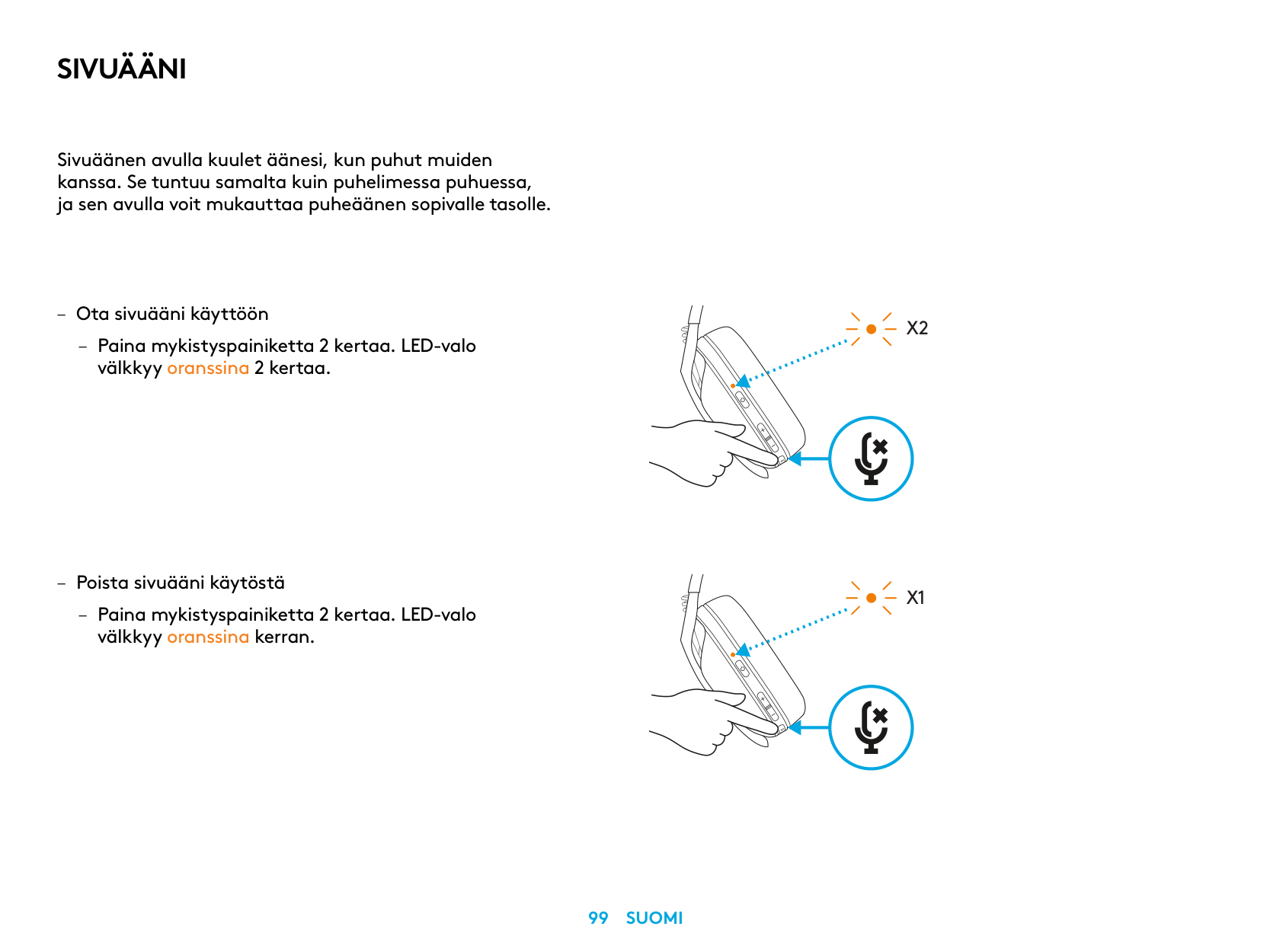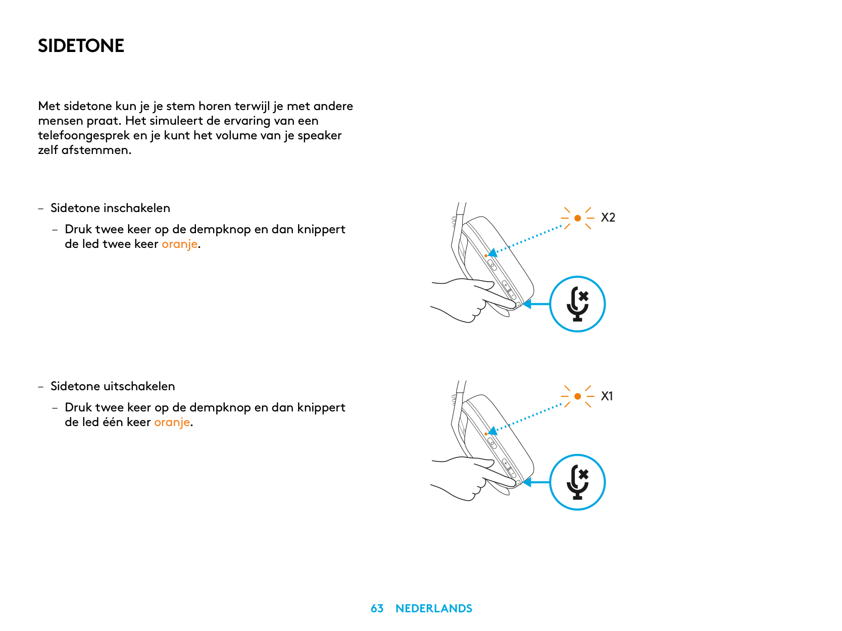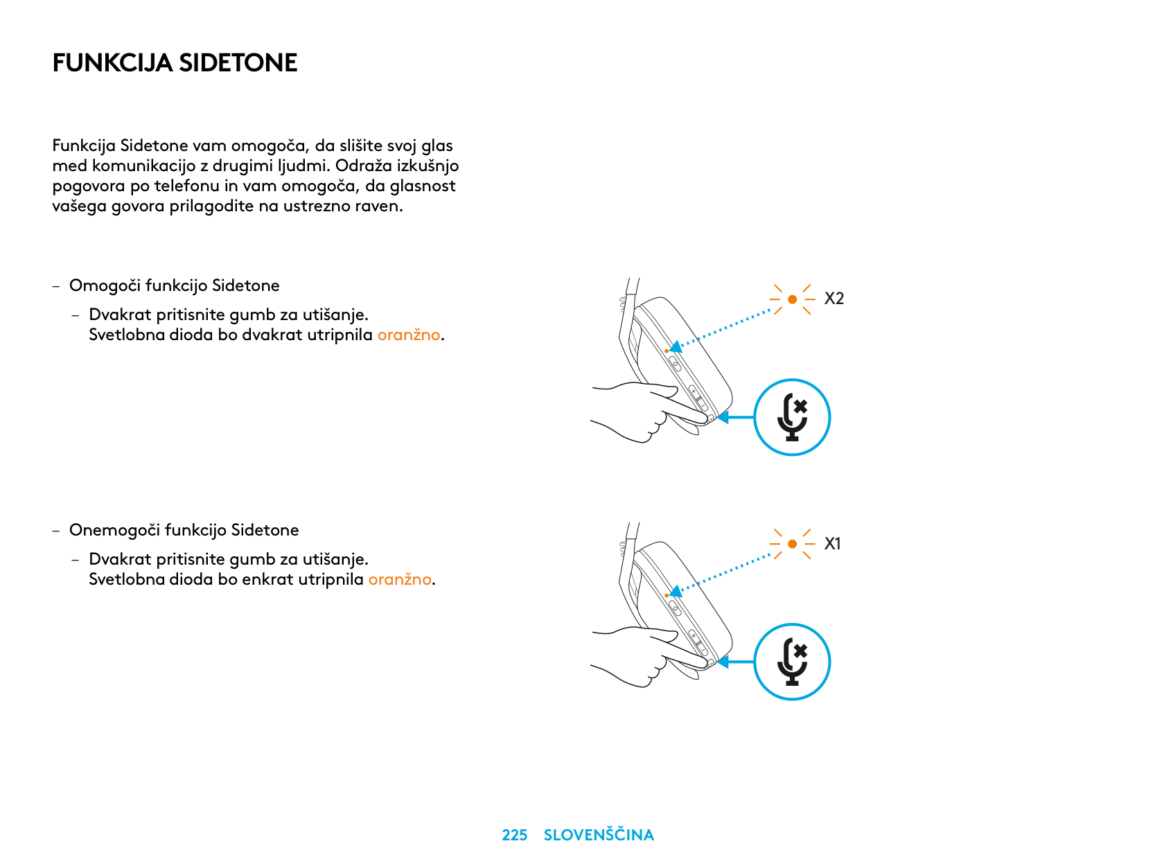 – Disable Sidetone – Double press the Mute button and the LED will flash once in orange.X2