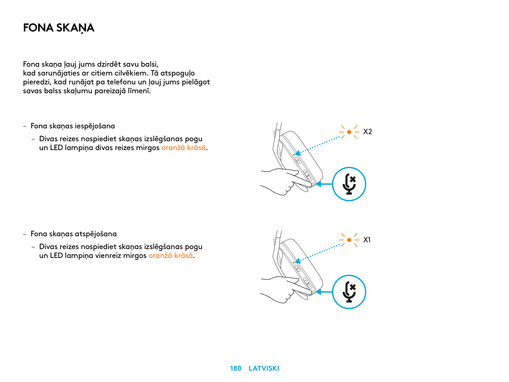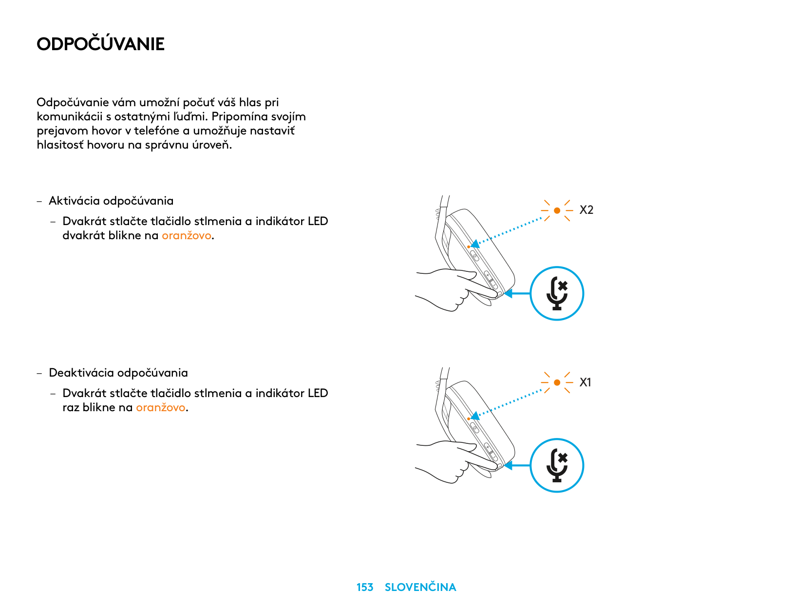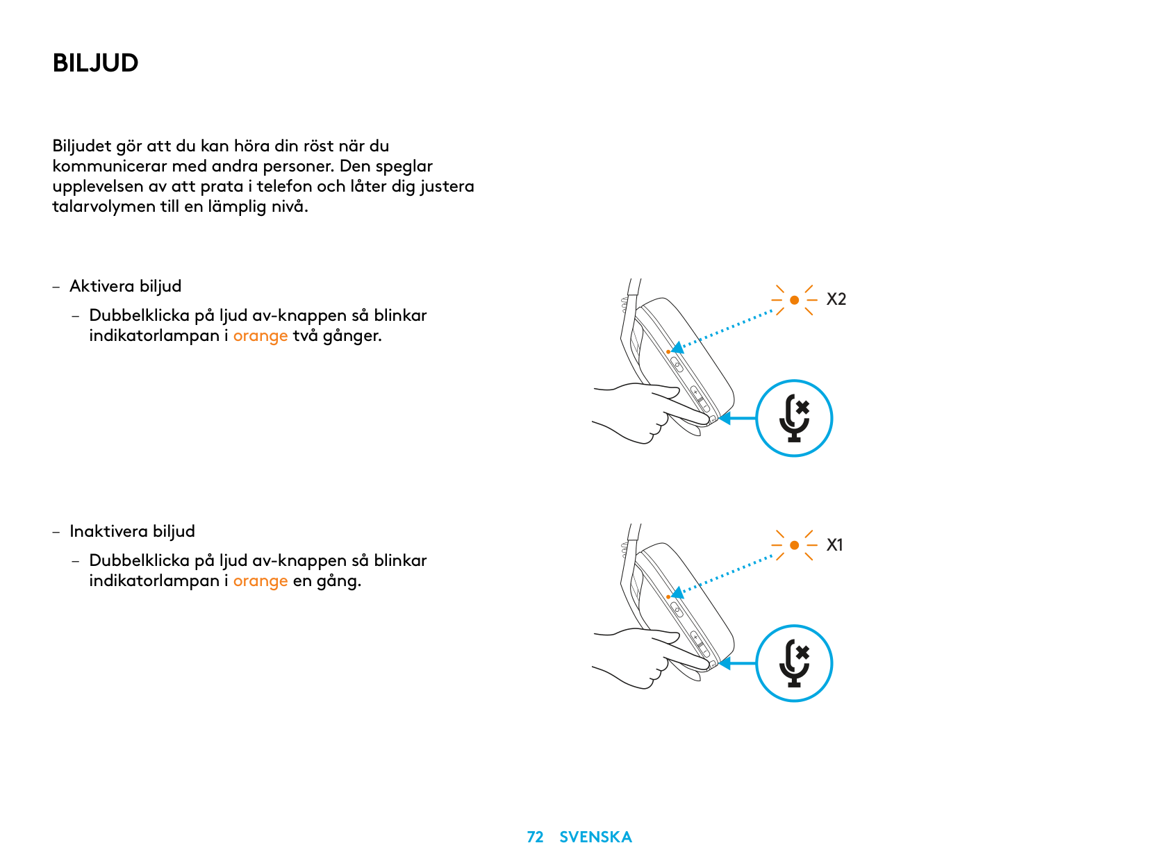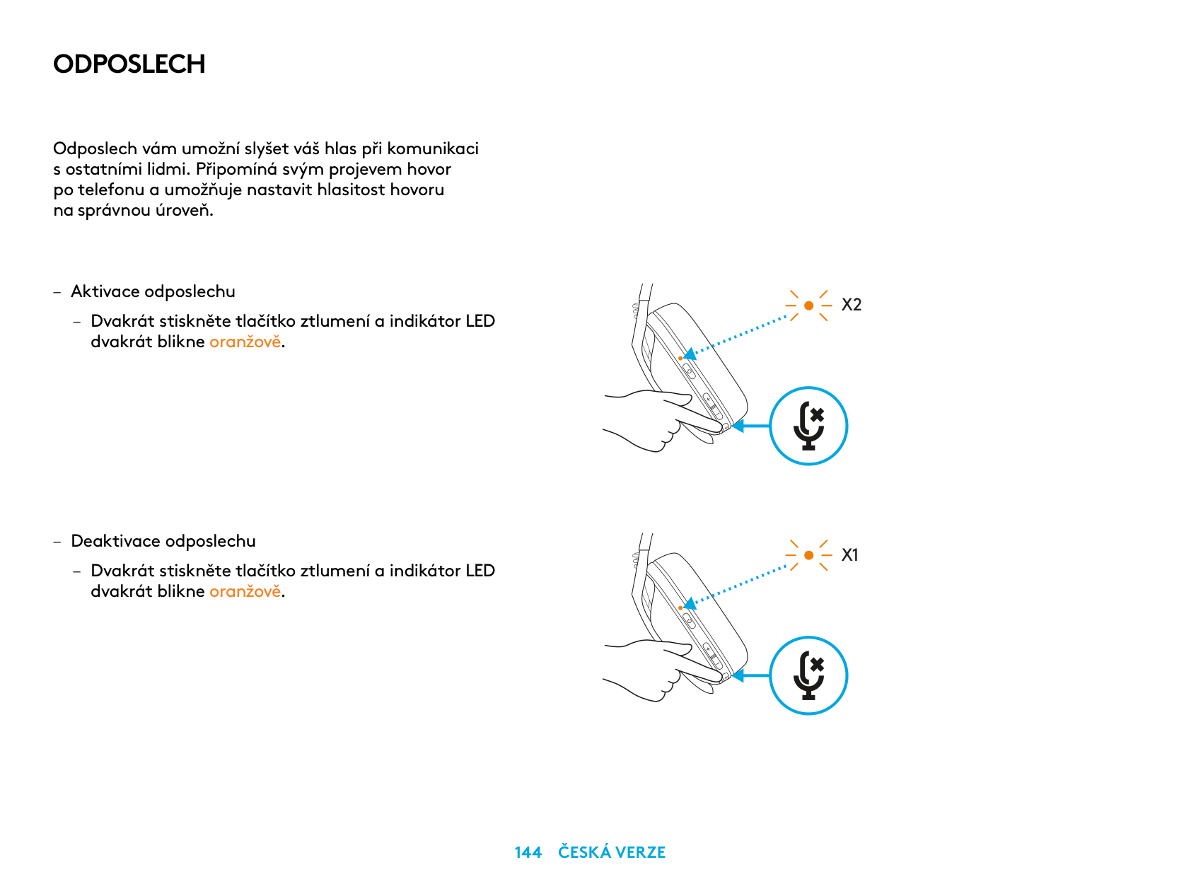 – Disable Sidetone – Double press the Mute button and the LED will flash once in orange.X2