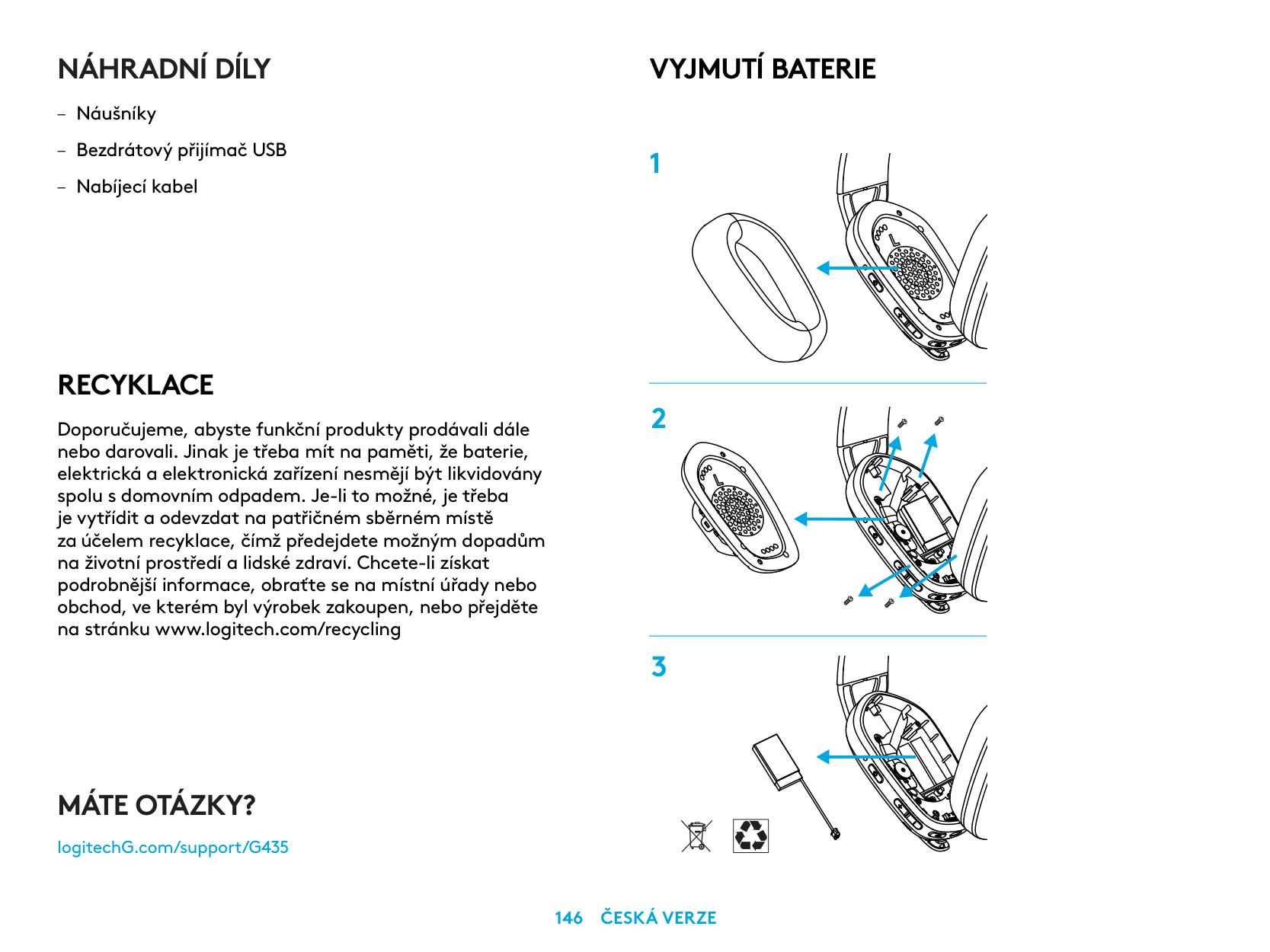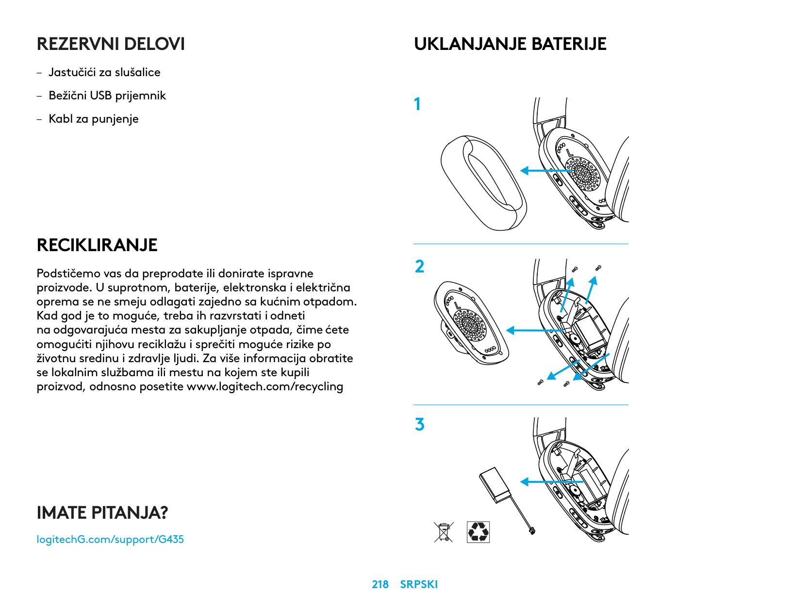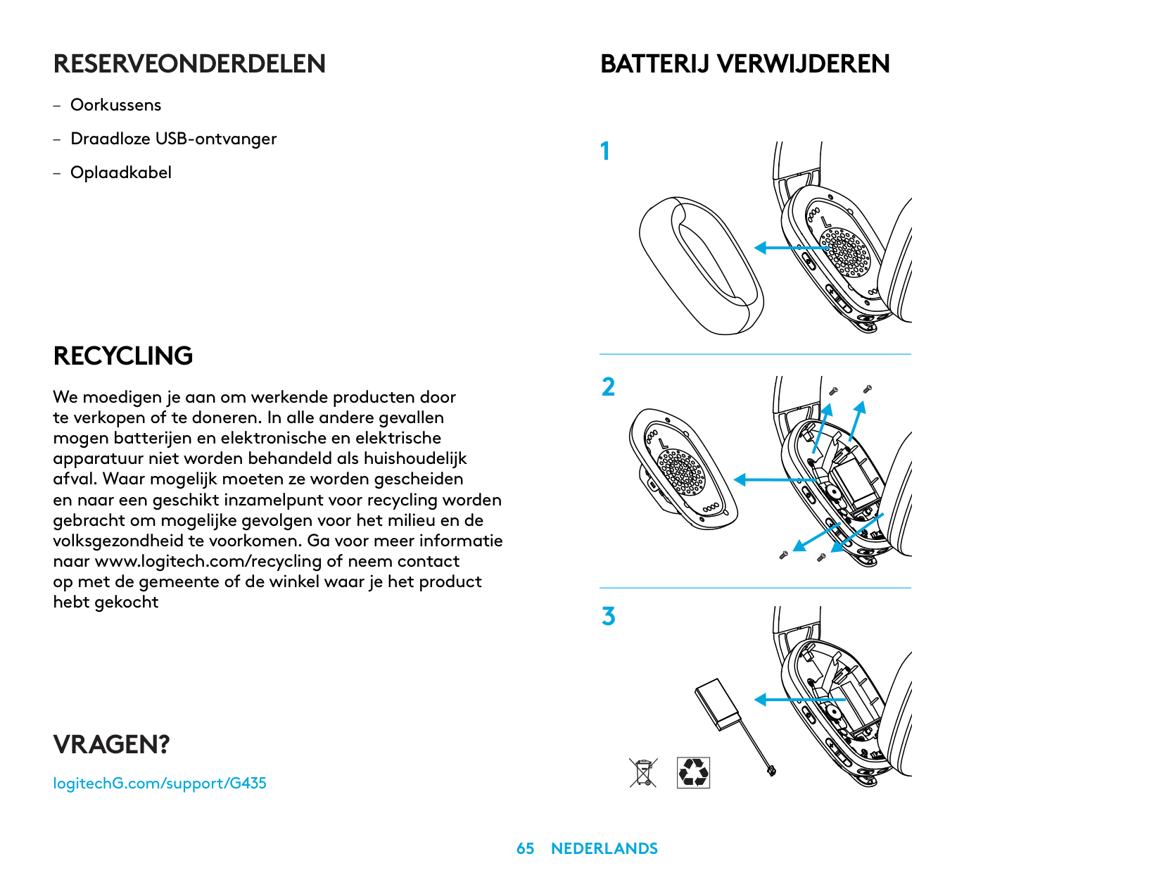 – كابل الشحن إزالة البطارية 1 2 3 هل لديك أي استفسارات؟ logitechG.com/support/G435עברית 255