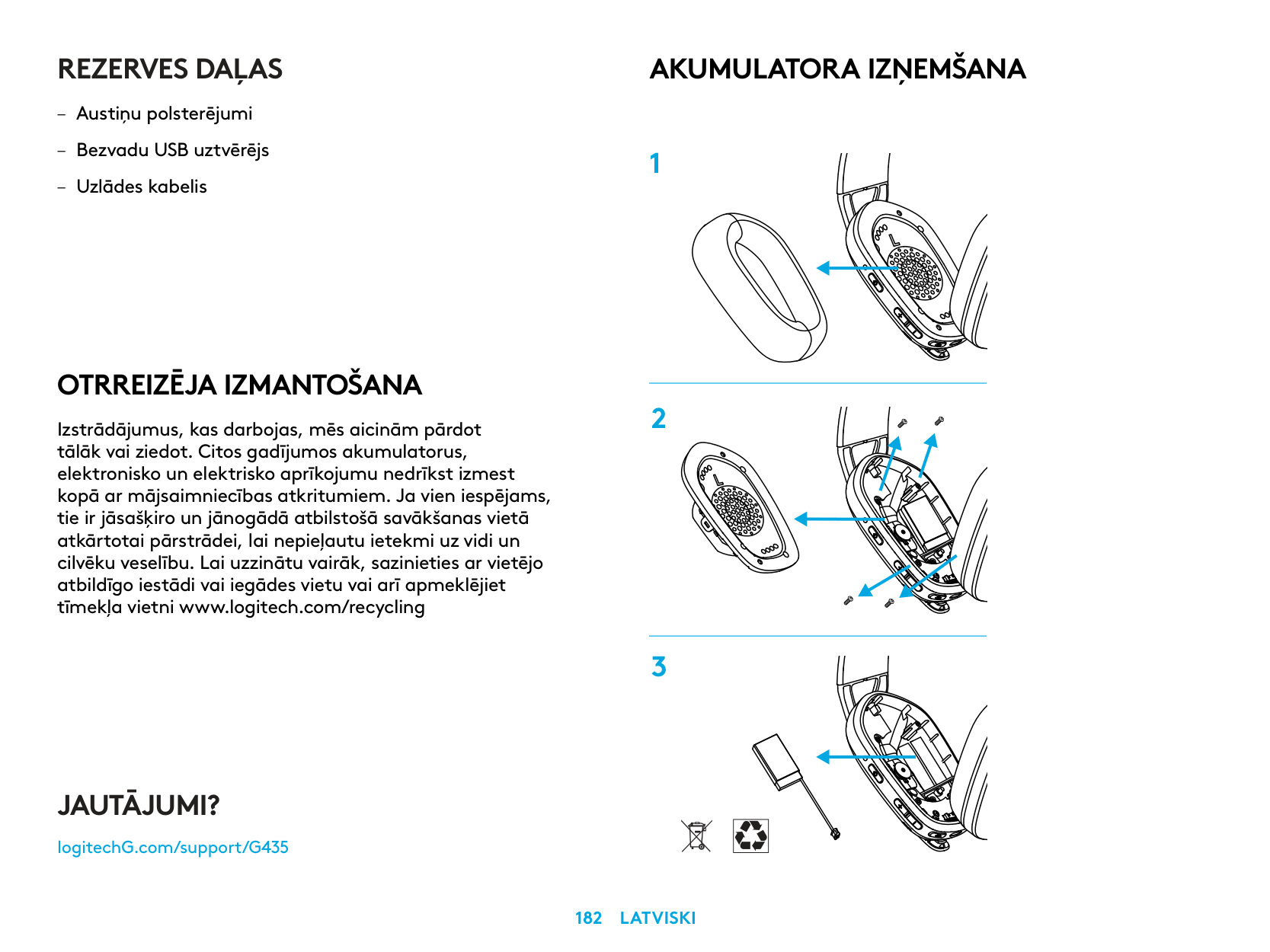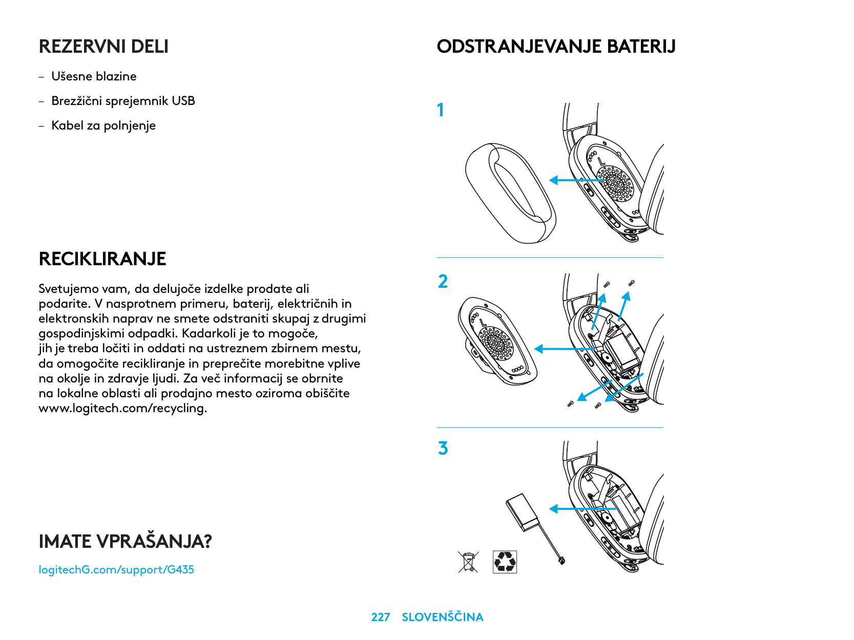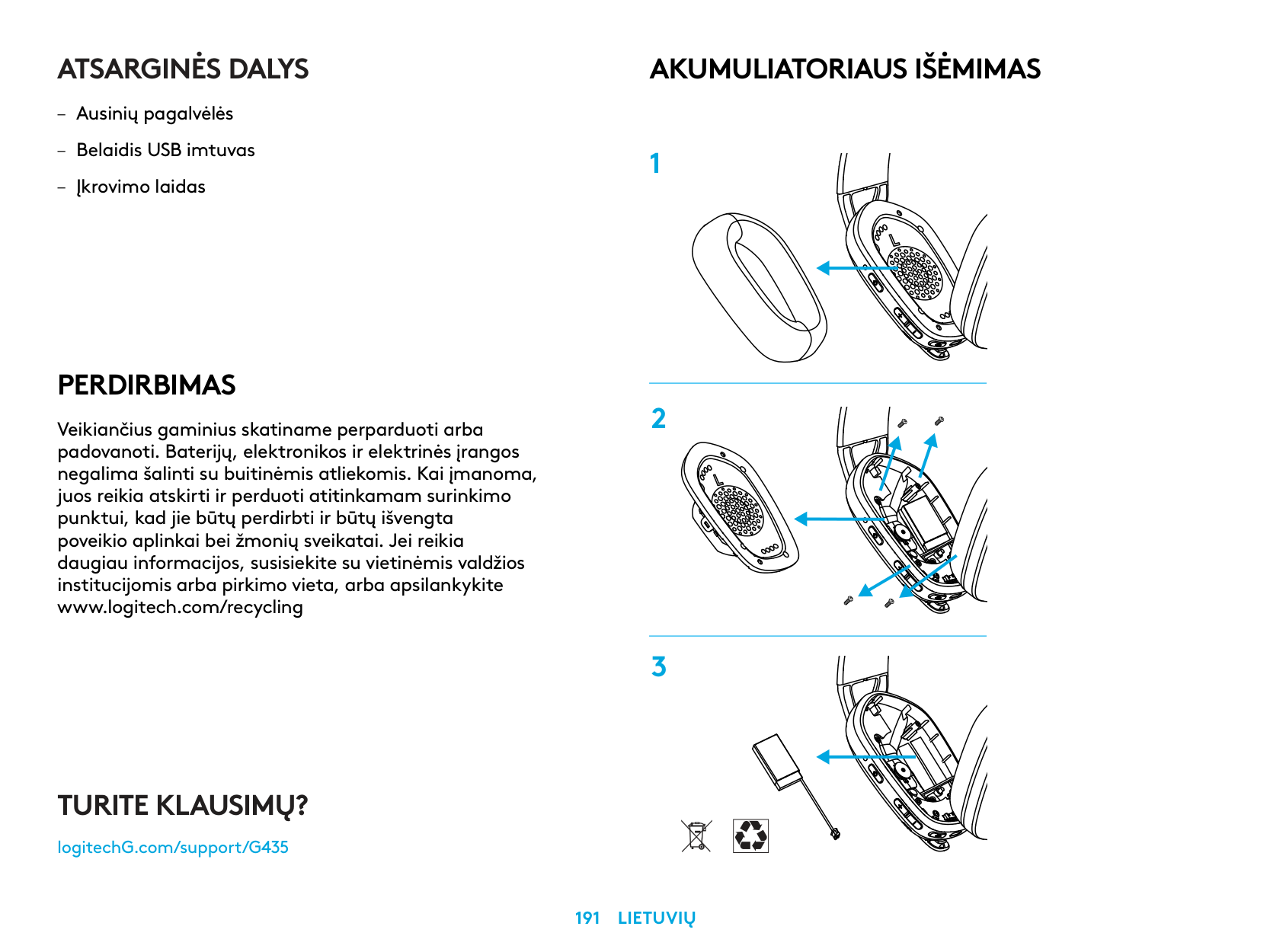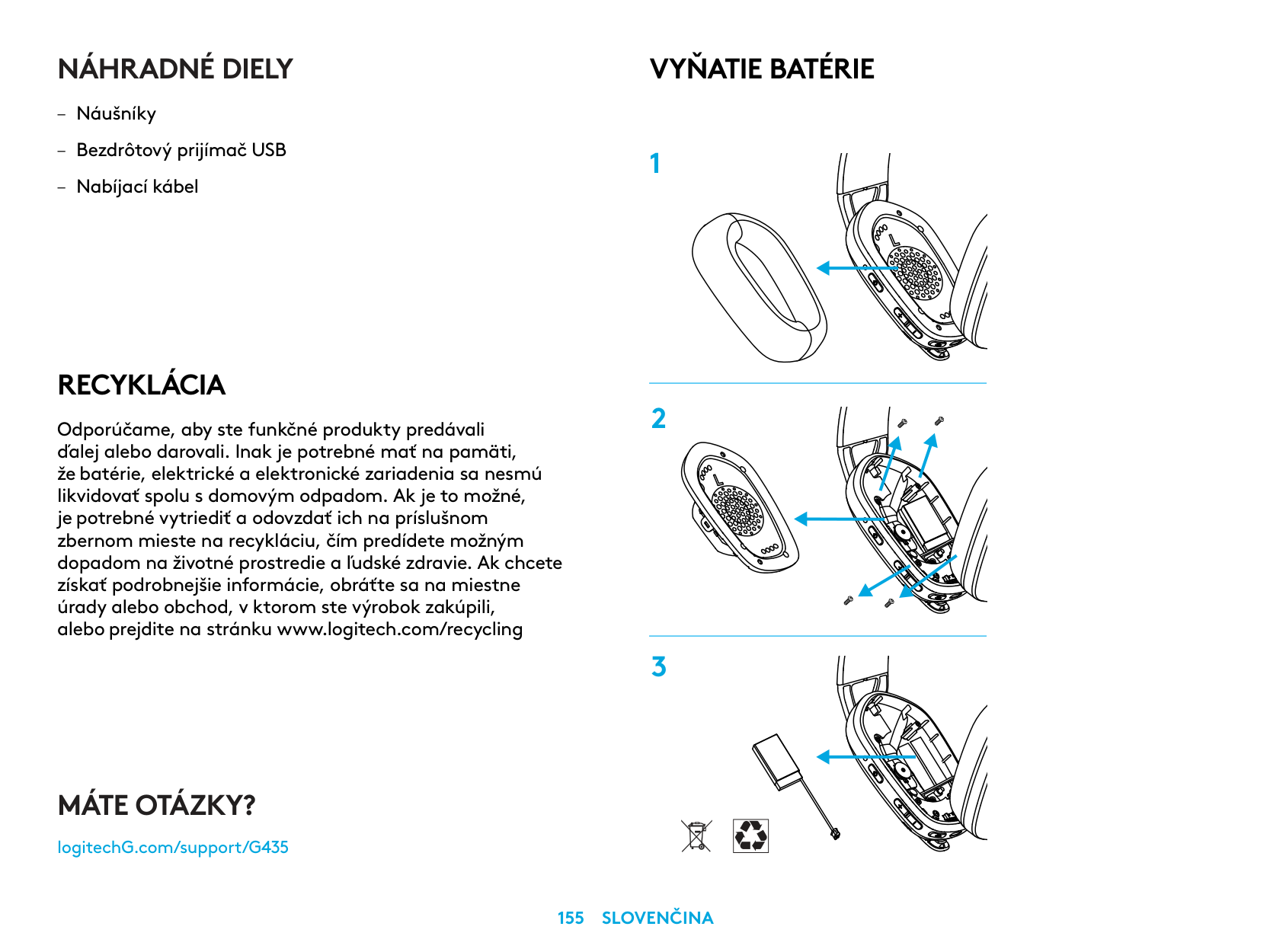 – كابل الشحن إزالة البطارية 1 2 3 هل لديك أي استفسارات؟ logitechG.com/support/G435עברית 255