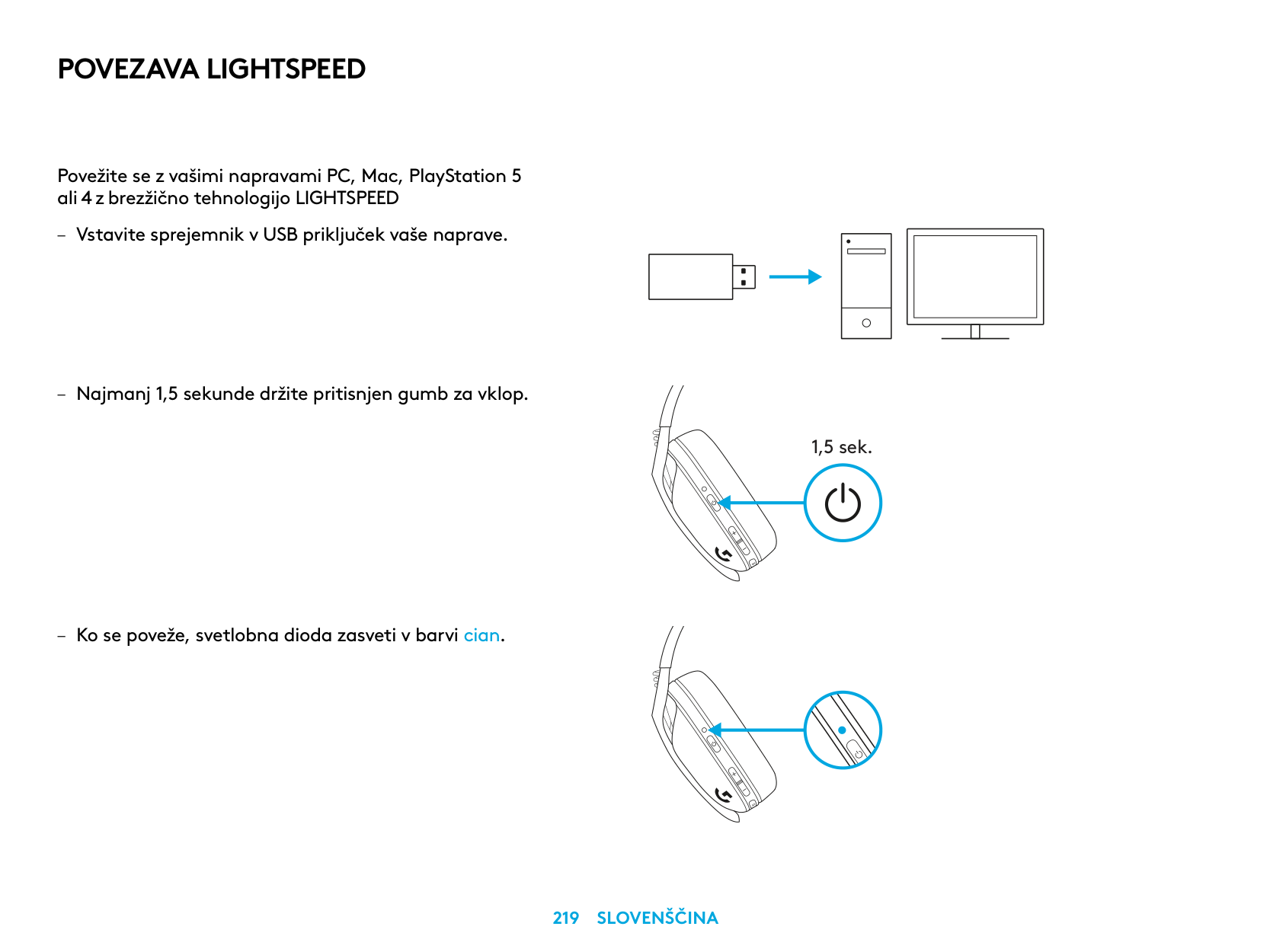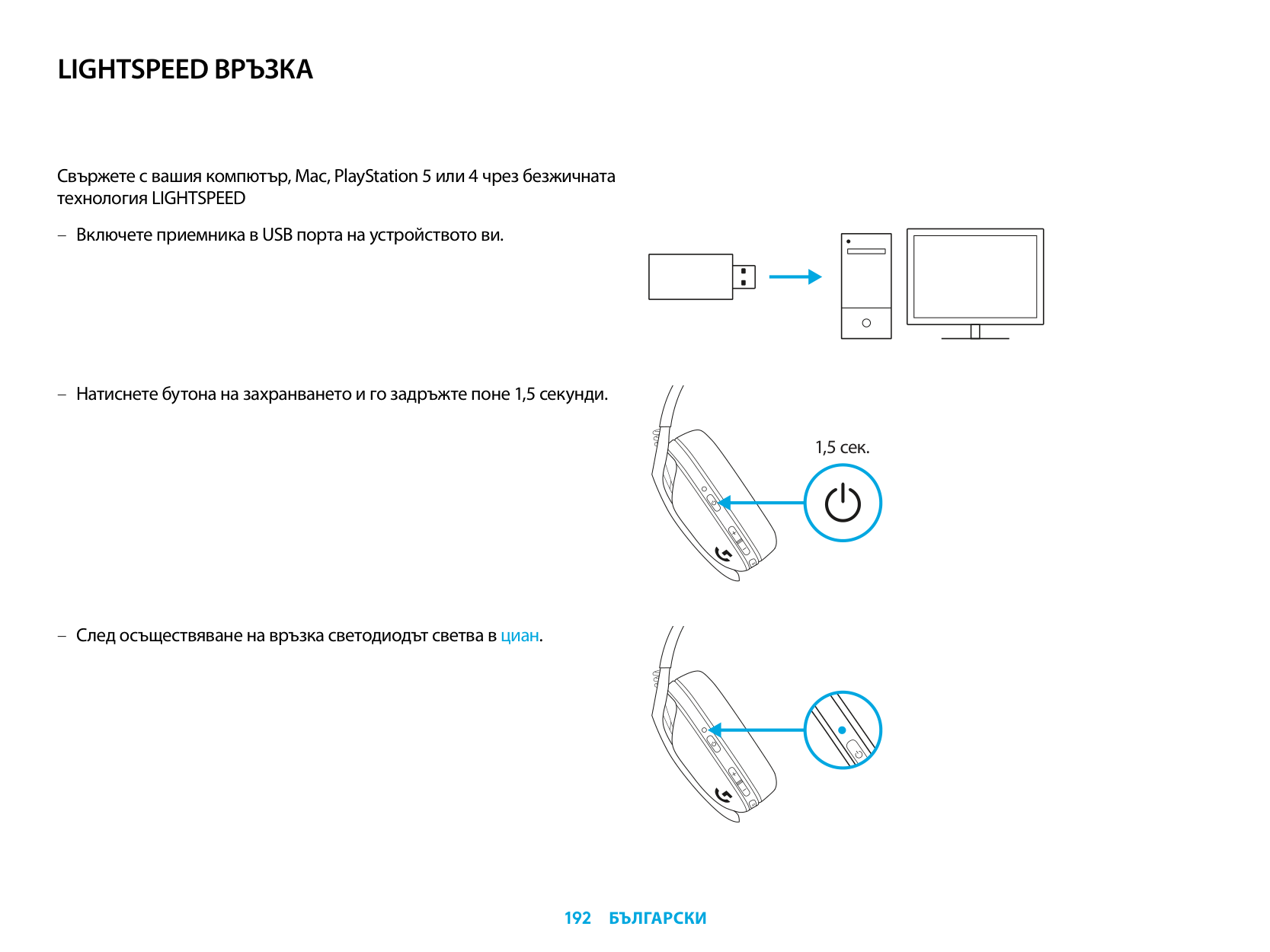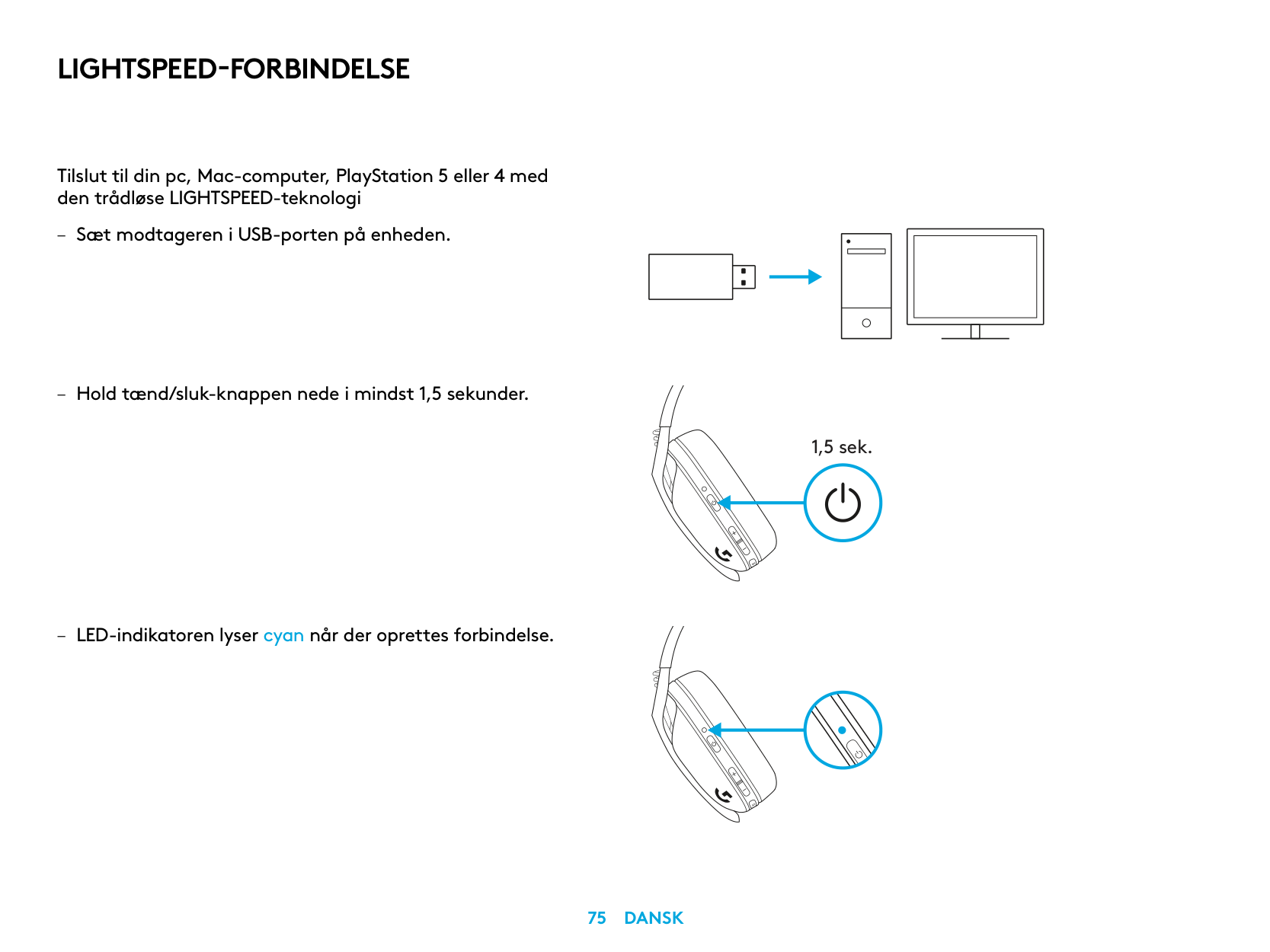 Connect to your PC, Mac, PlayStation 5 or 4 with LIGHTSPEED Wireless Technology – Insert receiver into the USB port of your device. – Press the Power button for minimum 1.5 sec. – The LED turns cyan once connected. 1.5 sec.4 English