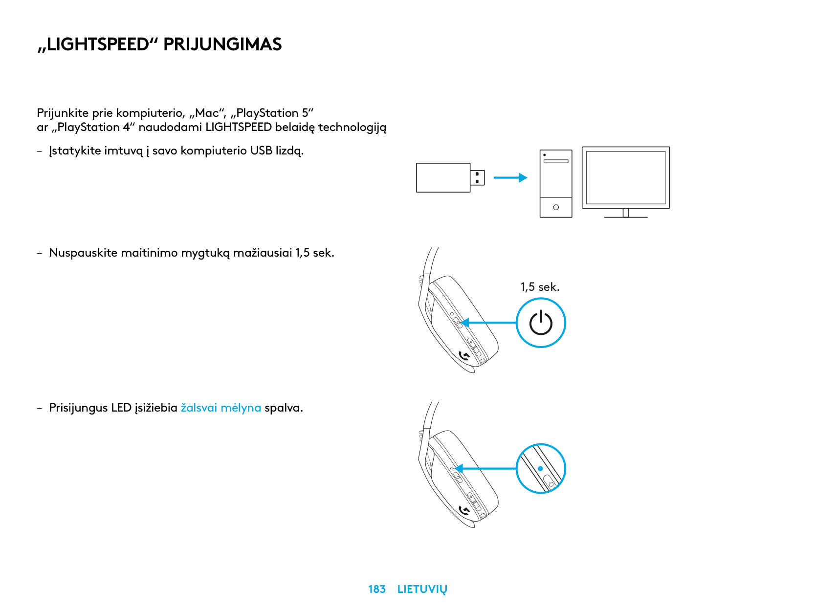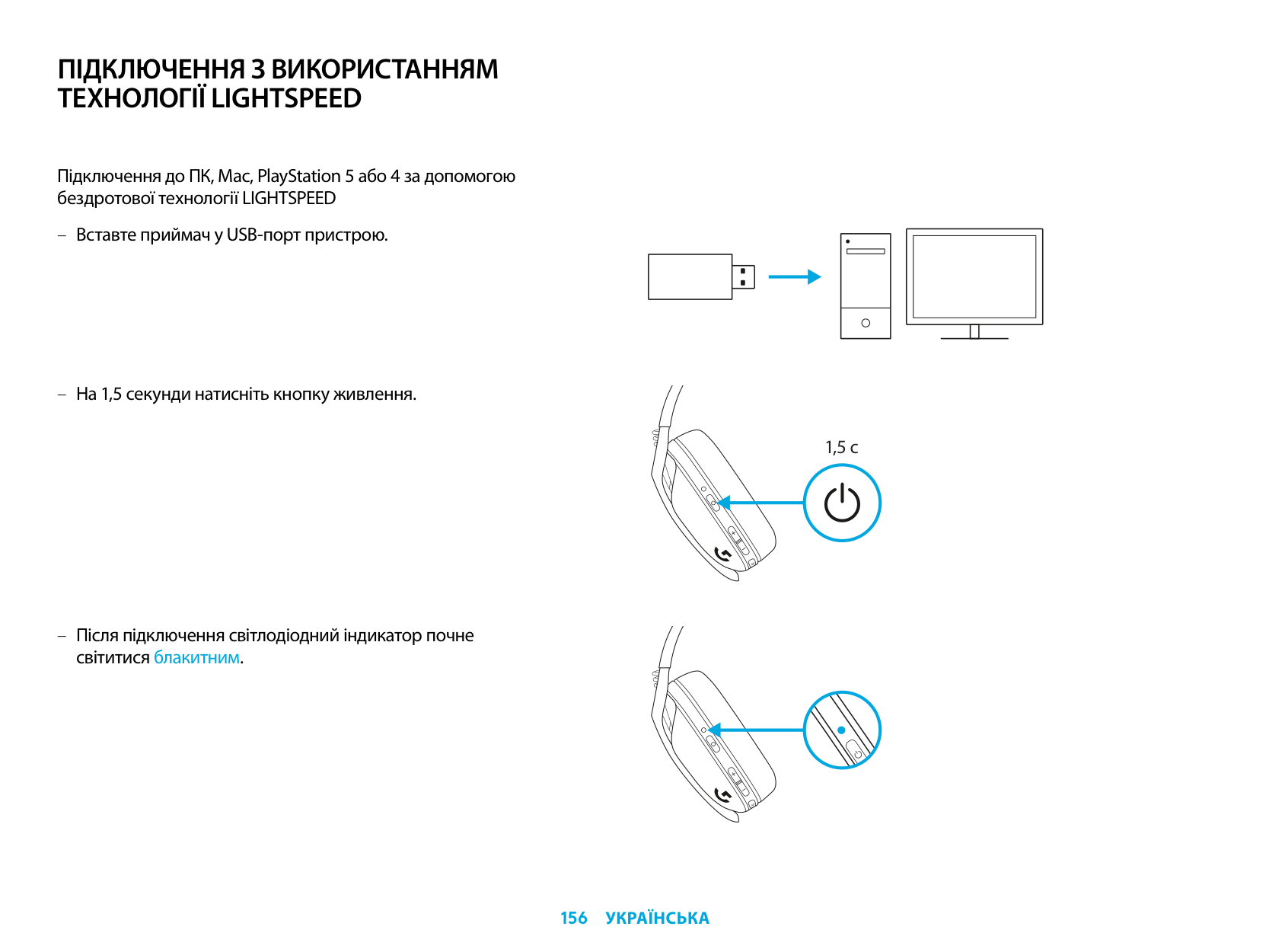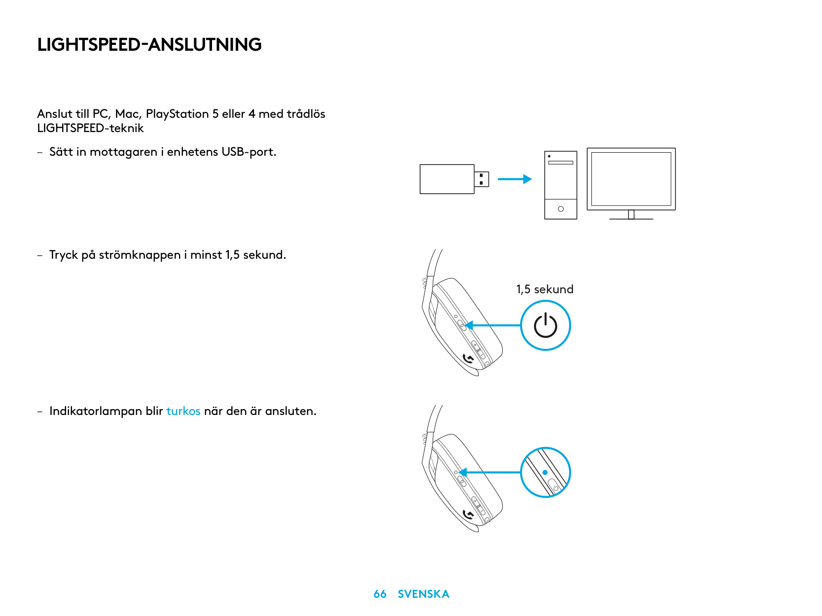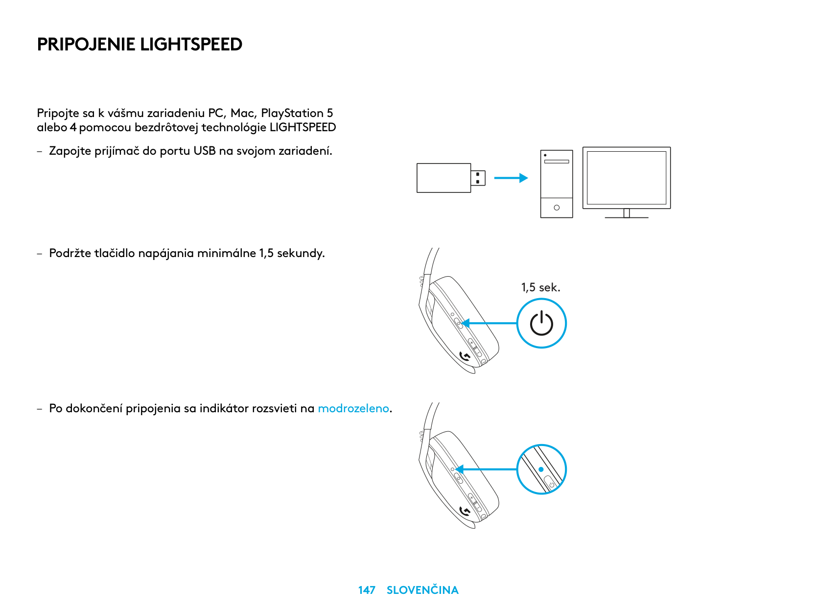 Connect to your PC, Mac, PlayStation 5 or 4 with LIGHTSPEED Wireless Technology – Insert receiver into the USB port of your device. – Press the Power button for minimum 1.5 sec. – The LED turns cyan once connected. 1.5 sec.4 English