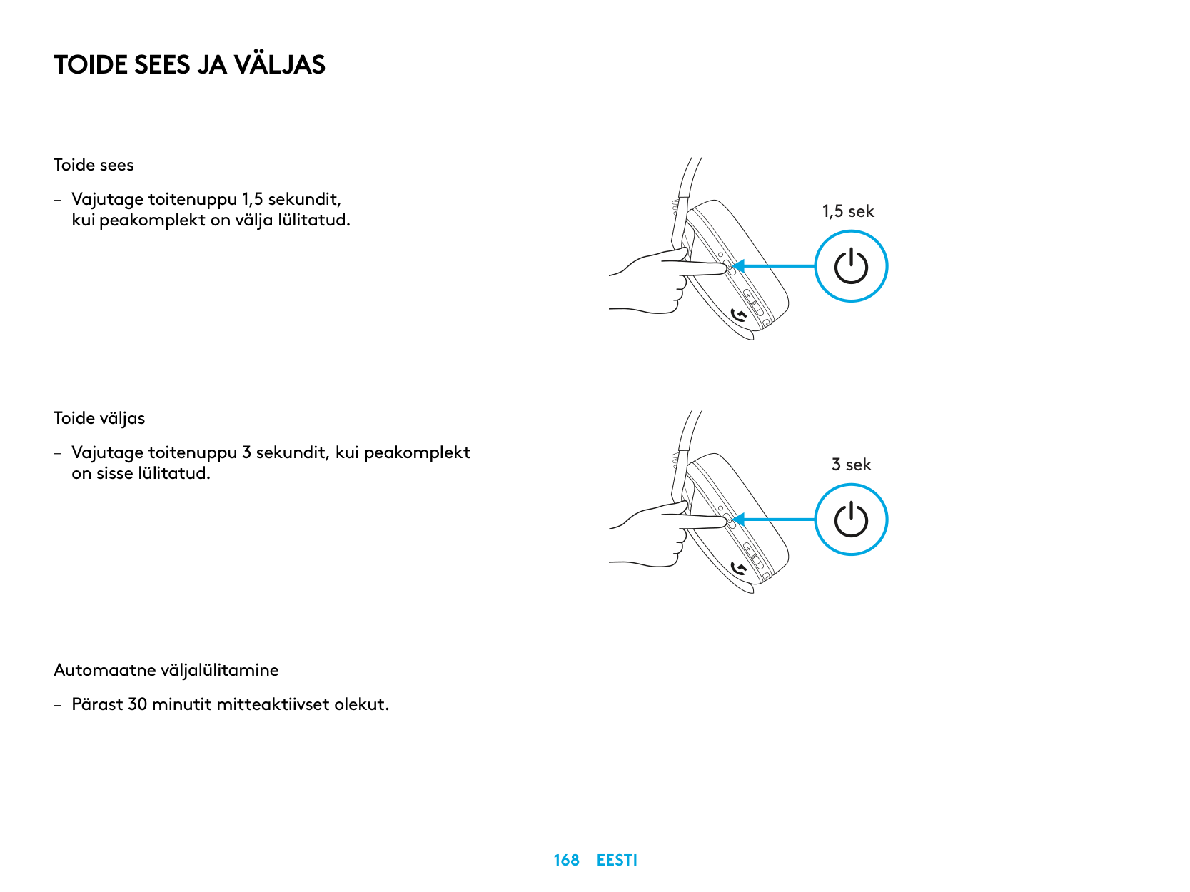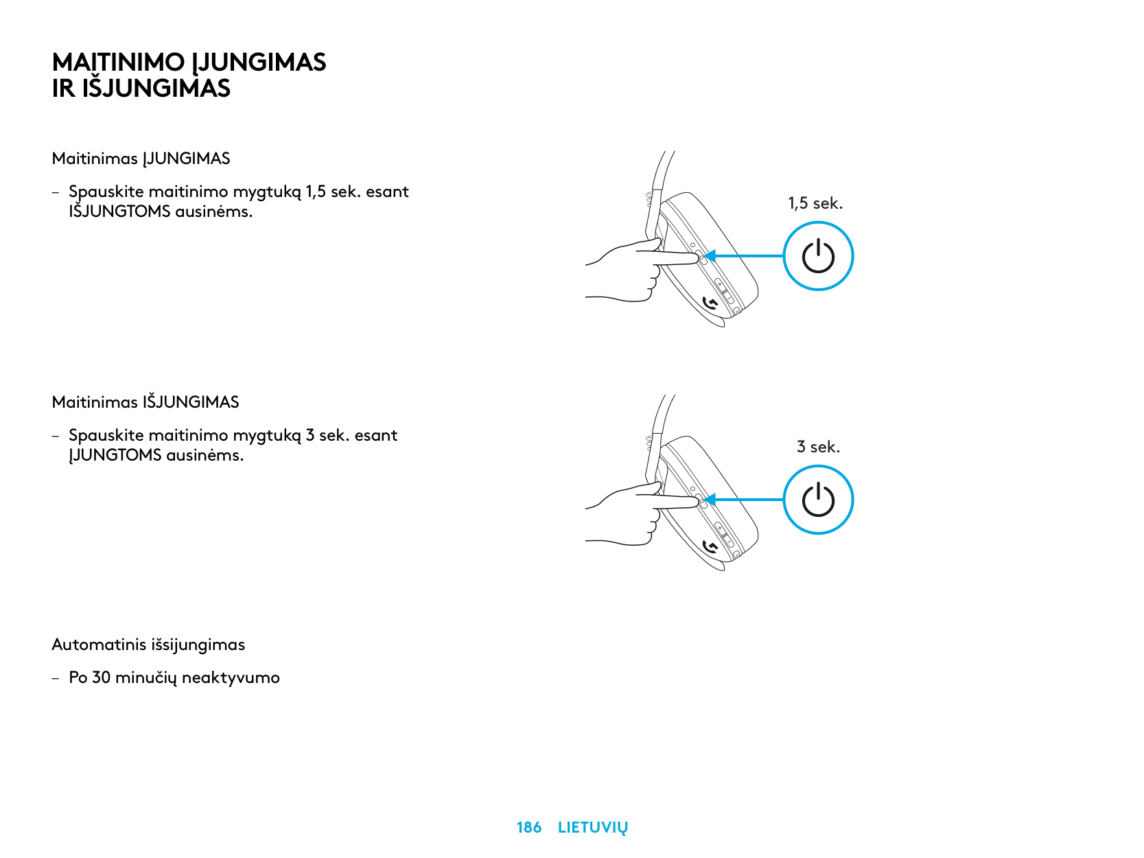 – Kulaklık AÇIK durumdayken Güç düğmesini 3 saniye basılı tutun. Otomatik Kapanma – 30 dakika boyunca eylem gerçekleştirilmediğinde. 1,5 sn. 3 sn.Açma Ve Kapama