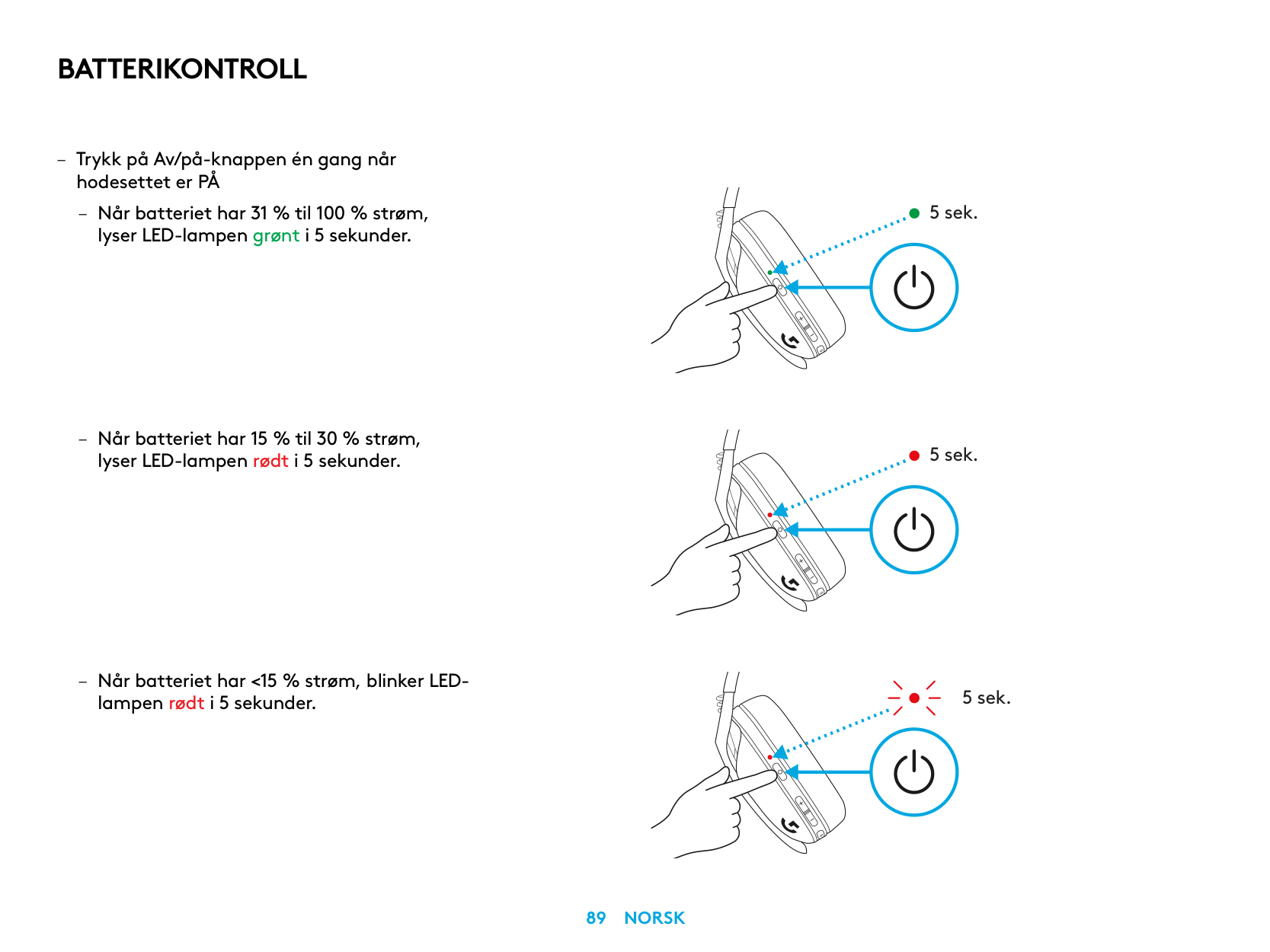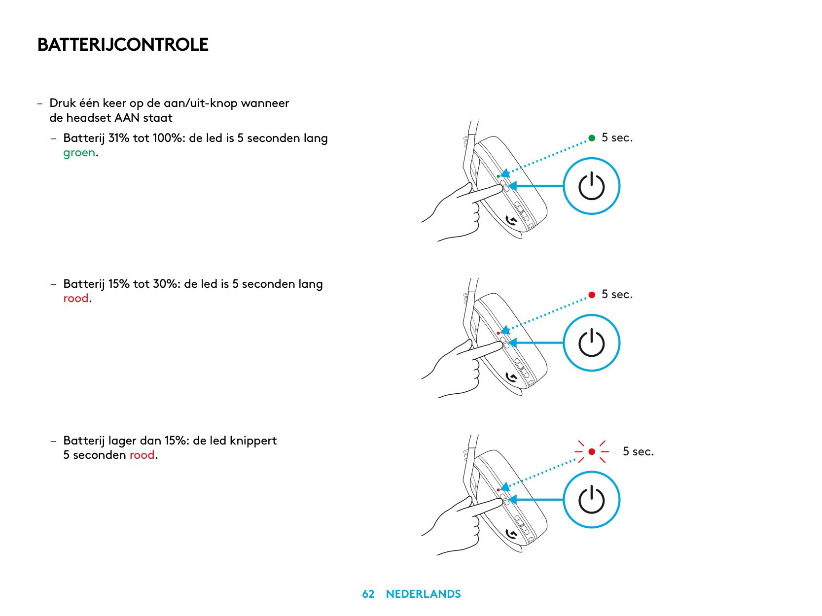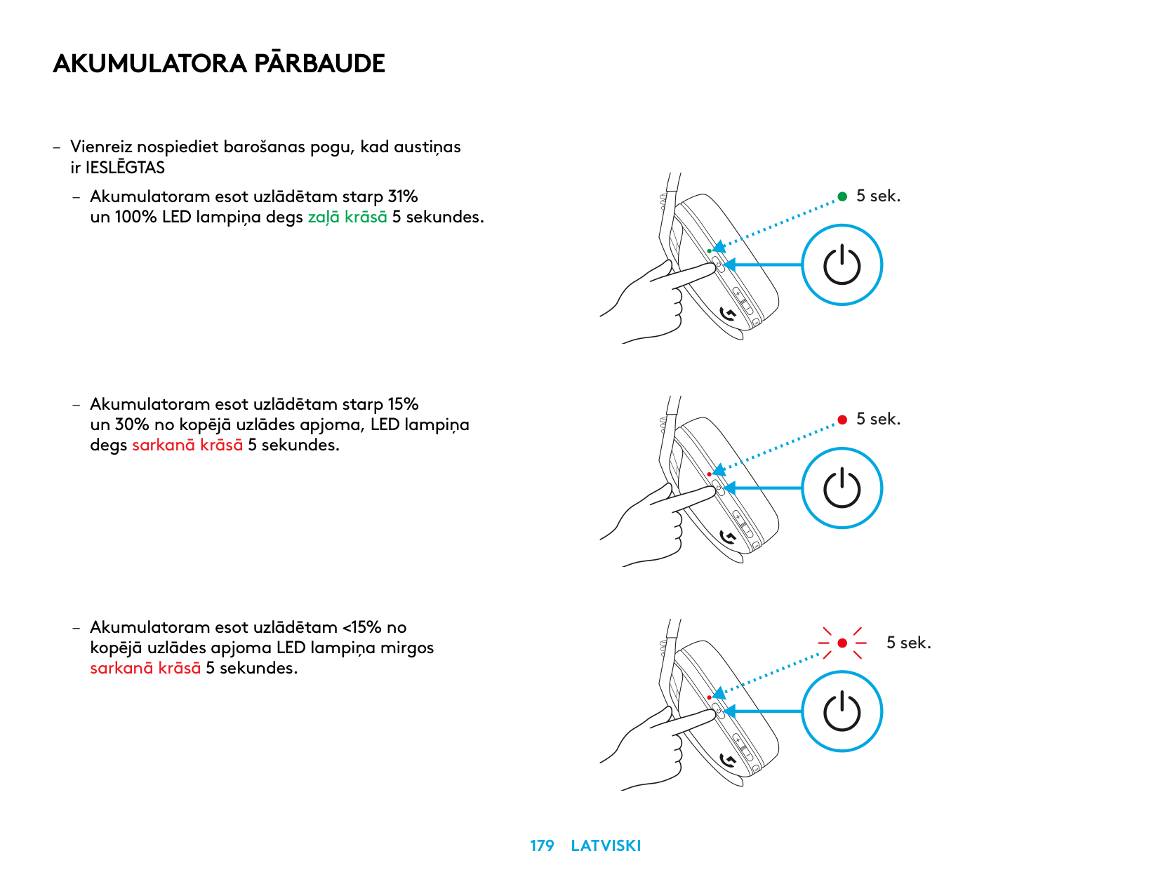 – Kulaklık AÇIK durumdayken Güç düğmesine bir kez basın – LED ışığı, pil seviyesi %31-100 arasındaysa 5 saniye boyunca yeşil renkte yanacaktır.Pi̇l Kontrolü