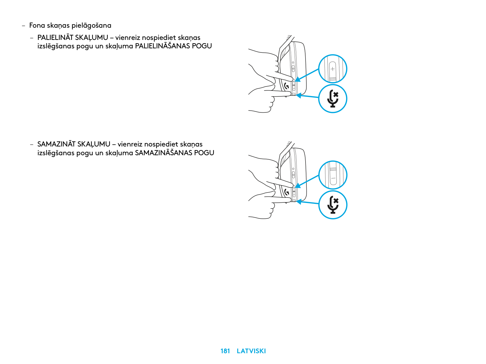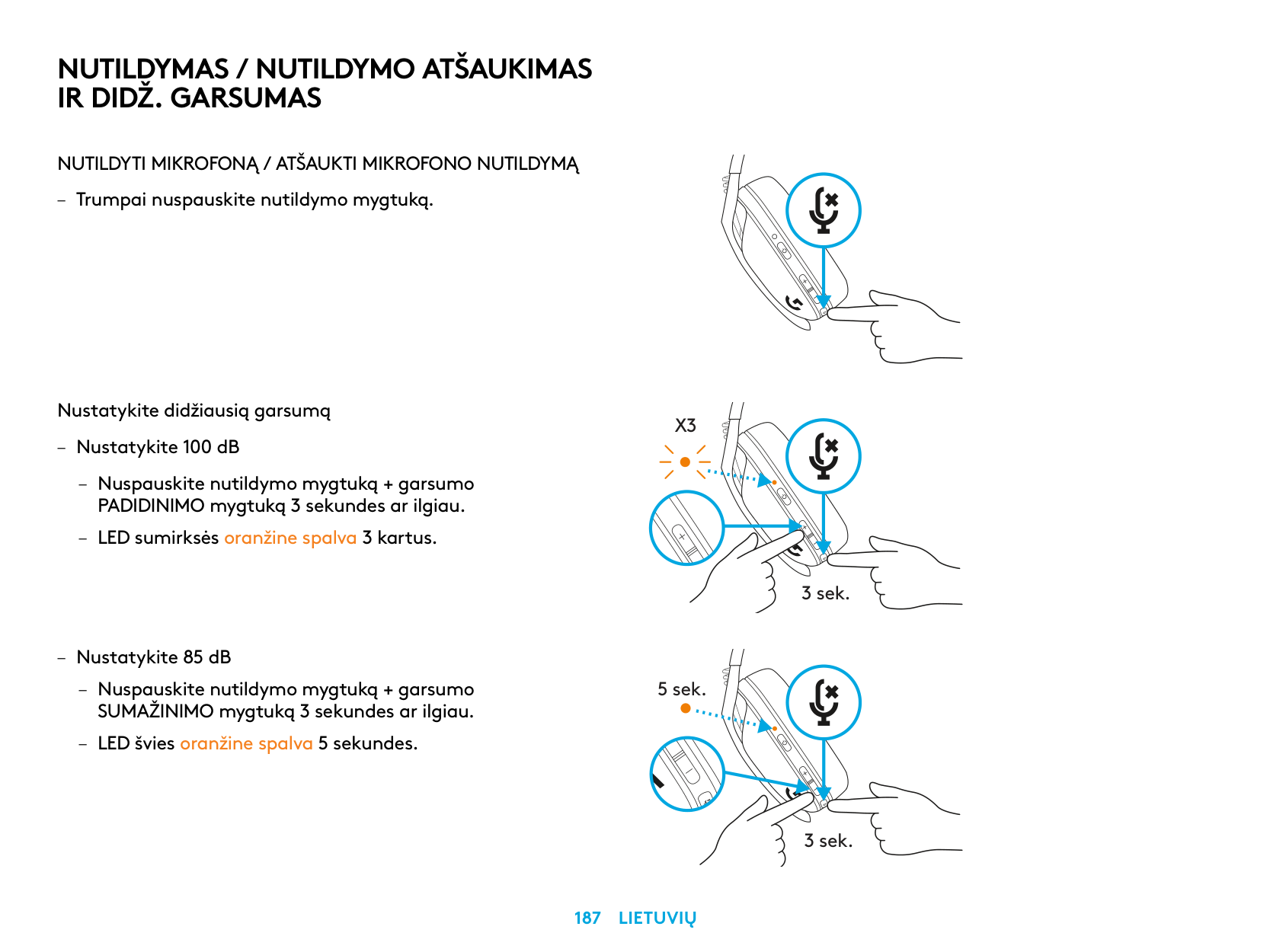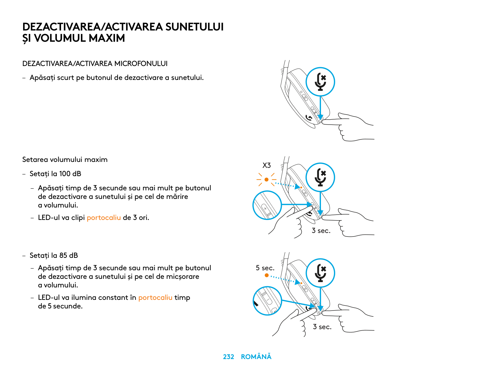 – Apăsaţi scurt pe butonul de dezactivare a sunetului. Setarea volumului maxim – Setaţi la 100 dB – Apăsaţi timp de 3 secunde sau mai mult pe butonul de dezactivare a sunetului şi pe cel de mărire a volumului. – LED-ul va clipi portocaliu de 3 ori. – Setaţi la 85 dB – Apăsaţi timp de 3 secunde sau mai mult pe butonul de dezactivare a sunetului şi pe cel de micşorare a volumului. – LED-ul va ilumina constant în portocaliu timp de 5 secunde.X3