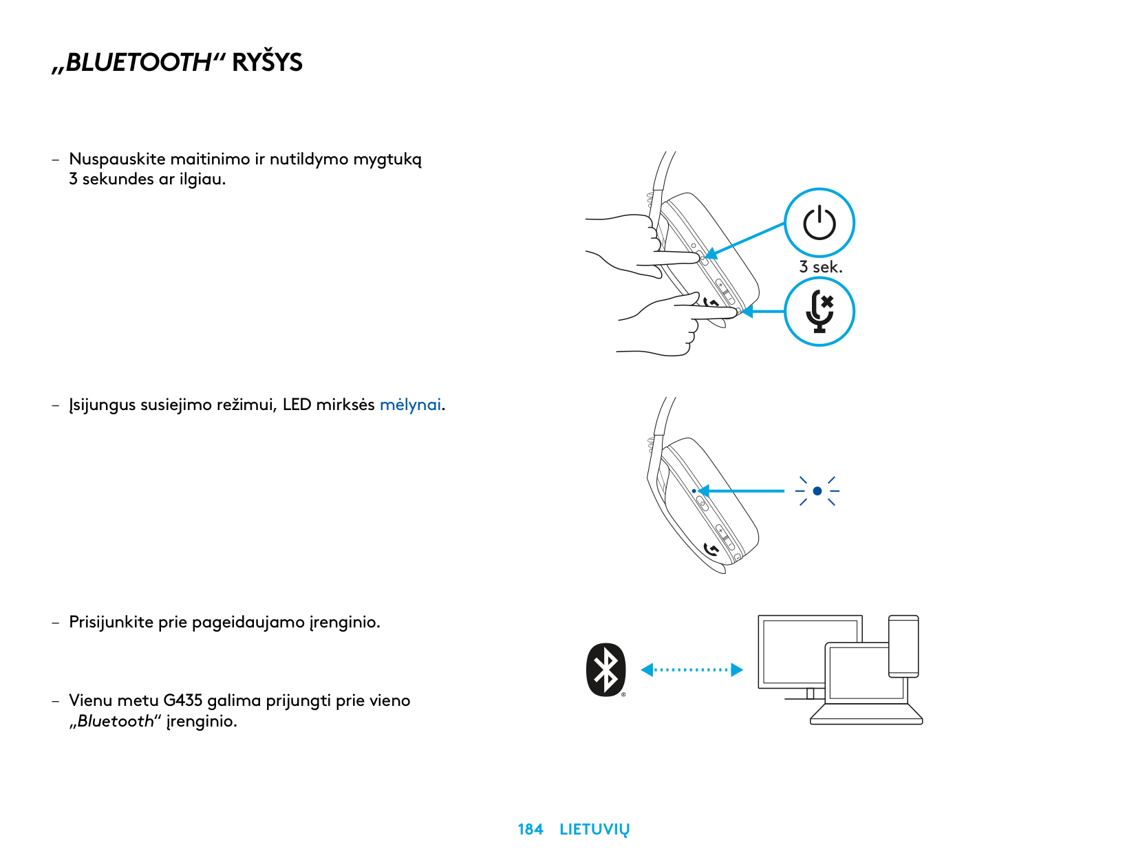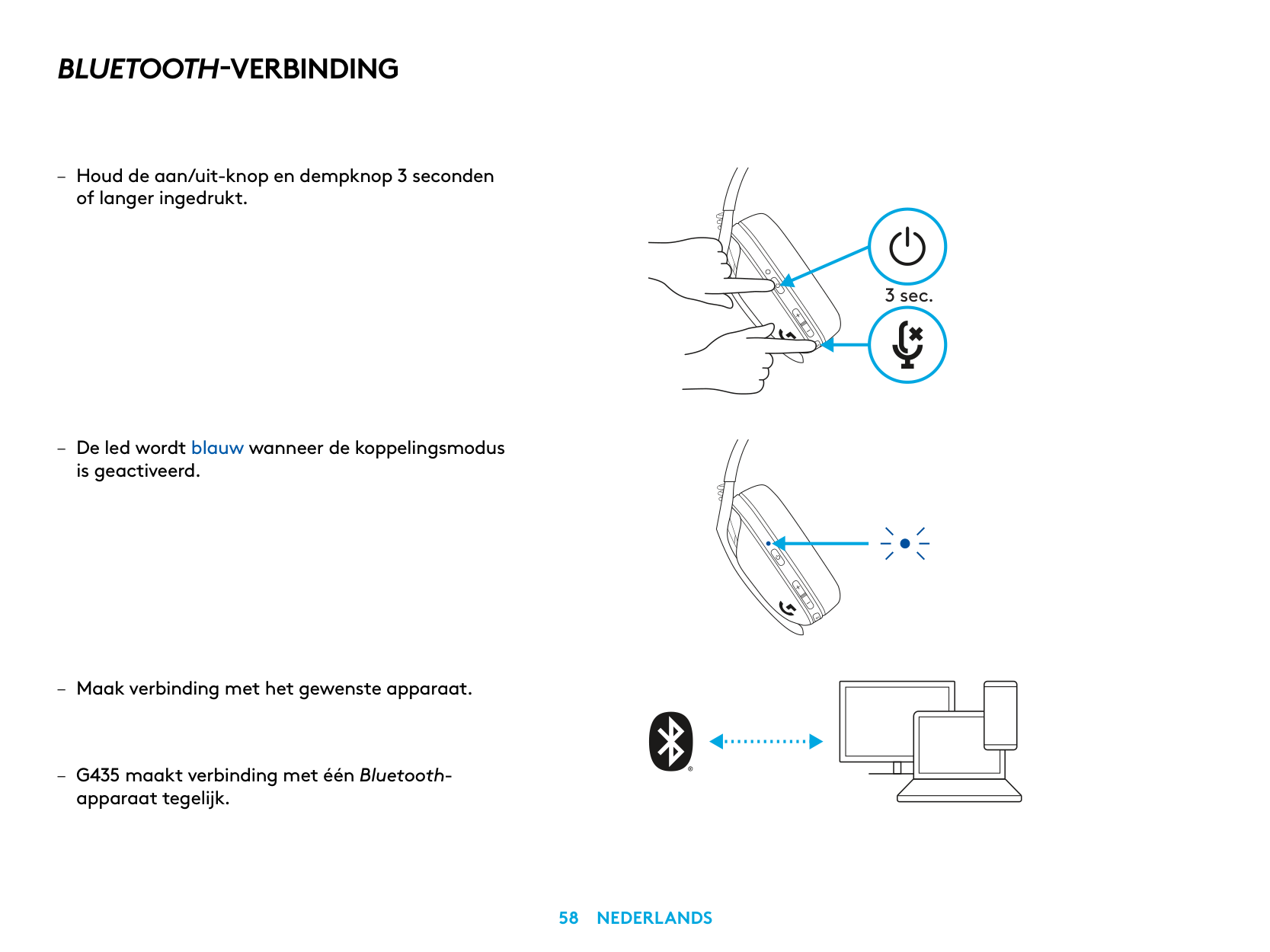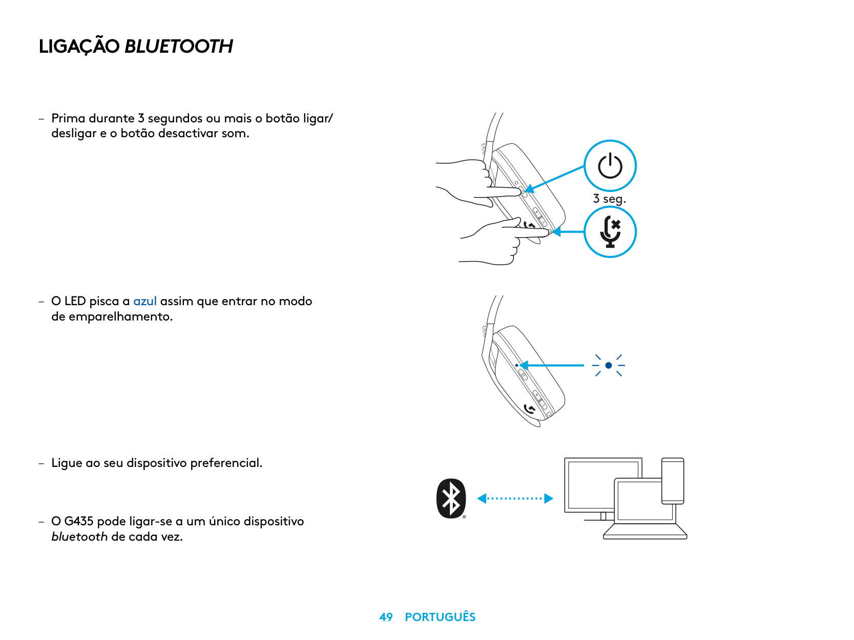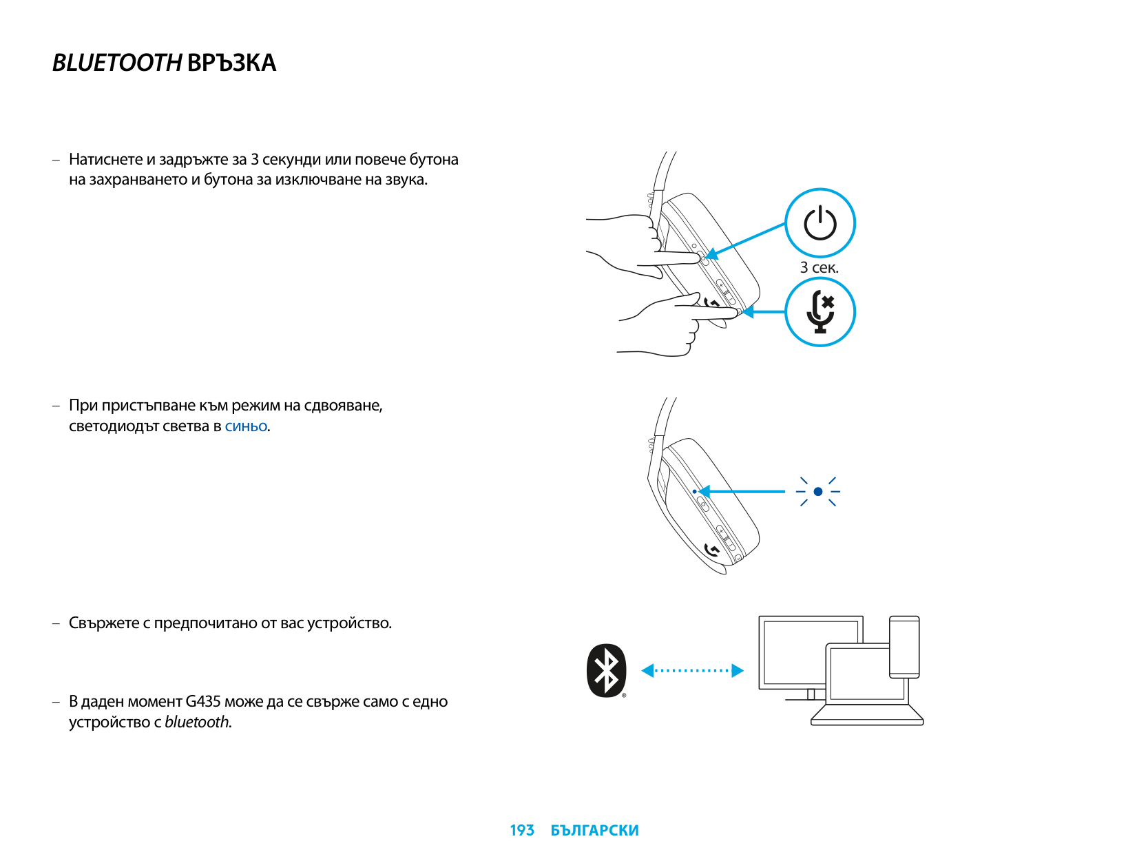 – Güç ve Sesi Kapatma düğmelerini 3 saniye veya daha uzun süre basılı tutun. – LED ışığı, eşleştirme moduna girdiğinde mavi renkte yanıp sönecektir. 3 sn. – Tercih ettiğiniz cihaza bağlanın. – G435, tek seferde bir Bluetooth cihazına bağlanabilir.239 TüRkçe