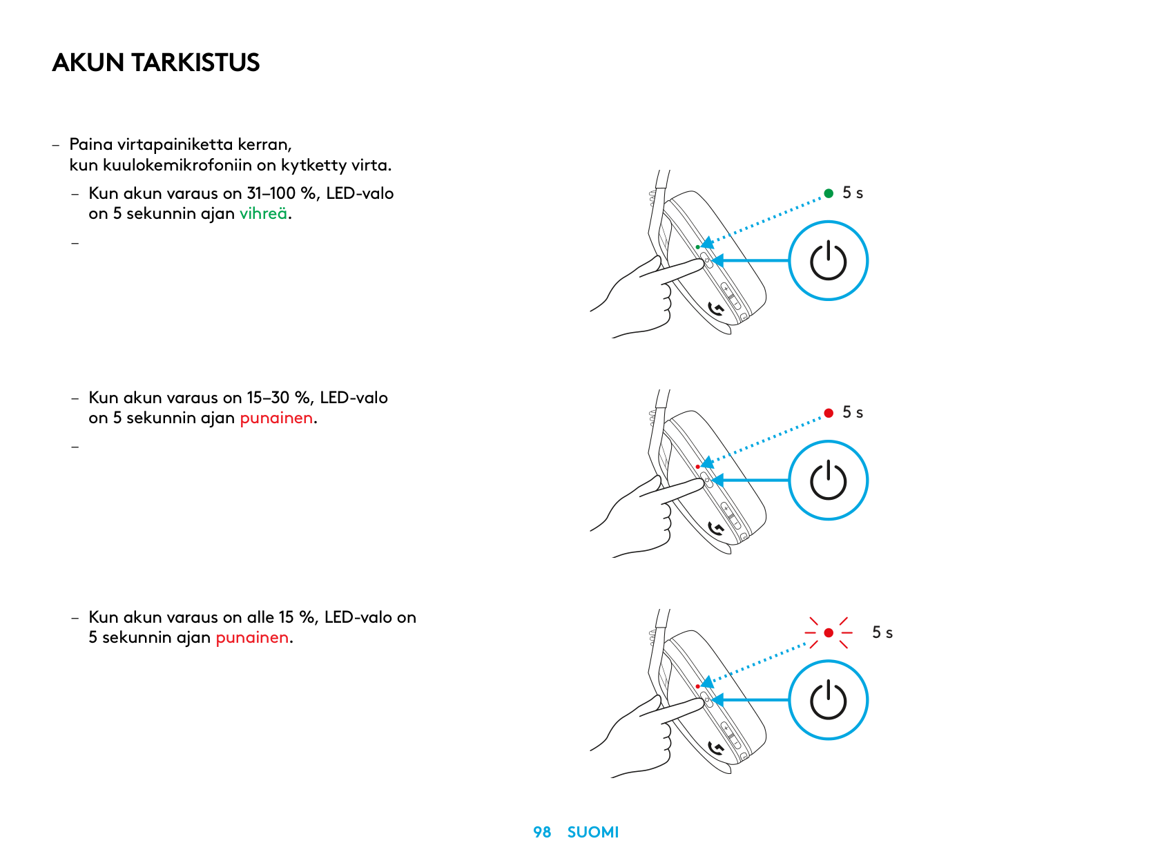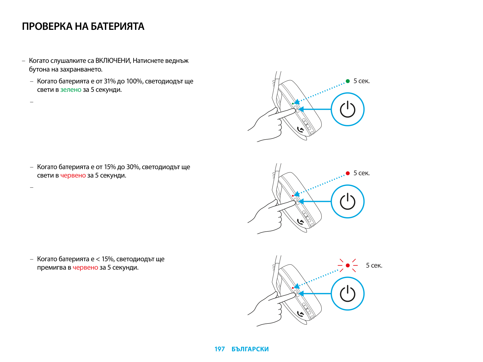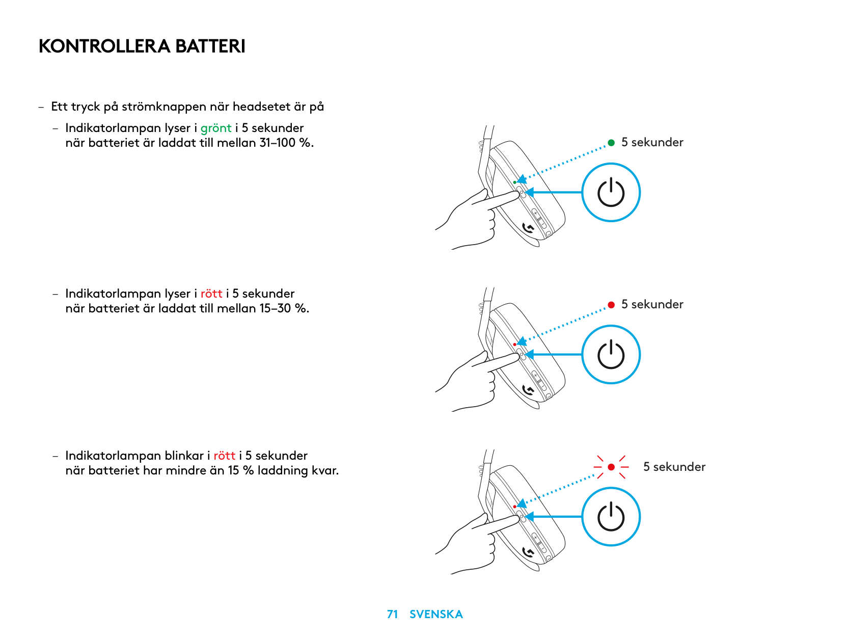 – Single press Power button, when headset is ON – Battery 31% to 100% the LED will show green for 5 seconds.Battery Check