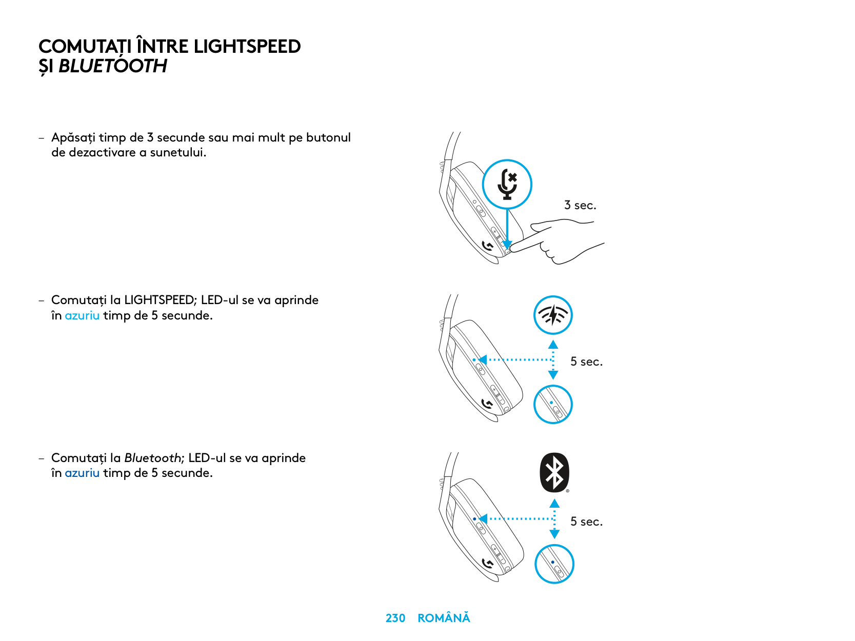 5 sec. 5 sec. – Apăsaţi timp de 3 secunde sau mai mult pe butonul de dezactivare a sunetului. – Comutați la LIGHTSPEED; LED-ul se va aprinde în azuriu timp de 5 secunde. – Comutaţi la Bluetooth; LED-ul se va aprinde în azuriu timp de 5 secunde. 3 sec.Comutaţi Între Lightspeed