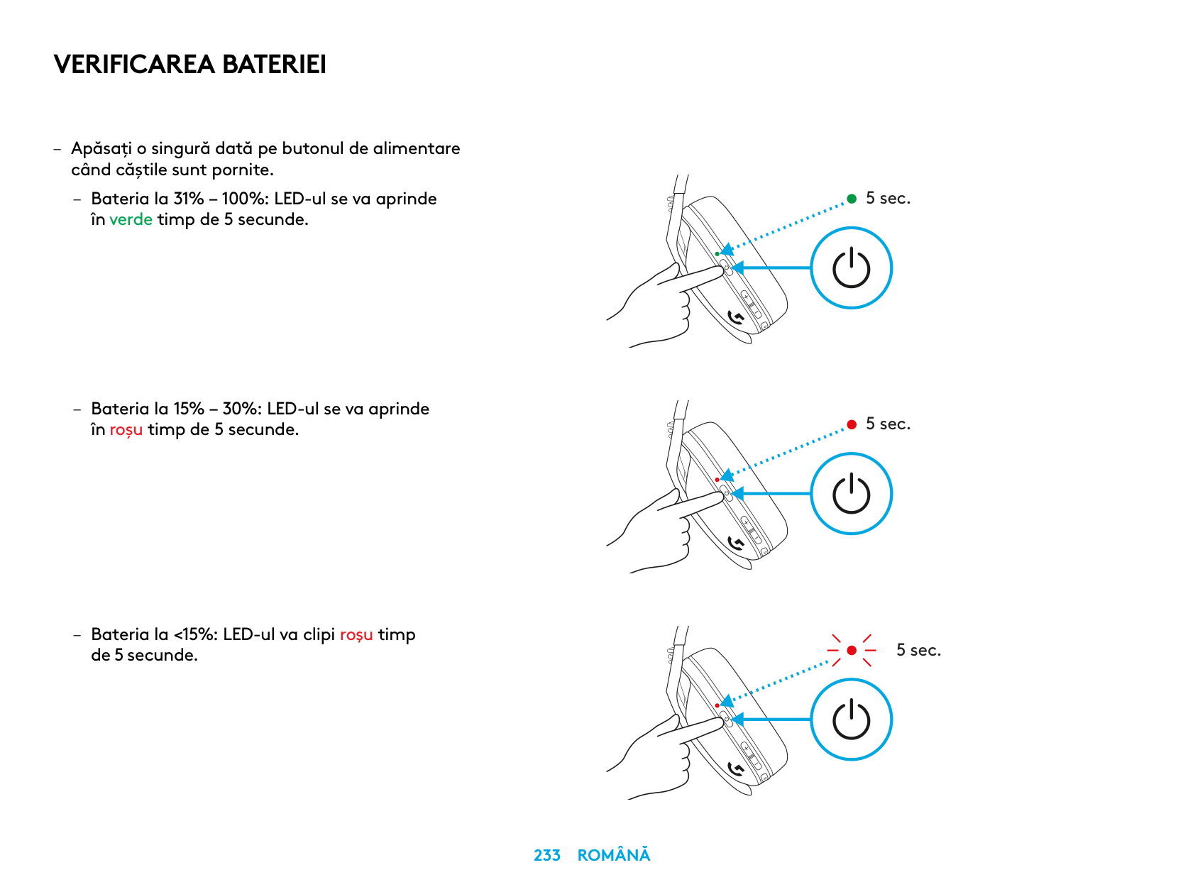 – Bateria la 15% – 30%: LED-ul se va aprinde în roșu timp de 5 secunde. – Bateria la <15%: LED-ul va clipi roşu timp de 5 secunde. 5 sec. 5 sec. 5 sec.234 Română