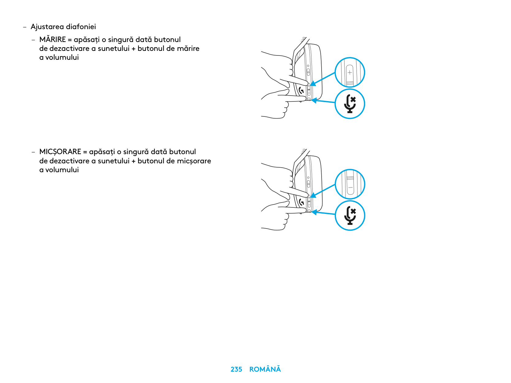 – Ajustarea diafoniei – MĂRIRE = apăsaţi o singură dată butonul de dezactivare a sunetului + butonul de mărire a volumului – MICŞORARE = apăsaţi o singură dată butonul de dezactivare a sunetului + butonul de micșorare a volumului236 Română