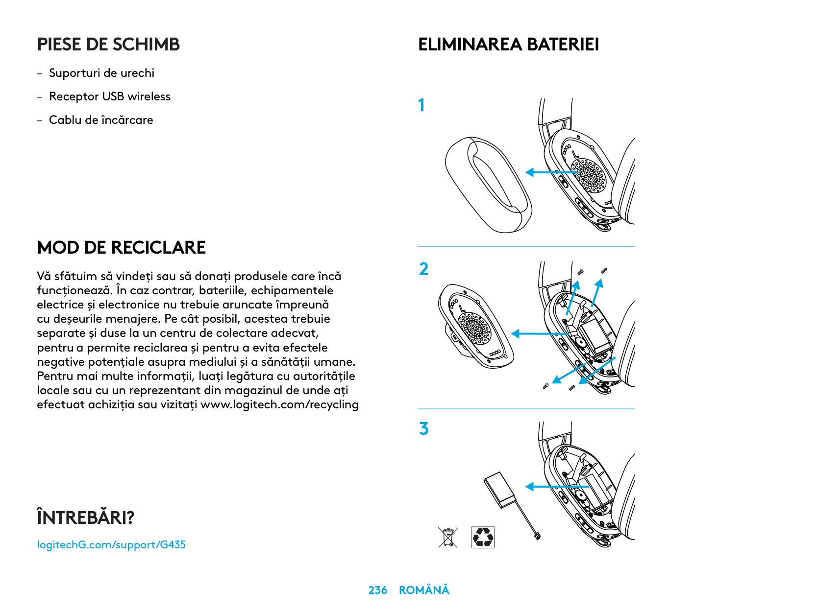 Vă sfătuim să vindeţi sau să donaţi produsele care încă funcţionează. În caz contrar, bateriile, echipamentele electrice şi electronice nu trebuie aruncate împreună cu deşeurile menajere. Pe cât posibil, acestea trebuie separate şi duse la un centru de colectare adecvat, pentru a permite reciclarea şi pentru a evita efectele negative potenţiale asupra mediului şi a sănătăţii umane. Pentru mai multe informaţii, luaţi legătura cu autorităţile locale sau cu un reprezentant din magazinul de unde aţi efectuat achiziţia sau vizitaţi www.logitech.com/recyclingPiese De Schimb
