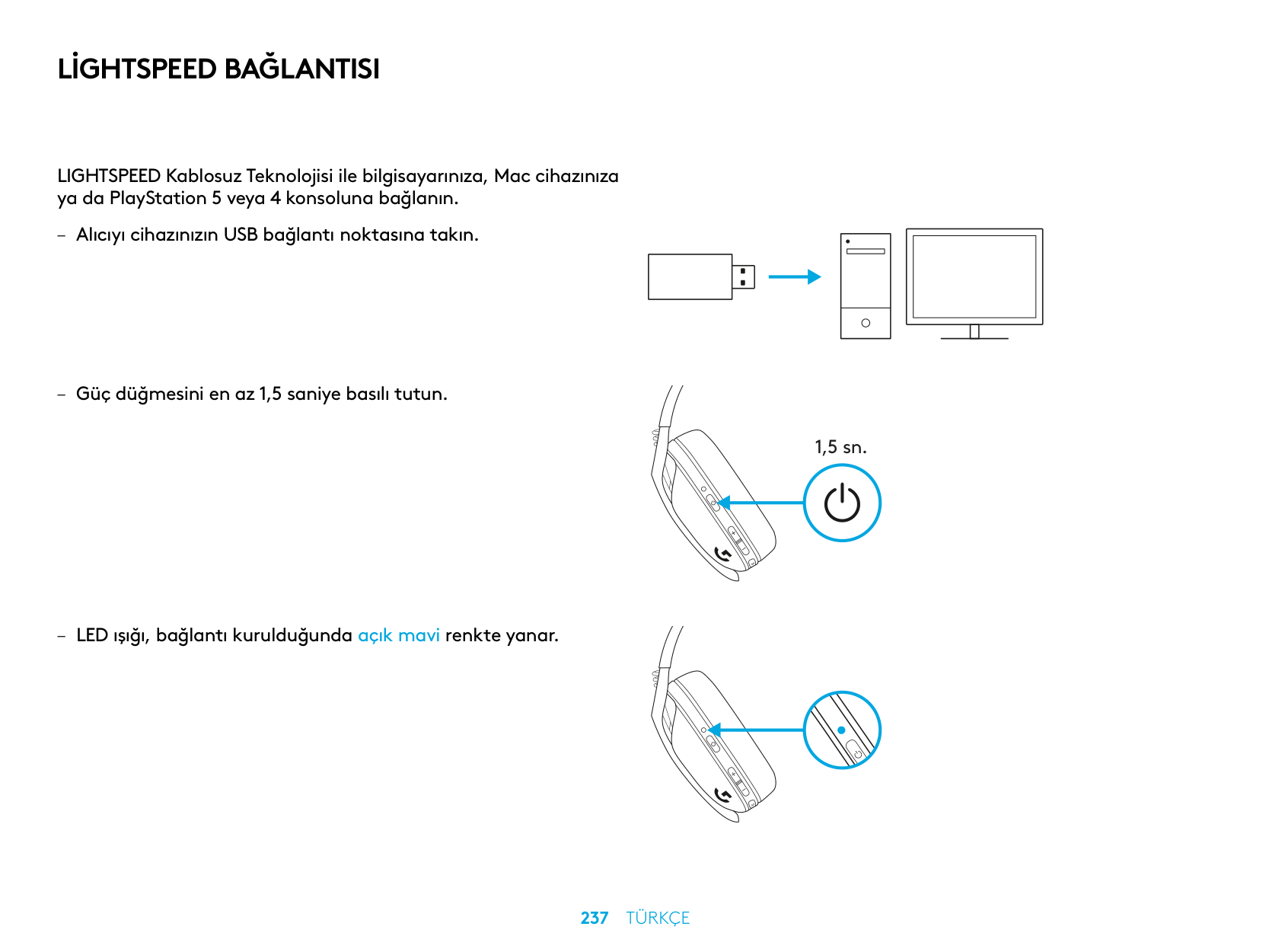LIGHTSPEED Kablosuz Teknolojisi ile bilgisayarınıza, Mac cihazınıza ya da PlayStation 5 veya 4 konsoluna bağlanın. – Alıcıyı cihazınızın USB bağlantı noktasına takın. – Güç düğmesini en az 1,5 saniye basılı tutun. – LED ışığı, bağlantı kurulduğunda açık mavi renkte yanar. 1,5 sn.238 TüRkçe
