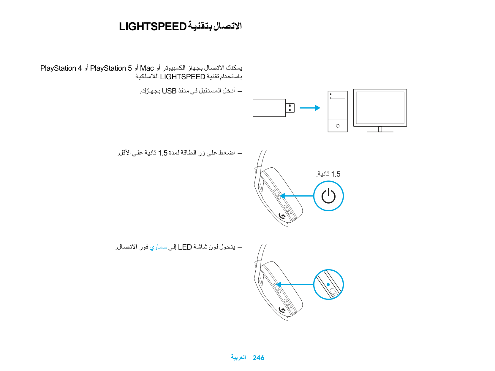 .ٍ ثوان5 السماوي لمدة – األزرق باللونLED ، وسيضيء مصباحBluetooth بدِّل إلى تقنية .ٍ ثوان5 لمدة .ٍ ثوان3وتقنيةLightspeed التبديل بين تقنية