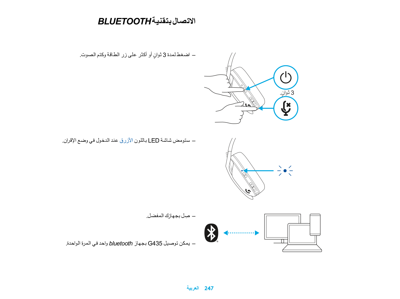 .ٍ ثوان3 – .صِ ل بجهازك المفضل – . واحد في المرة الواحدةbluetooth بجهازG435 يمكن توصيلالعربية 248 .ٍ ثوان5 .ٍ ثوان5 – . ثوانٍ أو أكثر على زر كتم الصوت3 اضغط لمدة –