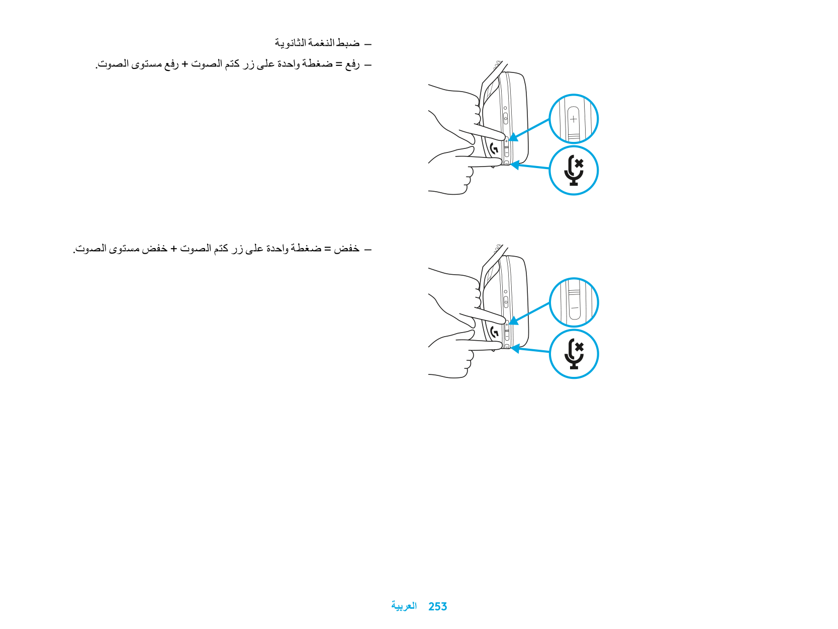 العربية 253 – ضبط النغمة الثانوية – . رفع مستوى الصوت+ رفع = ضغطة واحدة على زر كتم الصوت – . خفض مستوى الصوت+ خفض = ضغطة واحدة على زر كتم الصوت