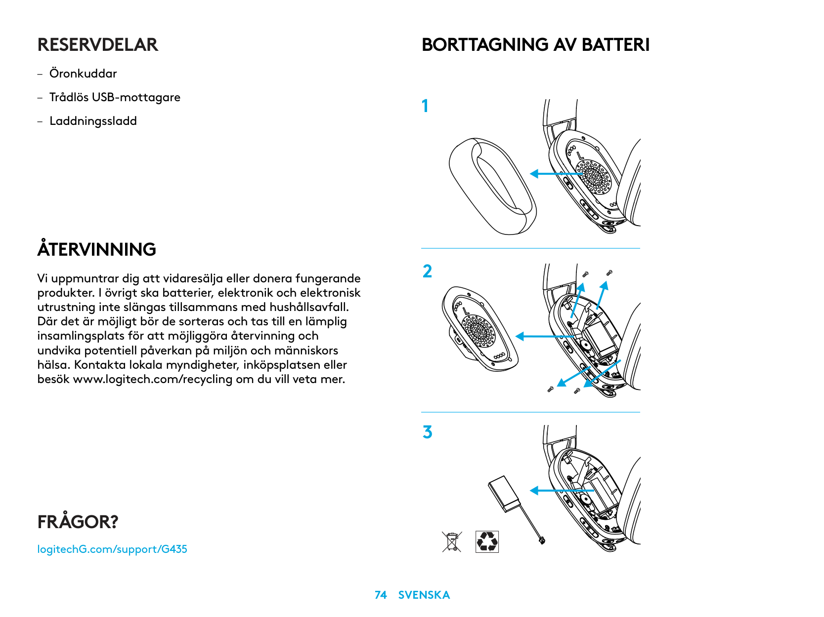 We encourage you to resell or donate working products. Otherwise, batteries, electronic and electrical equipment should not be disposed of with household waste. Wherever possible, they should be segregated and brought to an appropriate collection point to enable recycling and avoid potential impacts on the environment and human health. For more information, contact your local authorities or place of purchase, or visit www.logitech.com/recyclingSpare Parts