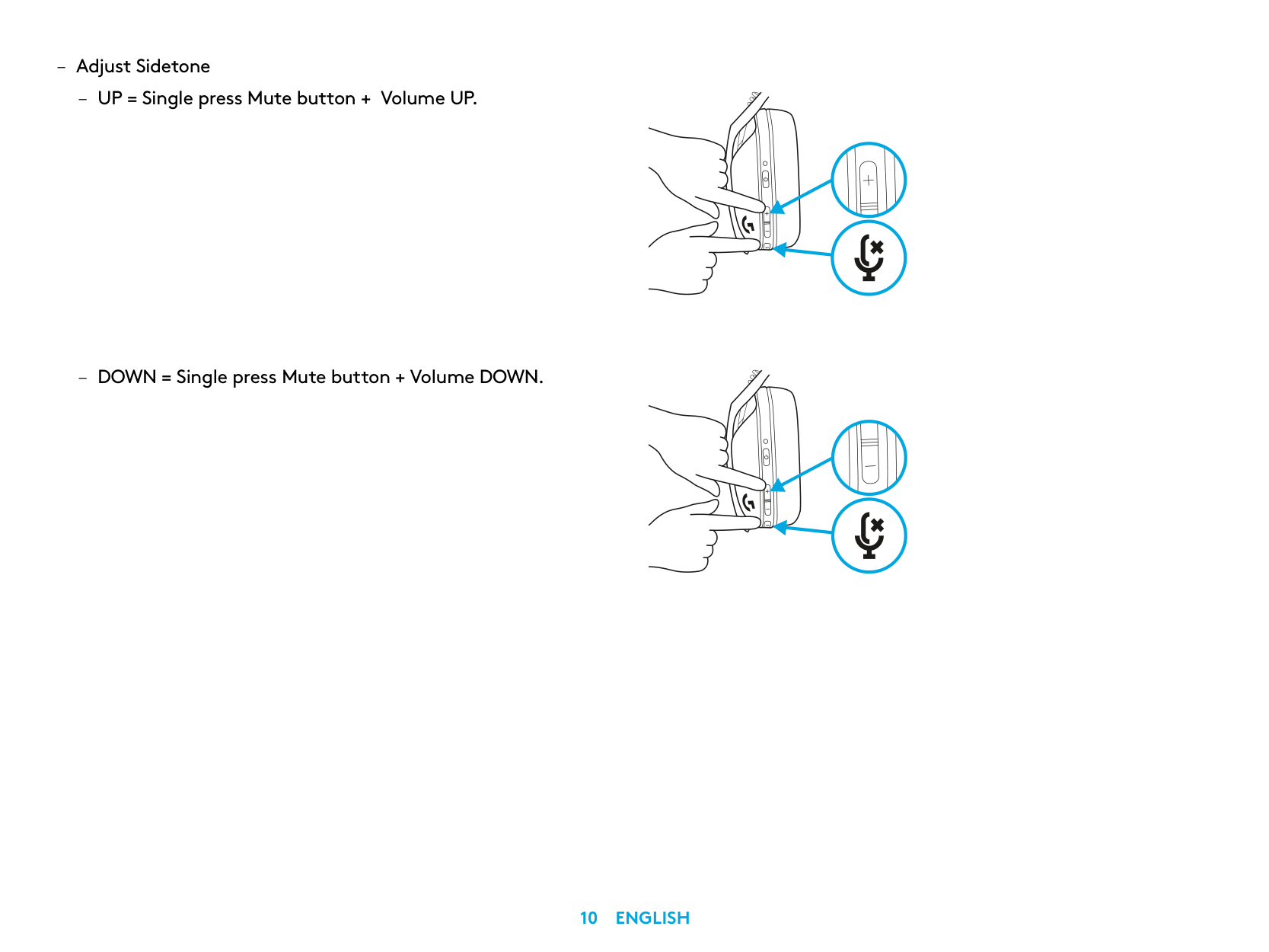 – Adjust Sidetone – UP = Single press Mute button + Volume UP. – DOWN = Single press Mute button + Volume DOWN.11 English