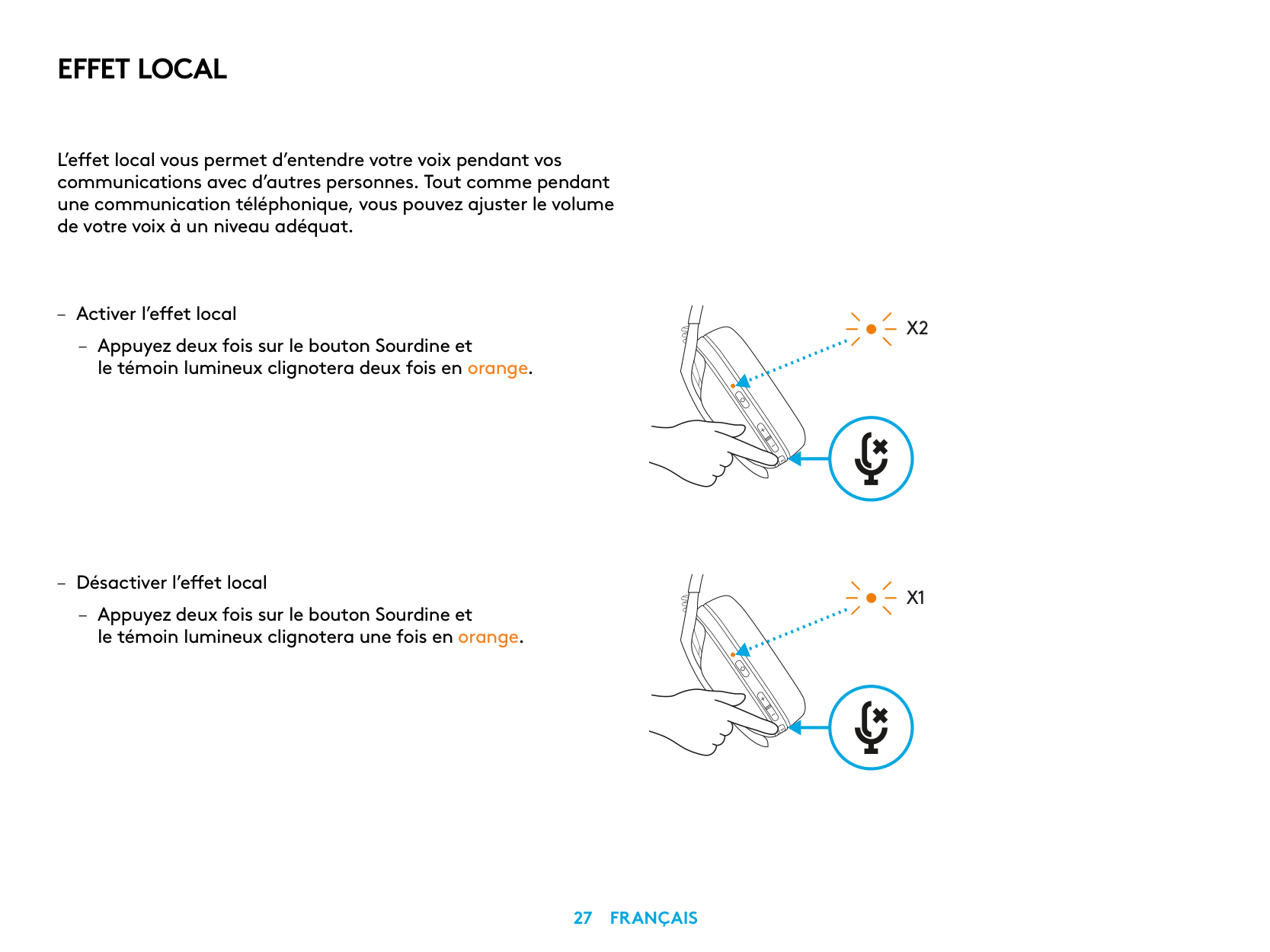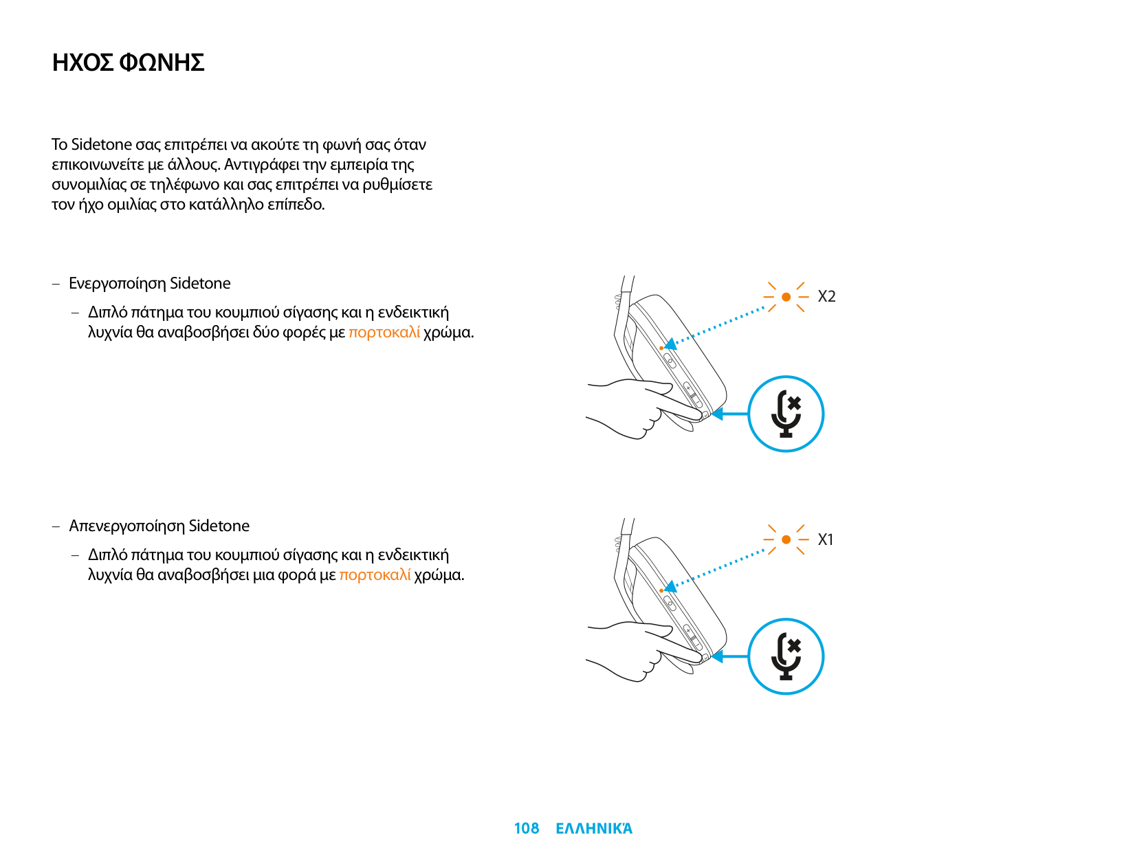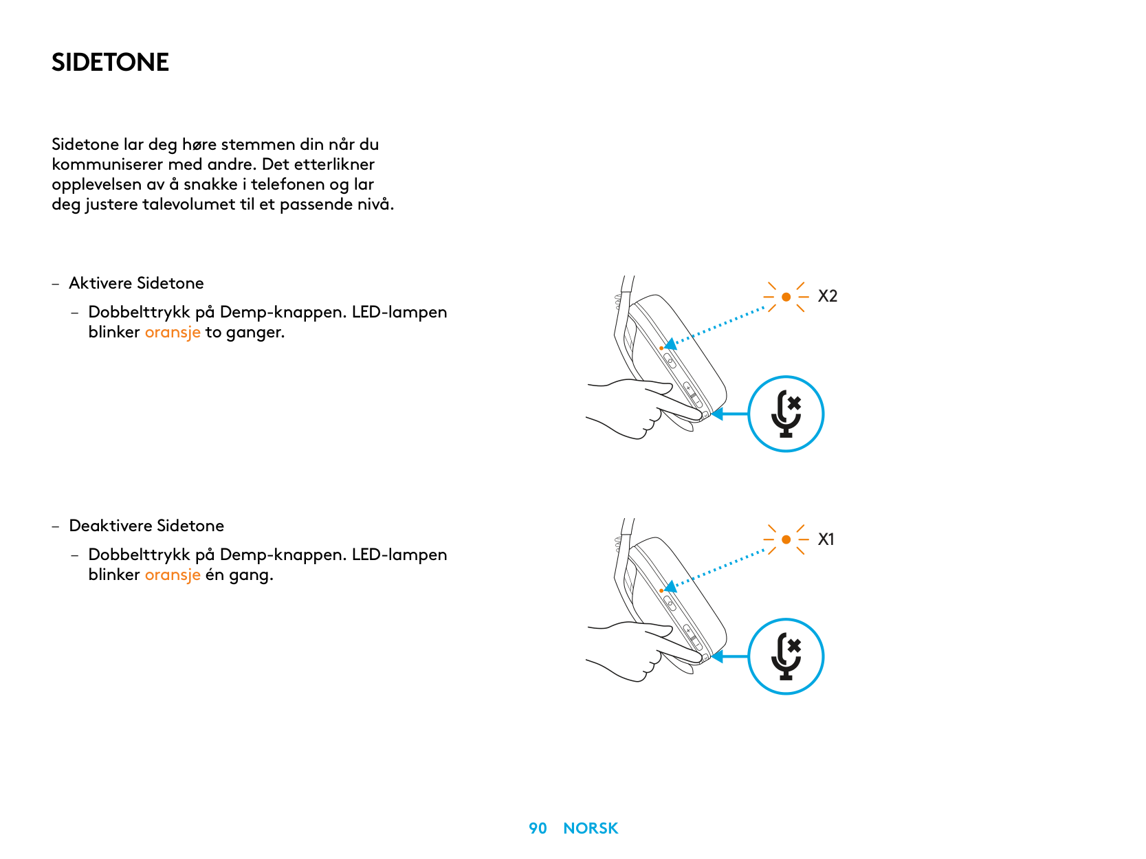 – Disable Sidetone – Double press the Mute button and the LED will flash once in orange.X2
