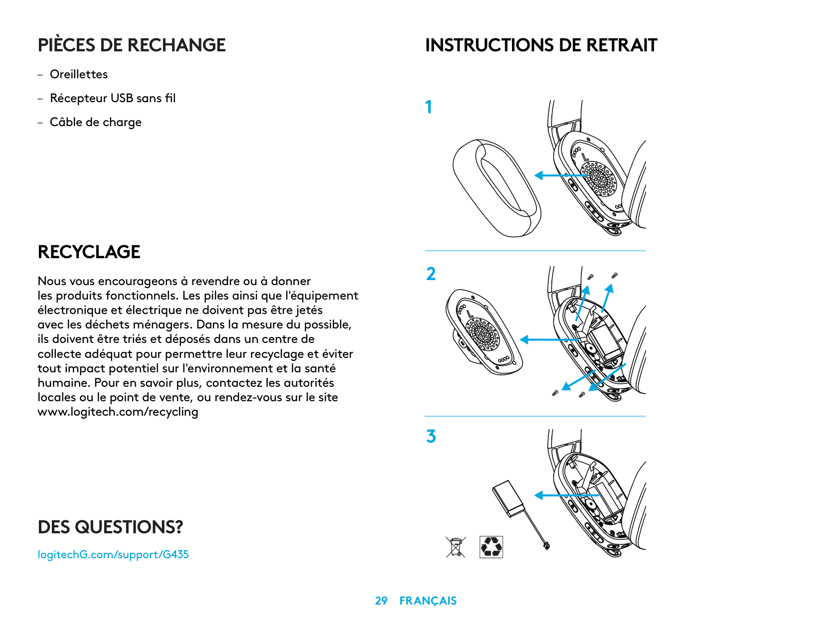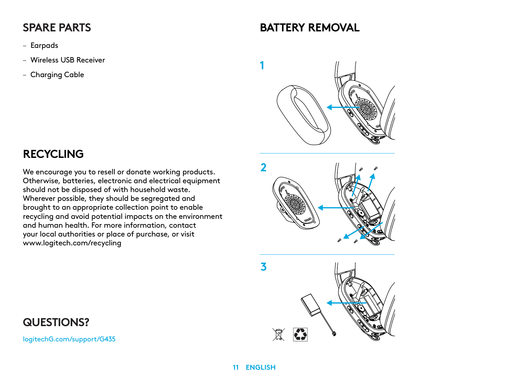We encourage you to resell or donate working products. Otherwise, batteries, electronic and electrical equipment should not be disposed of with household waste. Wherever possible, they should be segregated and brought to an appropriate collection point to enable recycling and avoid potential impacts on the environment and human health. For more information, contact your local authorities or place of purchase, or visit www.logitech.com/recyclingSpare Parts