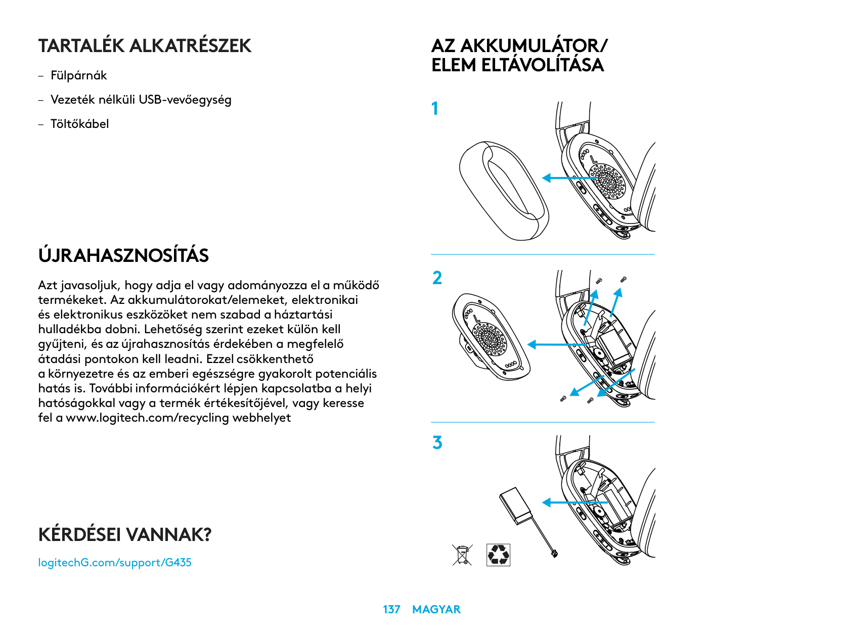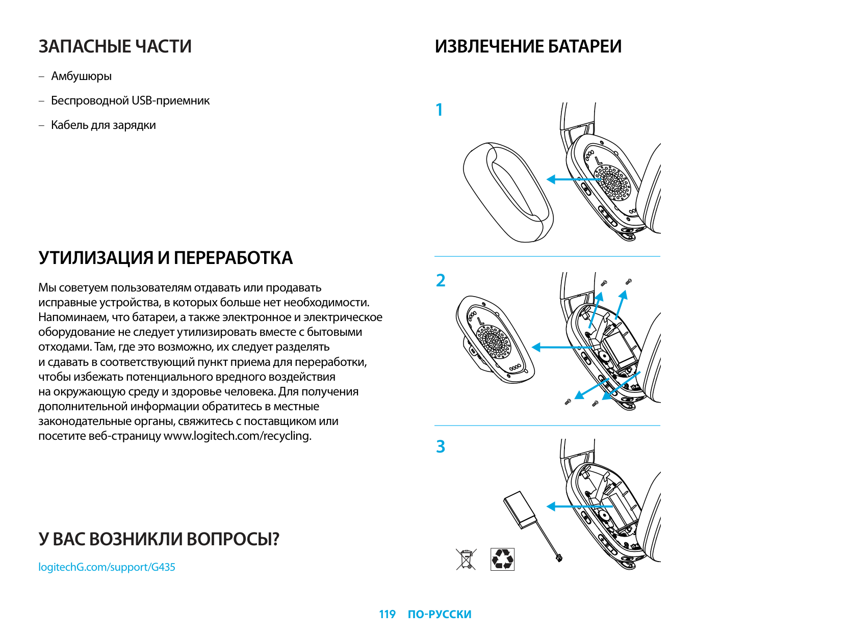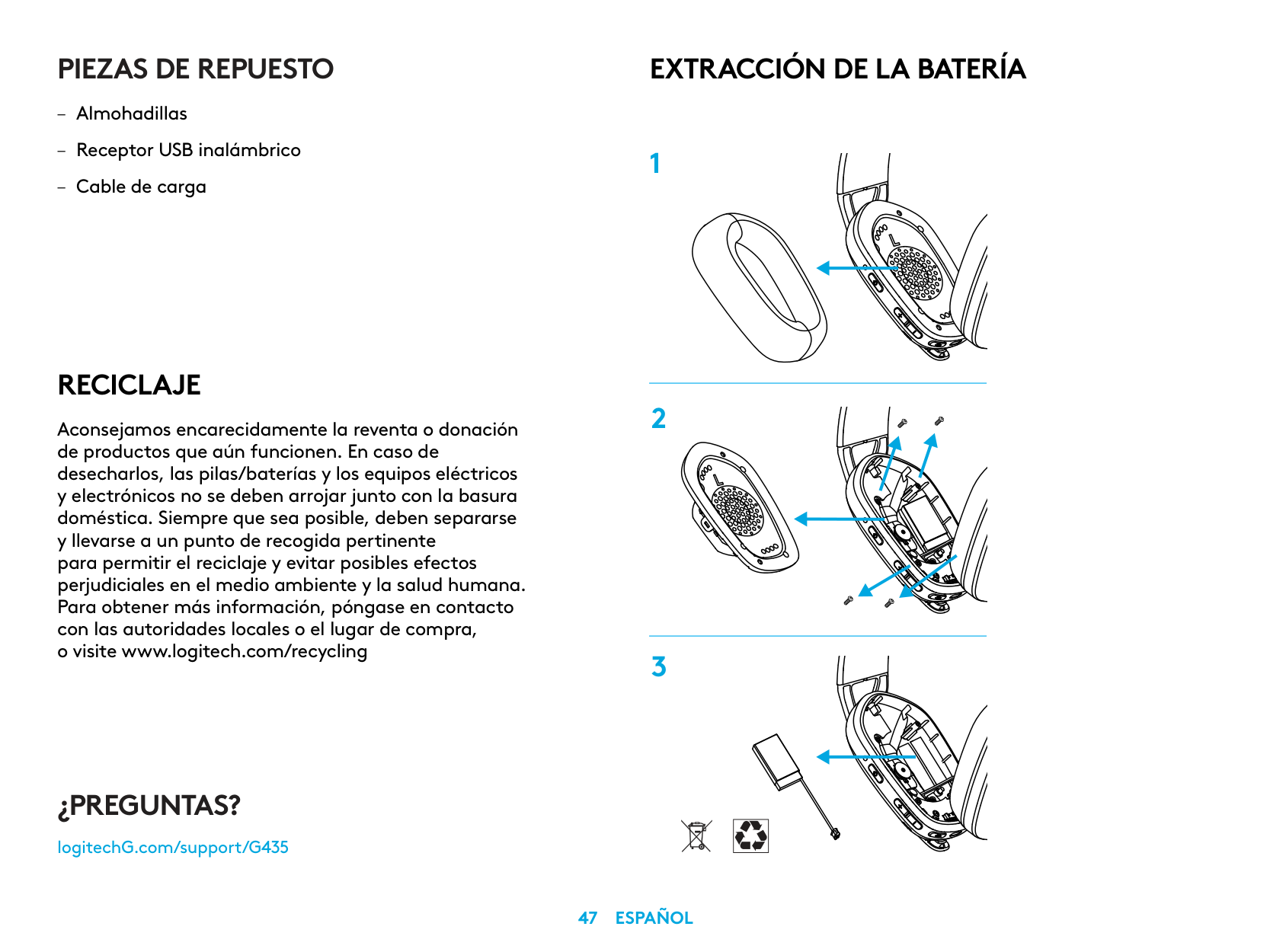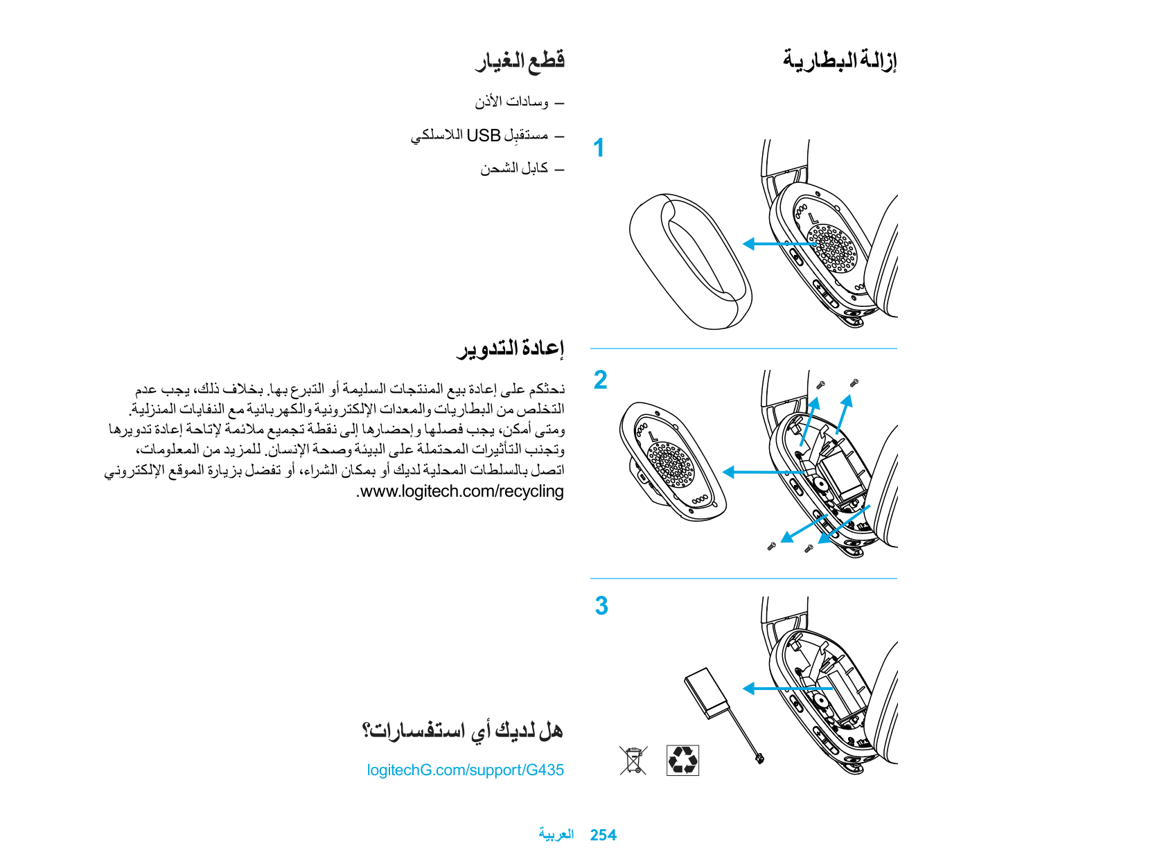 – كابل الشحن إزالة البطارية 1 2 3 هل لديك أي استفسارات؟ logitechG.com/support/G435עברית 255