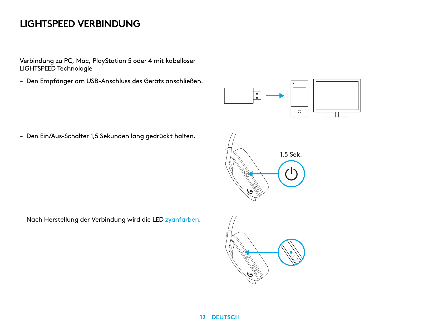 Verbindung zu PC, Mac, PlayStation 5 oder 4 mit kabelloser LIGHTSPEED Technologie – Den Empfänger am USB-Anschluss des Geräts anschließen. – Den Ein/Aus-Schalter 1,5 Sekunden lang gedrückt halten. – Nach Herstellung der Verbindung wird die LED zyanfarben. 1,5 Sek.13 Deutsch