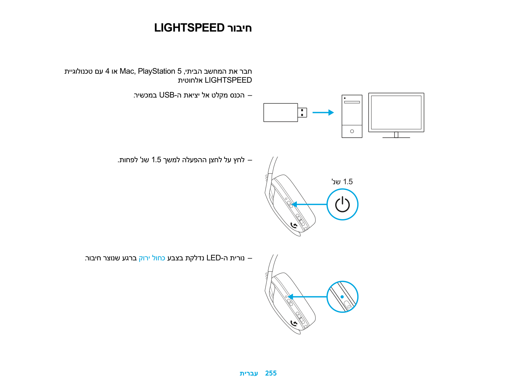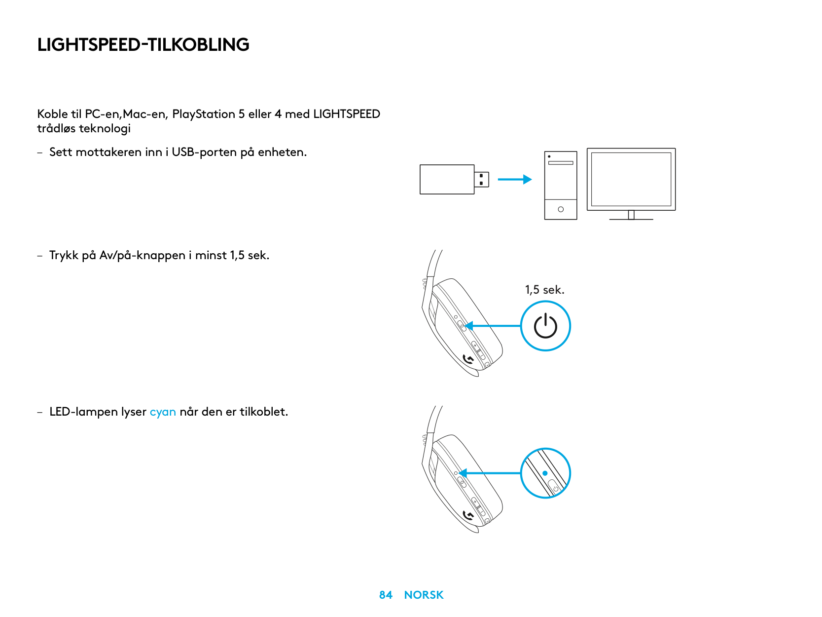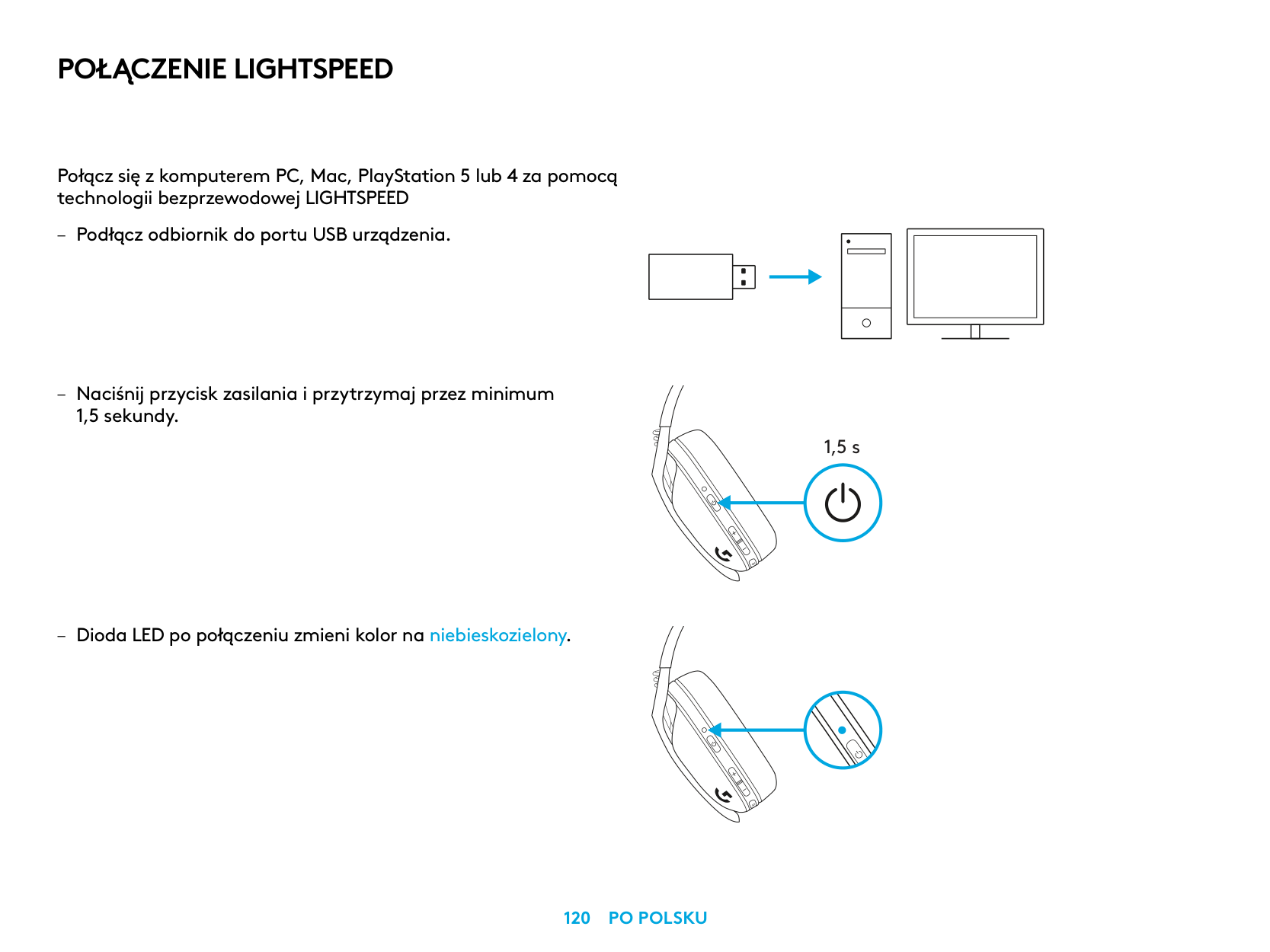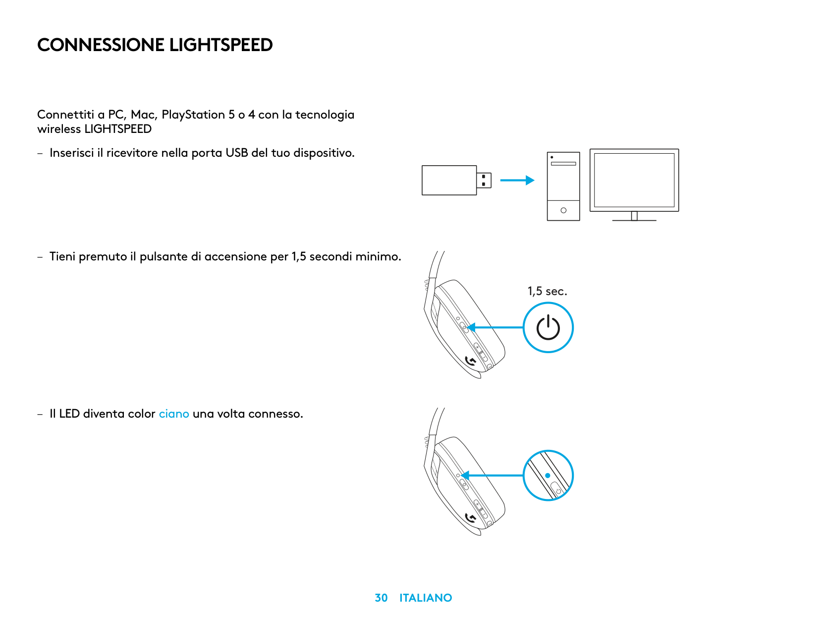 Connect to your PC, Mac, PlayStation 5 or 4 with LIGHTSPEED Wireless Technology – Insert receiver into the USB port of your device. – Press the Power button for minimum 1.5 sec. – The LED turns cyan once connected. 1.5 sec.4 English
