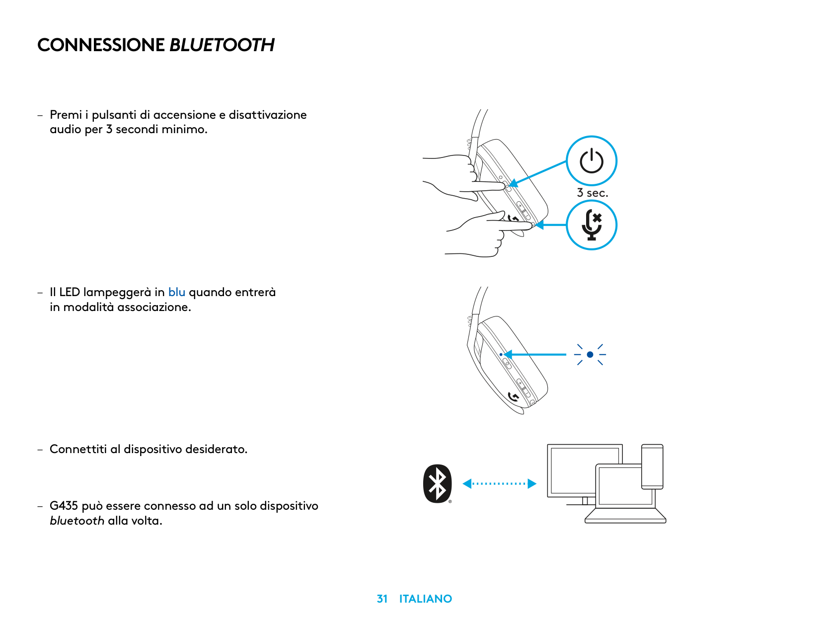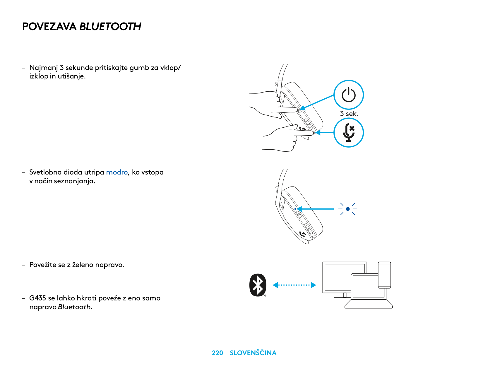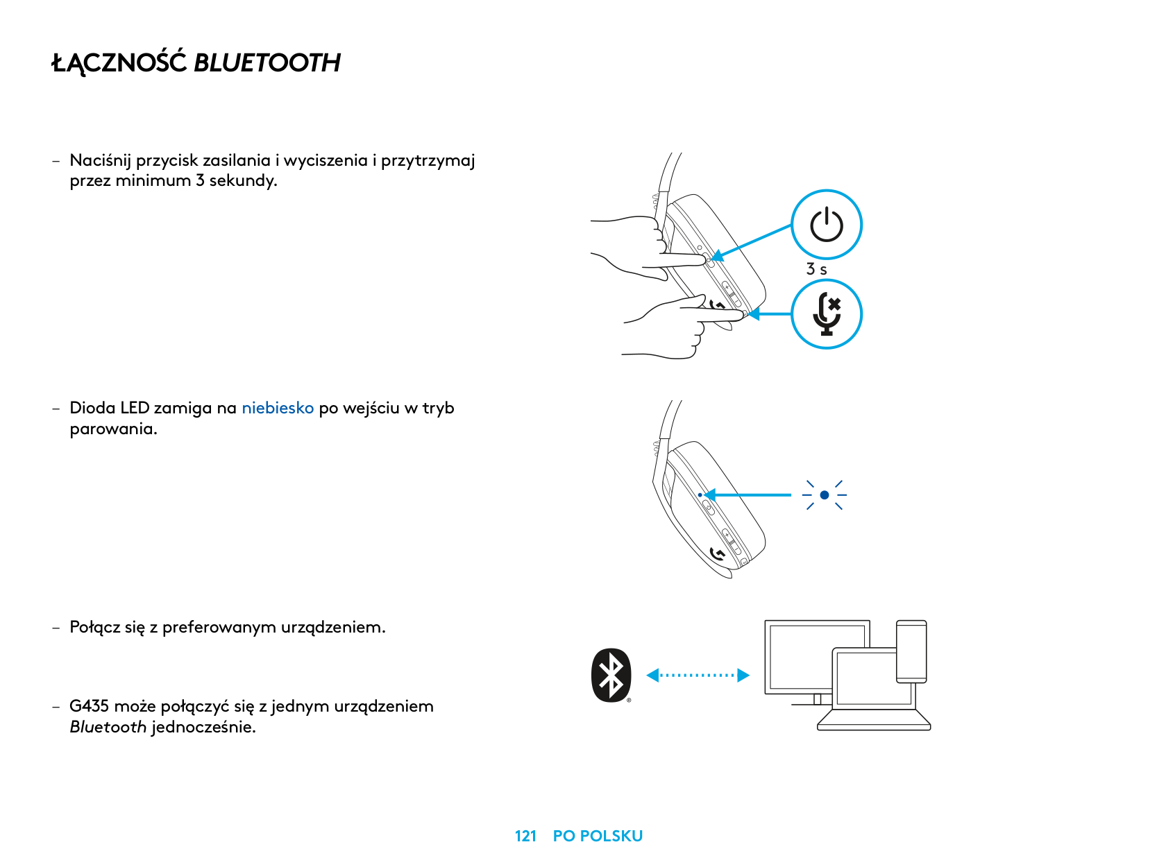Press and hold the Power button and Mute button together for 3 seconds or longer. The LED will flash blue as it enters pairing mode. Then connect to your preferred device. Note that G435 can only connect to a single Bluetooth device at a time. (Page 4)