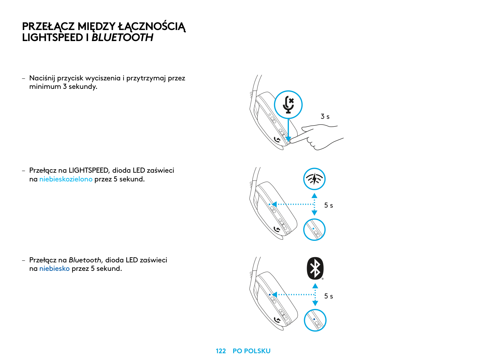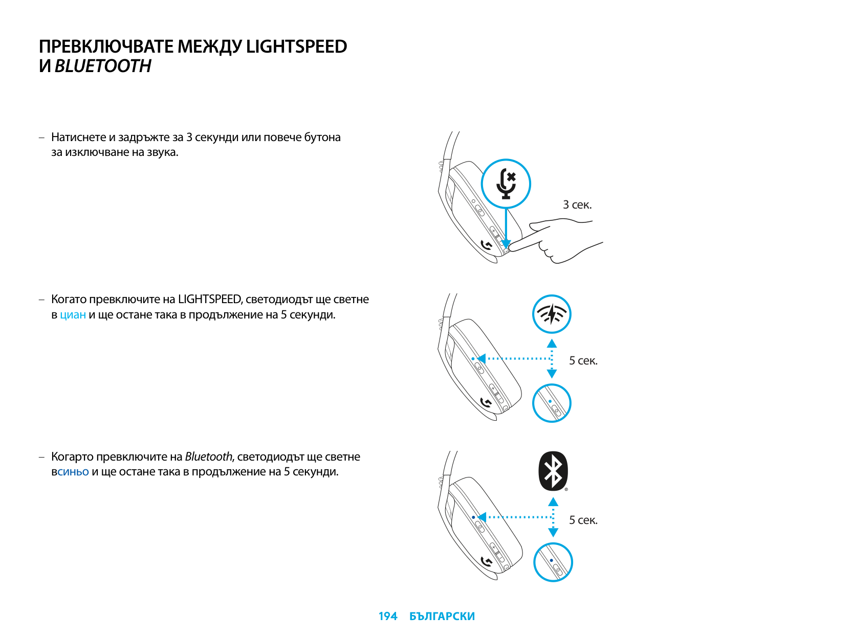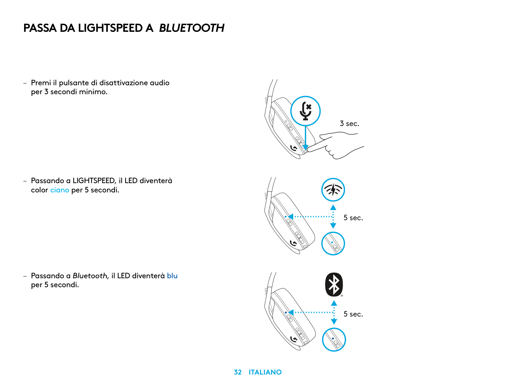 5 sec. 5 sec. – Press 3 seconds or longer of the Mute button. – Switch to LIGHTSPEED, LED will light cyan for 5 seconds. – Switch to Bluetooth, LED will light blue for 5 seconds. 3 sec.Switch Between Lightspeed