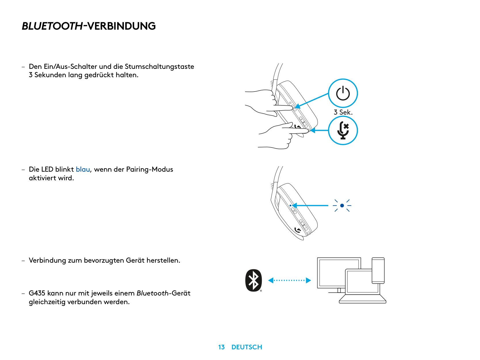 – Den Ein/Aus-Schalter und die Stumschaltungstaste 3 Sekunden lang gedrückt halten. – Die LED blinkt blau, wenn der Pairing-Modus aktiviert wird. 3 Sek. – Verbindung zum bevorzugten Gerät herstellen. – G435 kann nur mit jeweils einem Bluetooth-Gerät gleichzeitig verbunden werden.14 Deutsch
