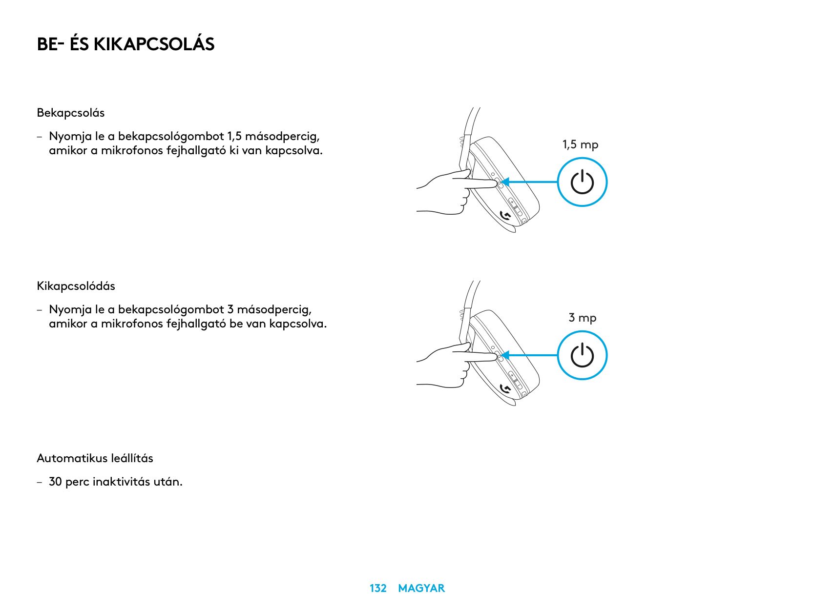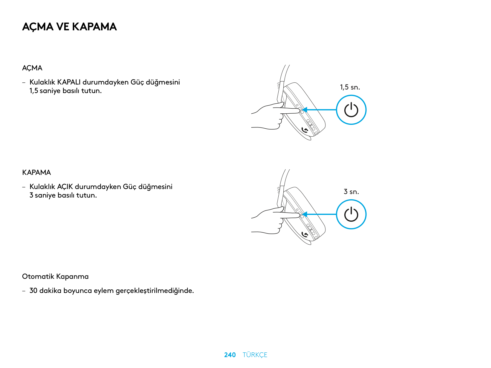 – Kulaklık AÇIK durumdayken Güç düğmesini 3 saniye basılı tutun. Otomatik Kapanma – 30 dakika boyunca eylem gerçekleştirilmediğinde. 1,5 sn. 3 sn.Açma Ve Kapama